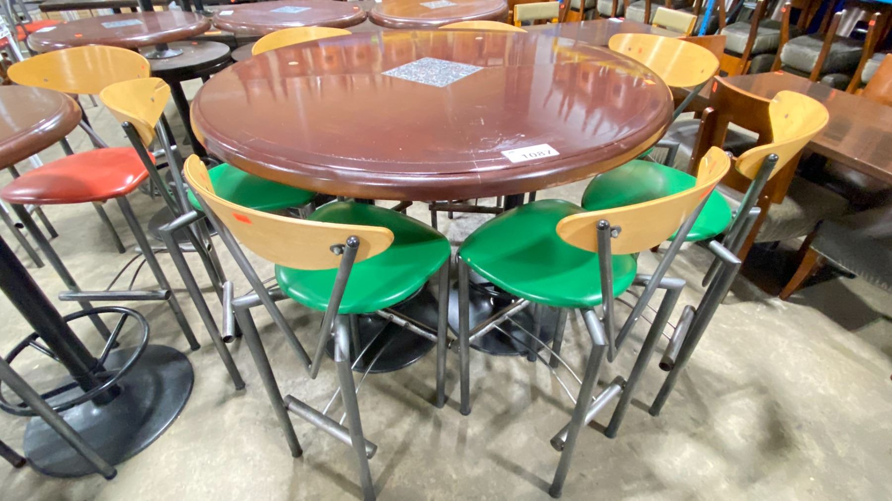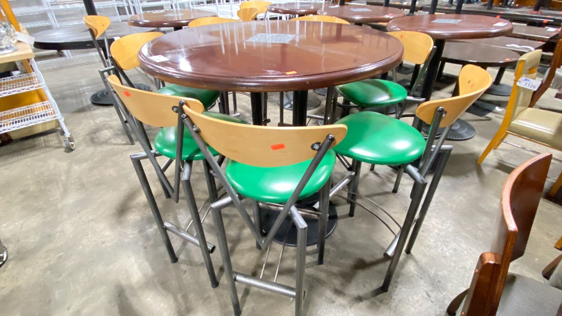 DARK WOOD 53"W X 43"H BLACK METAL BASE ROUND COMMERCIAL BAR HEIGHT RESTAURANT TABLE WITH 7 GREEN BAR CHAIRS