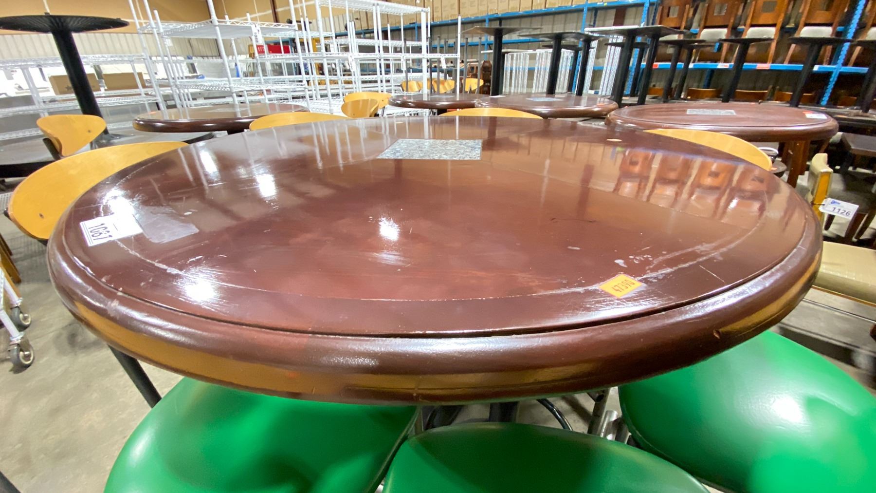 DARK WOOD 53"W X 43"H BLACK METAL BASE ROUND COMMERCIAL BAR HEIGHT RESTAURANT TABLE WITH 7 GREEN