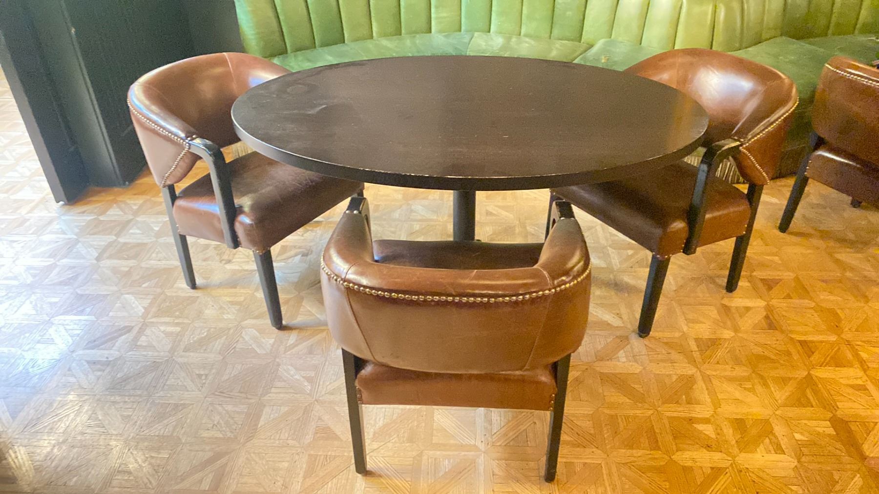 DARK WOOD 54 W X 36  OVAL TABLE WITH 3 DARK WOOD BROWN LEATHER STUDDED ARM CHAIRS