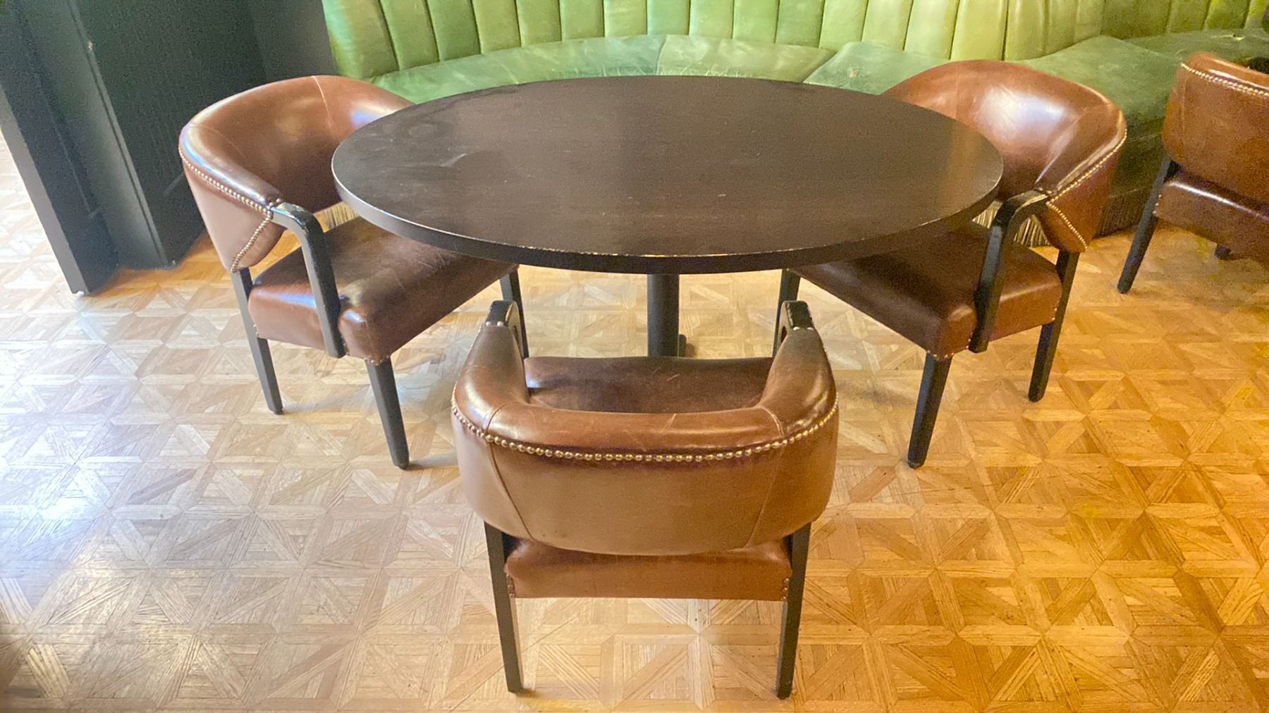DARK WOOD 54 W X 36  OVAL TABLE WITH 3 DARK WOOD BROWN LEATHER STUDDED ARM CHAIRS