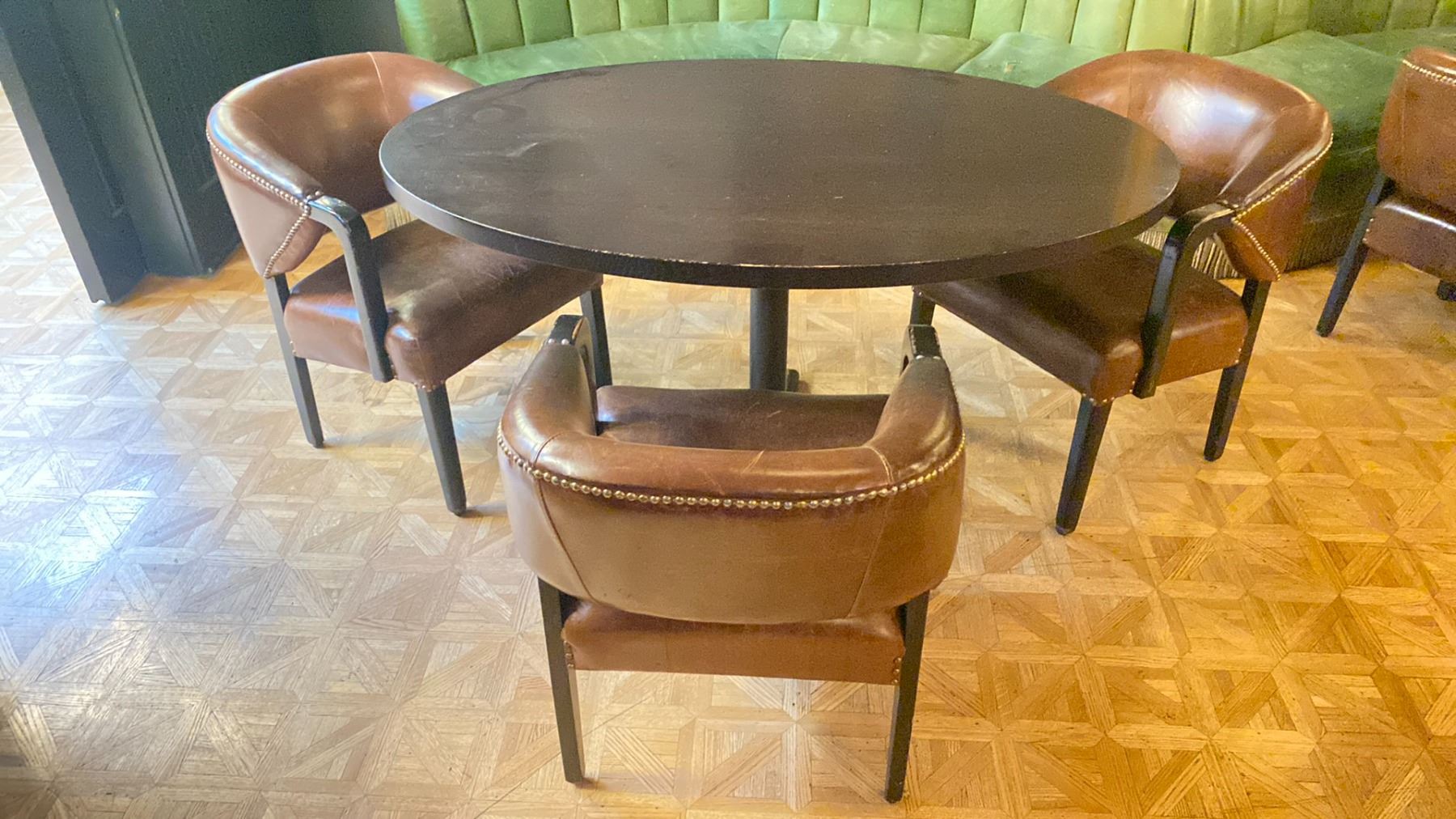 DARK WOOD 54"W X 36" OVAL TABLE WITH 3 DARK WOOD BROWN LEATHER STUDDED ARM CHAIRS