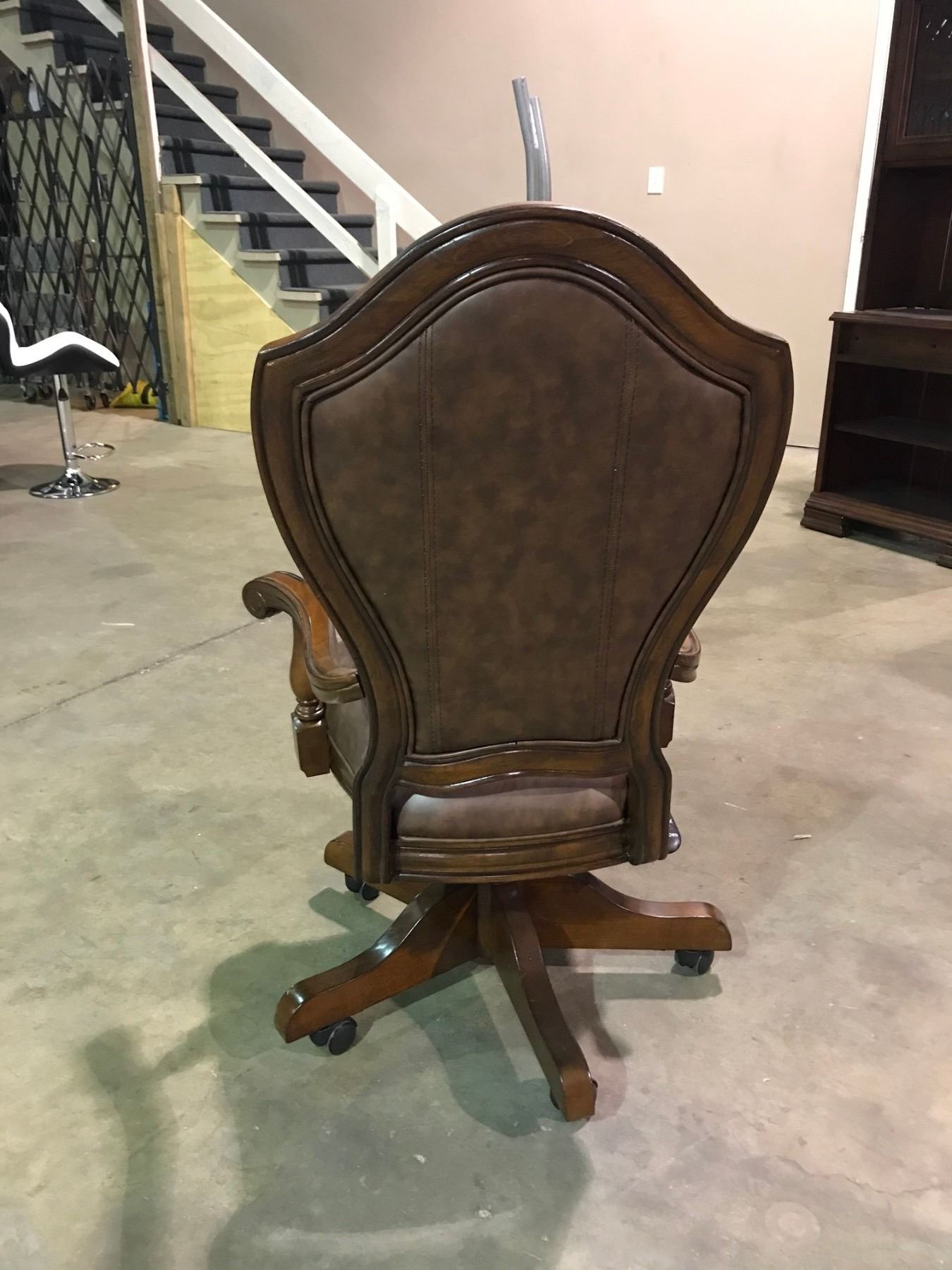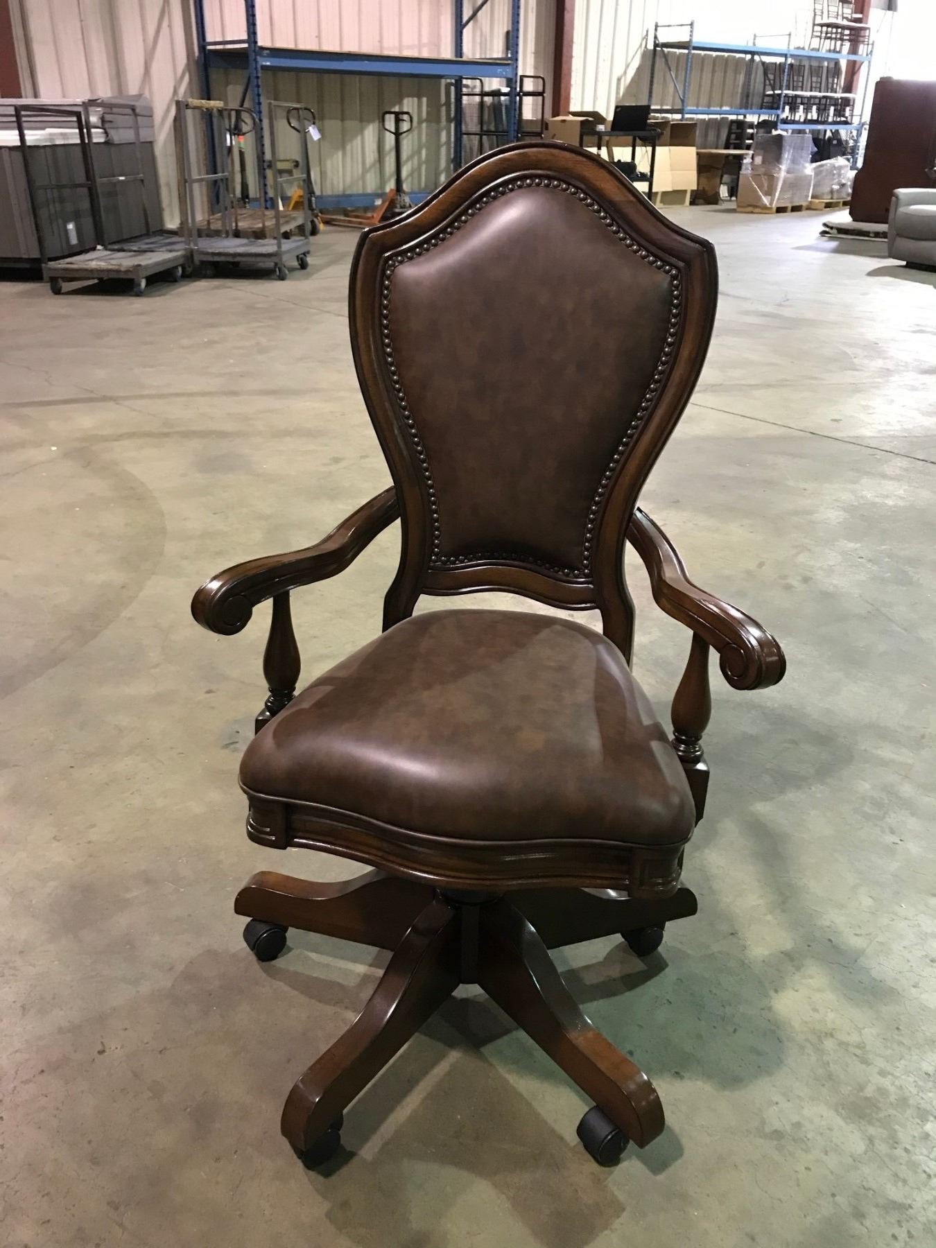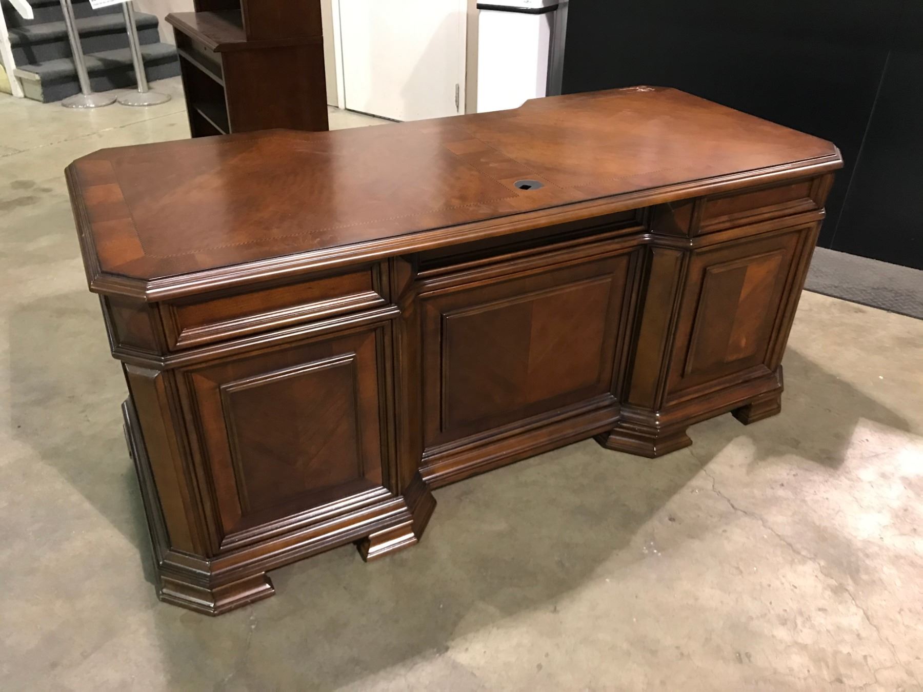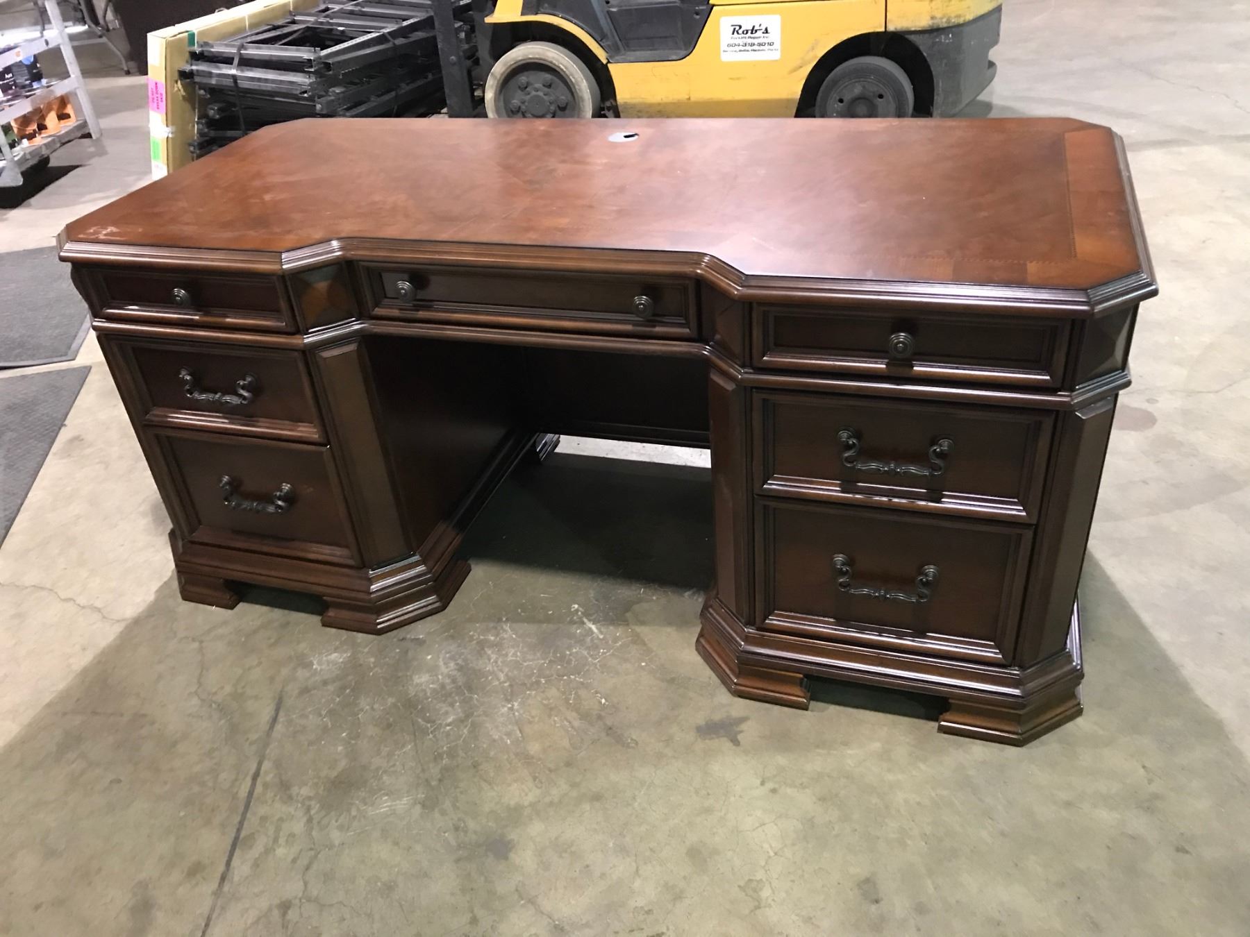 DARK WOOD 7 DRAWER EXECUTIVE INLAID DESK WITH LEATHER WOOD FRAMED MOBILE OFFICE CHAIR DIMENSIONS: 32'D X 72"W X 31 1/2"H