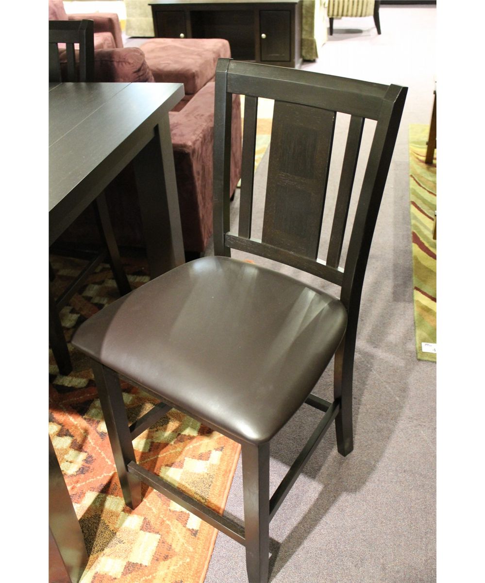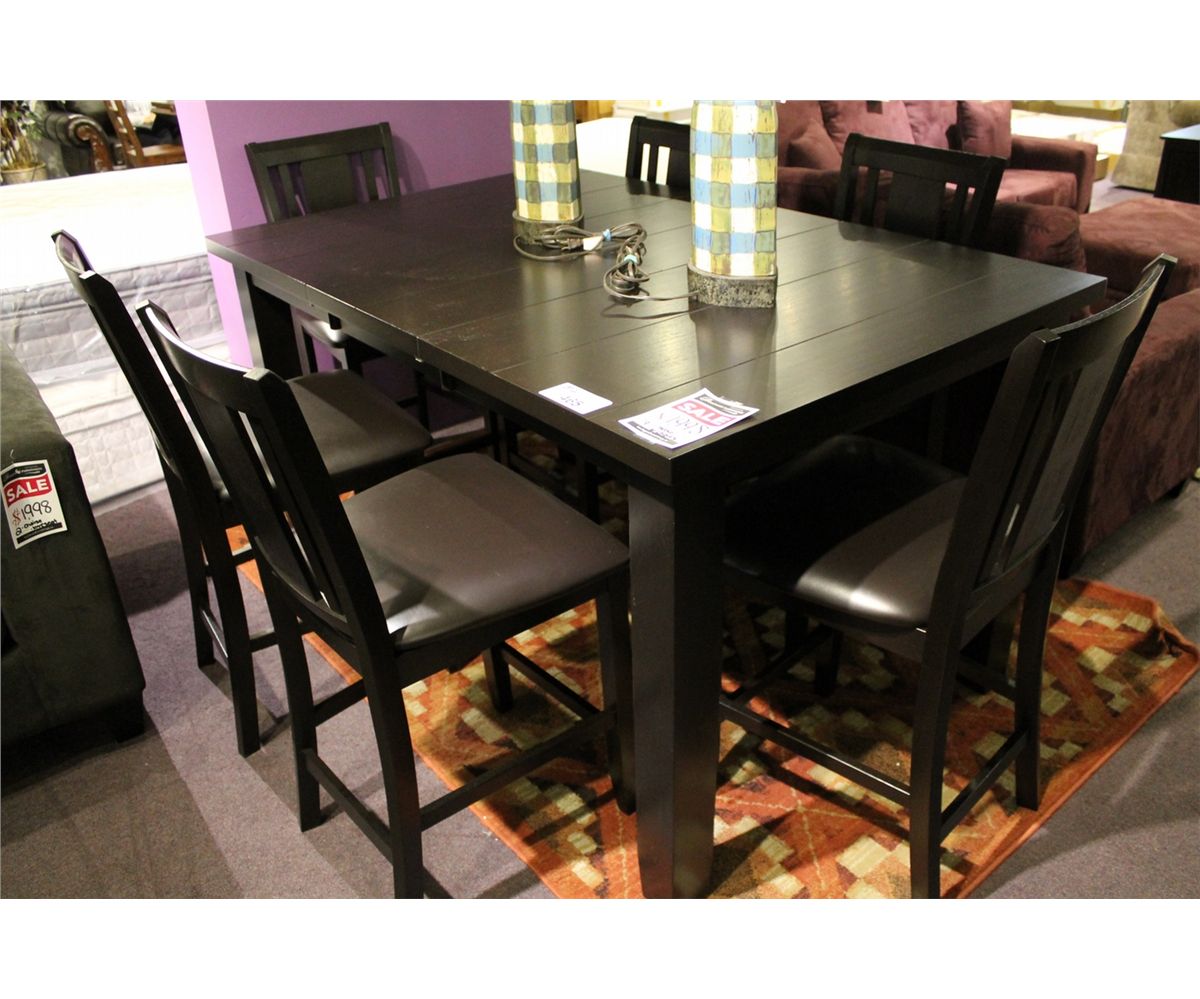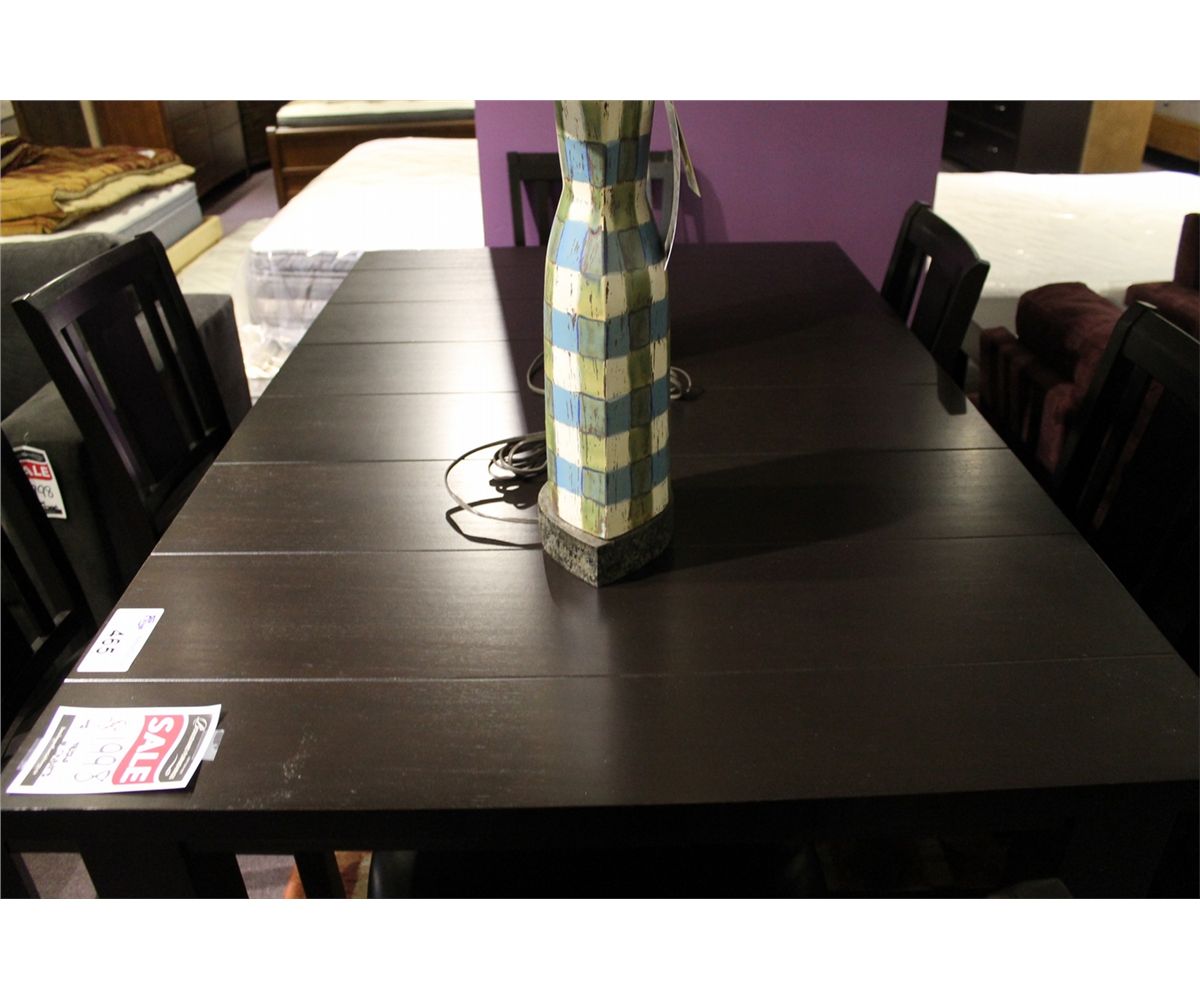 DARK WOOD BAR HEIGHT DINING TABLE WITH 6 LEATHER SEAT STOOLS