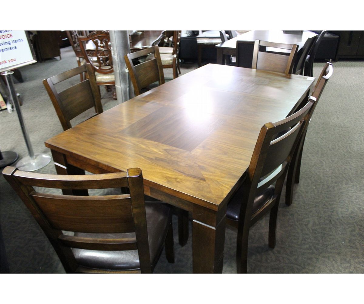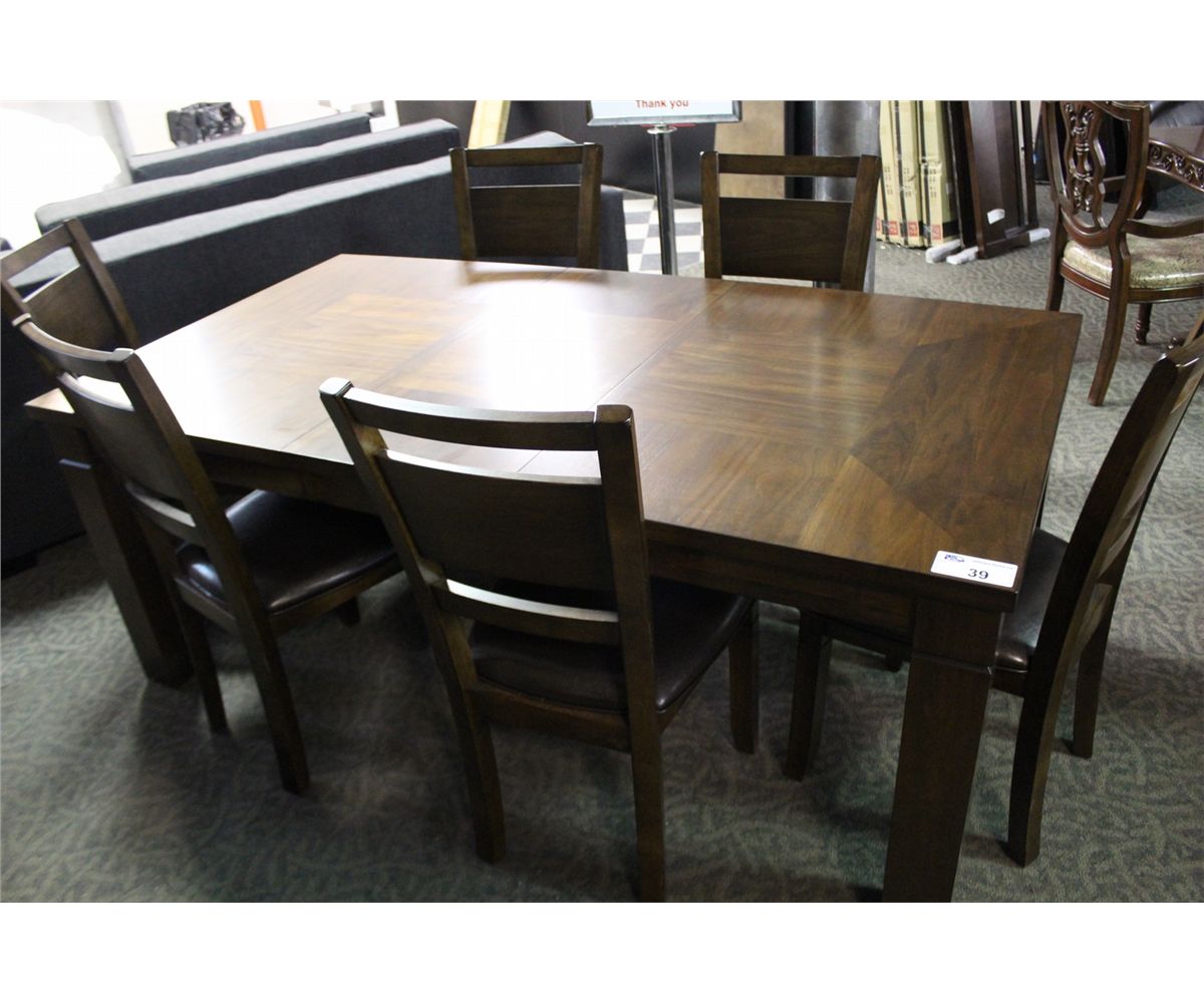 DARK WOOD DINING ROOM TABLE WITH LEAF AND 6 CHAIRS