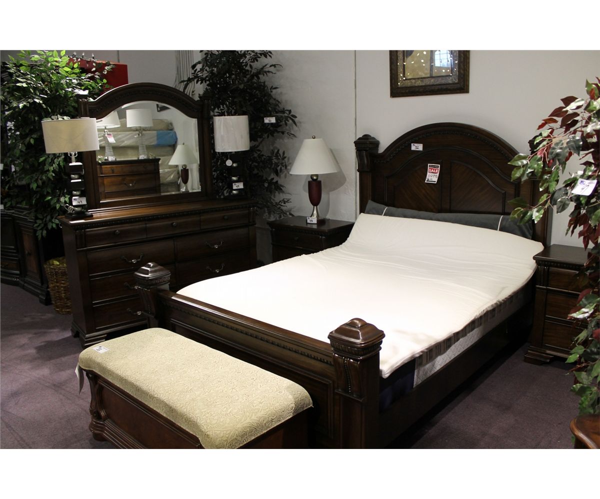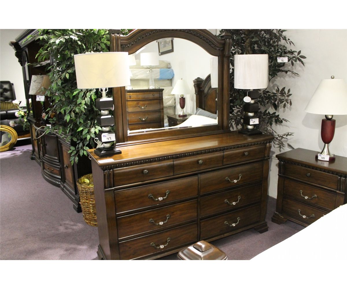 DARK WOOD FORMAL 7 PIECE BEDROOM SUITE WITH QUEEN SIZE HEADBOARD, FOOTBOARD, 2 NIGHT STANDS, 2 DRESSERS & MIRROR