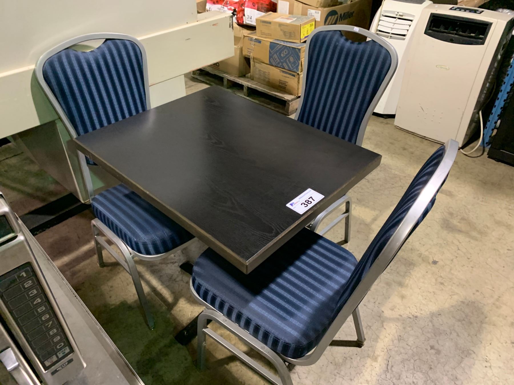DARK WOOD TOP 24" X 30" CAFE TABLE WITH 3 METAL FRAMED STACKING CAFE CHAIRS