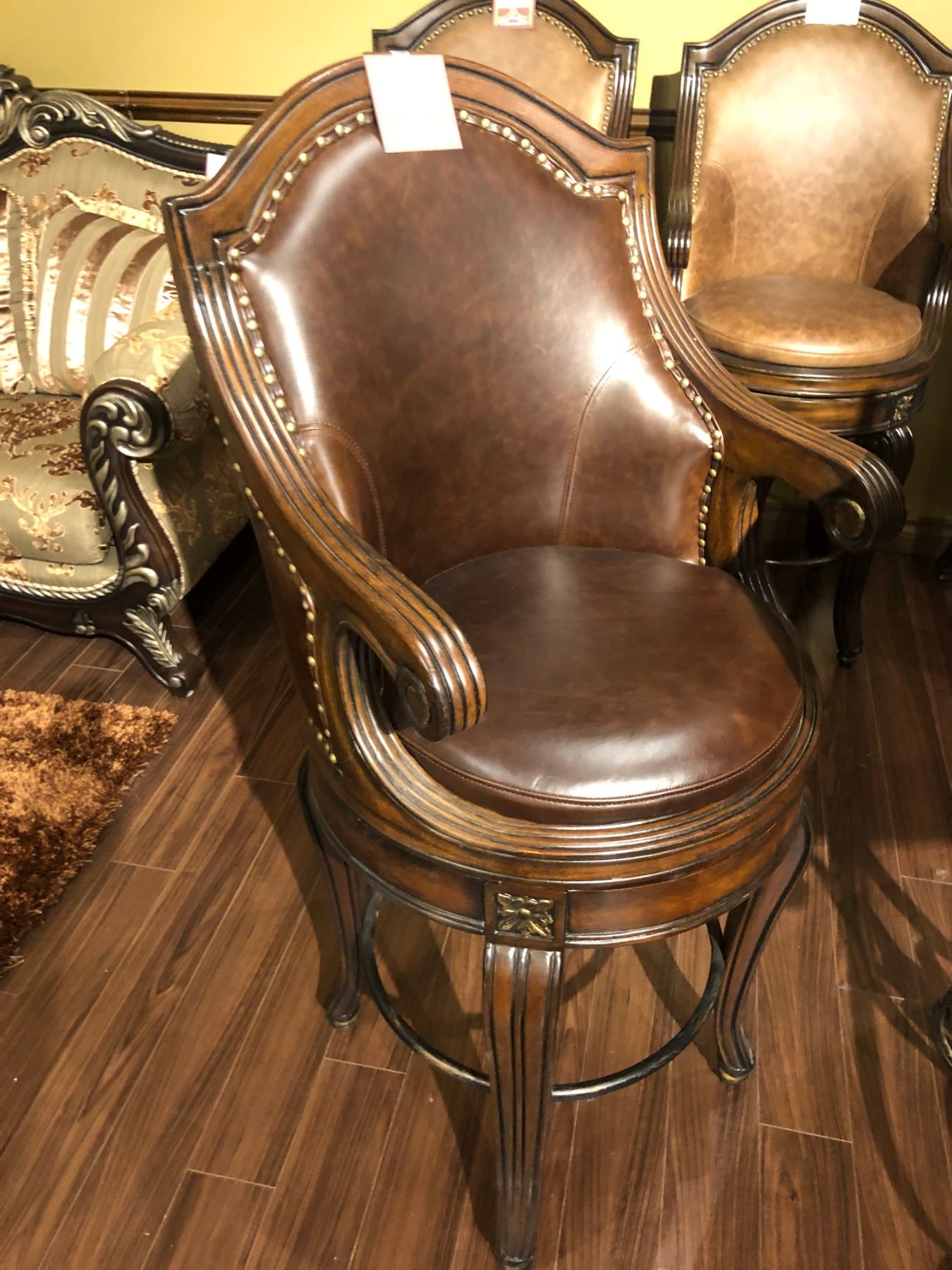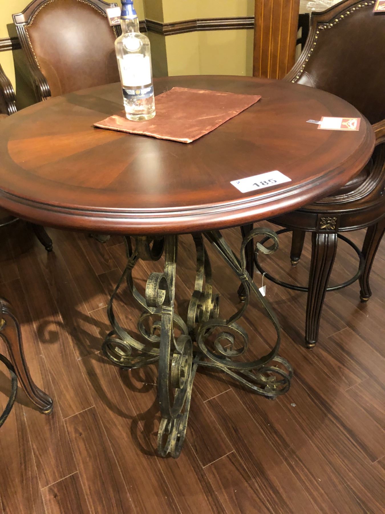 DARK WOOD TOP / WROUGHT IRON BASE BAR HEIGHT TABLE WITH TWO LEATHER / WOOD SWIVEL TOP BAR STOOLS. RETAIL $6,460.00