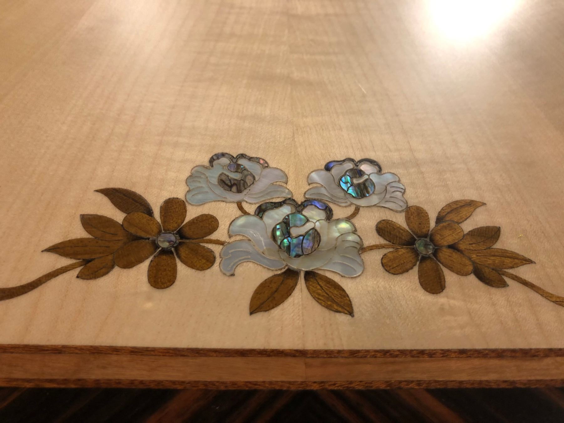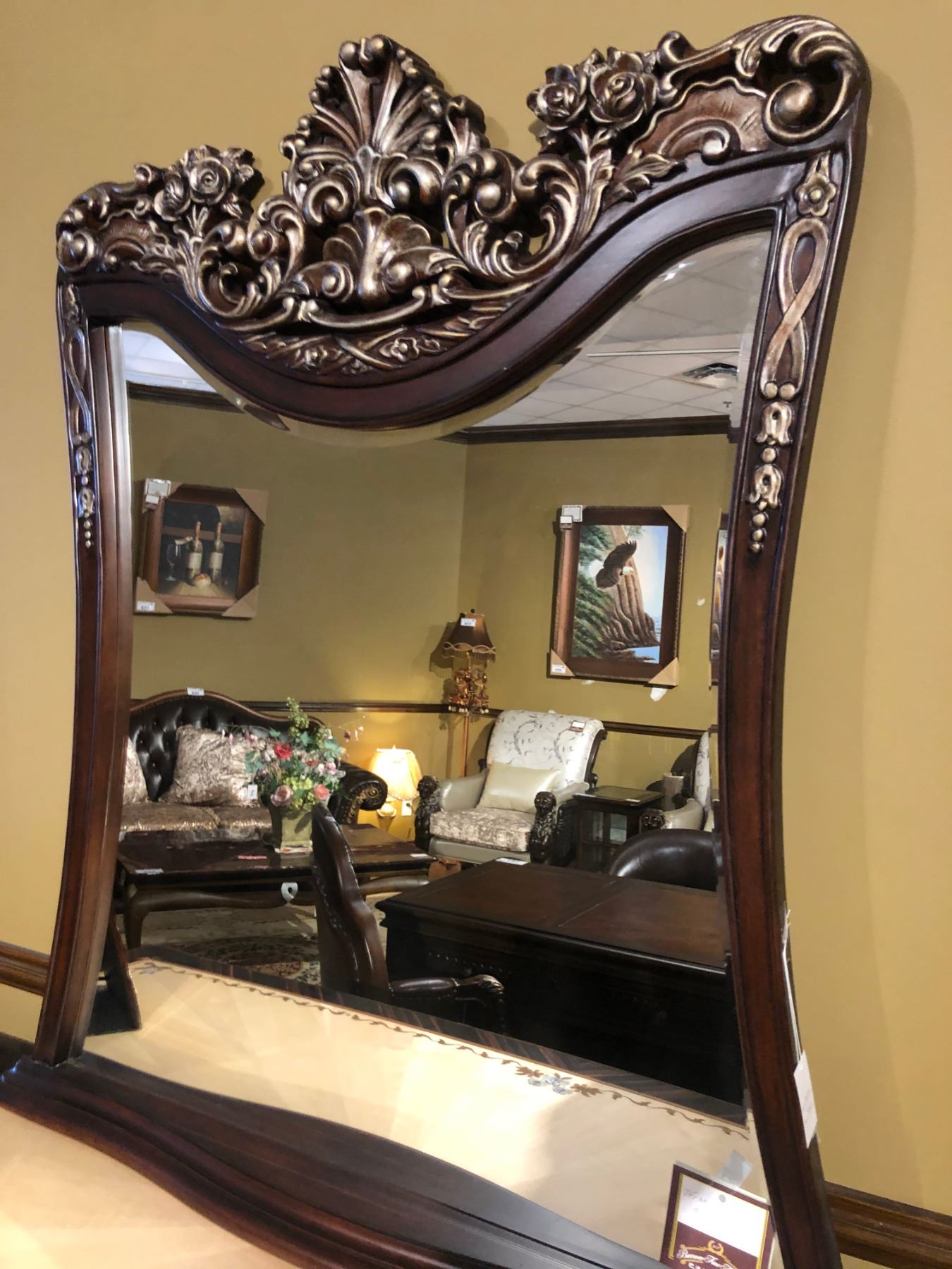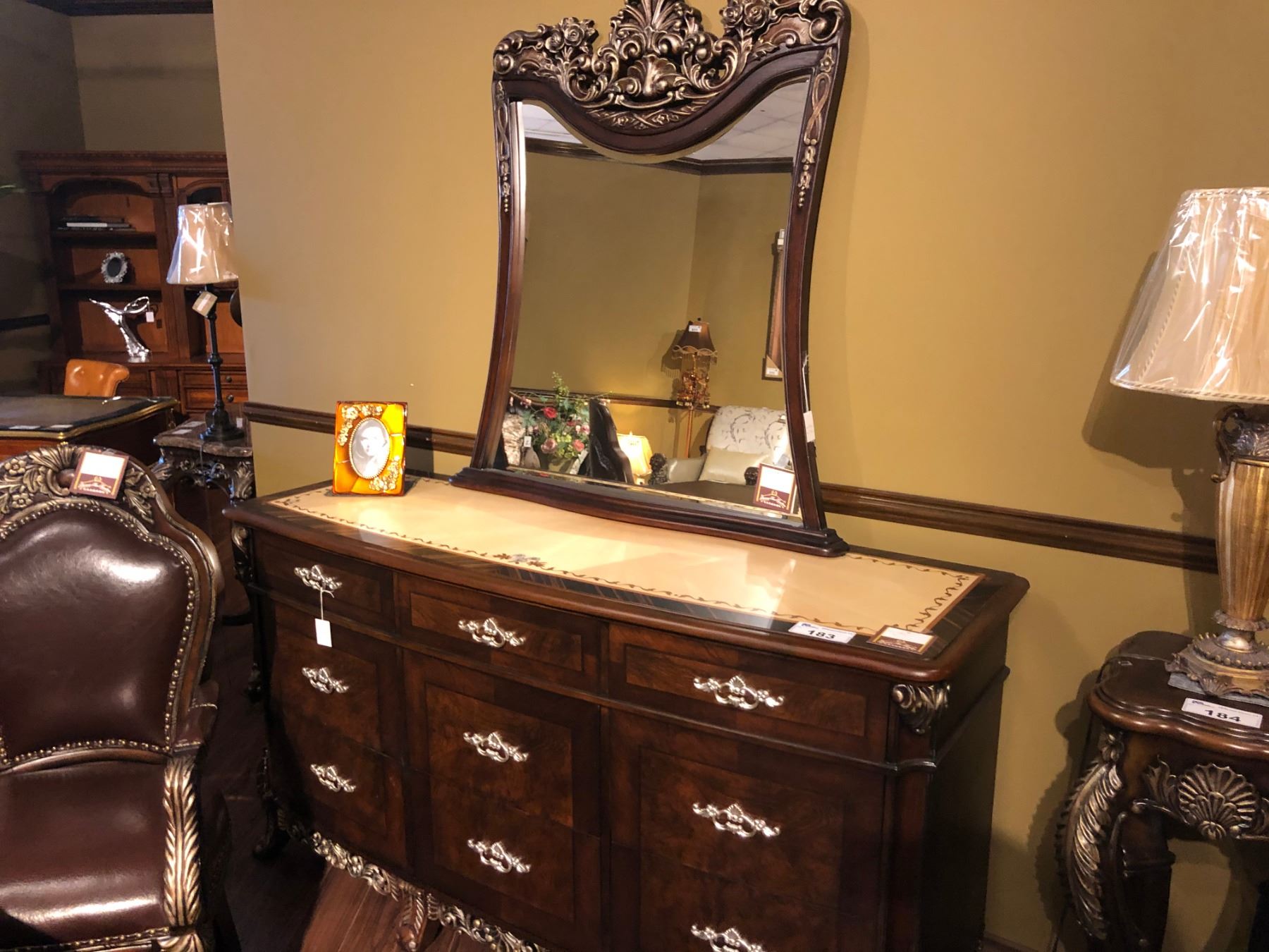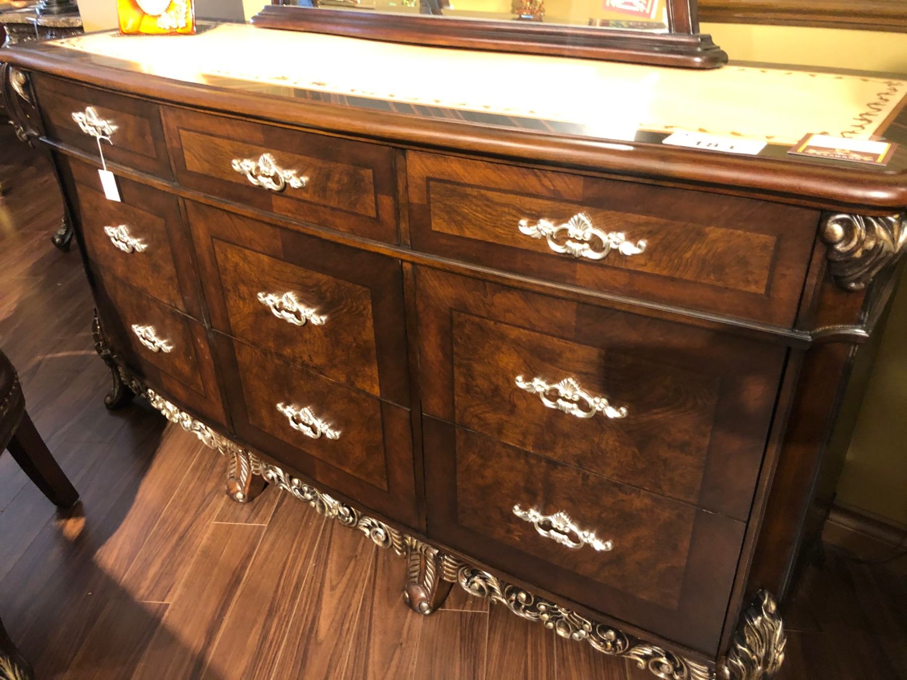 DARK WOOD WITH DELICATE INLAY TOP SIDEBOARD AND MIRROR. RETAIL $6,550.00