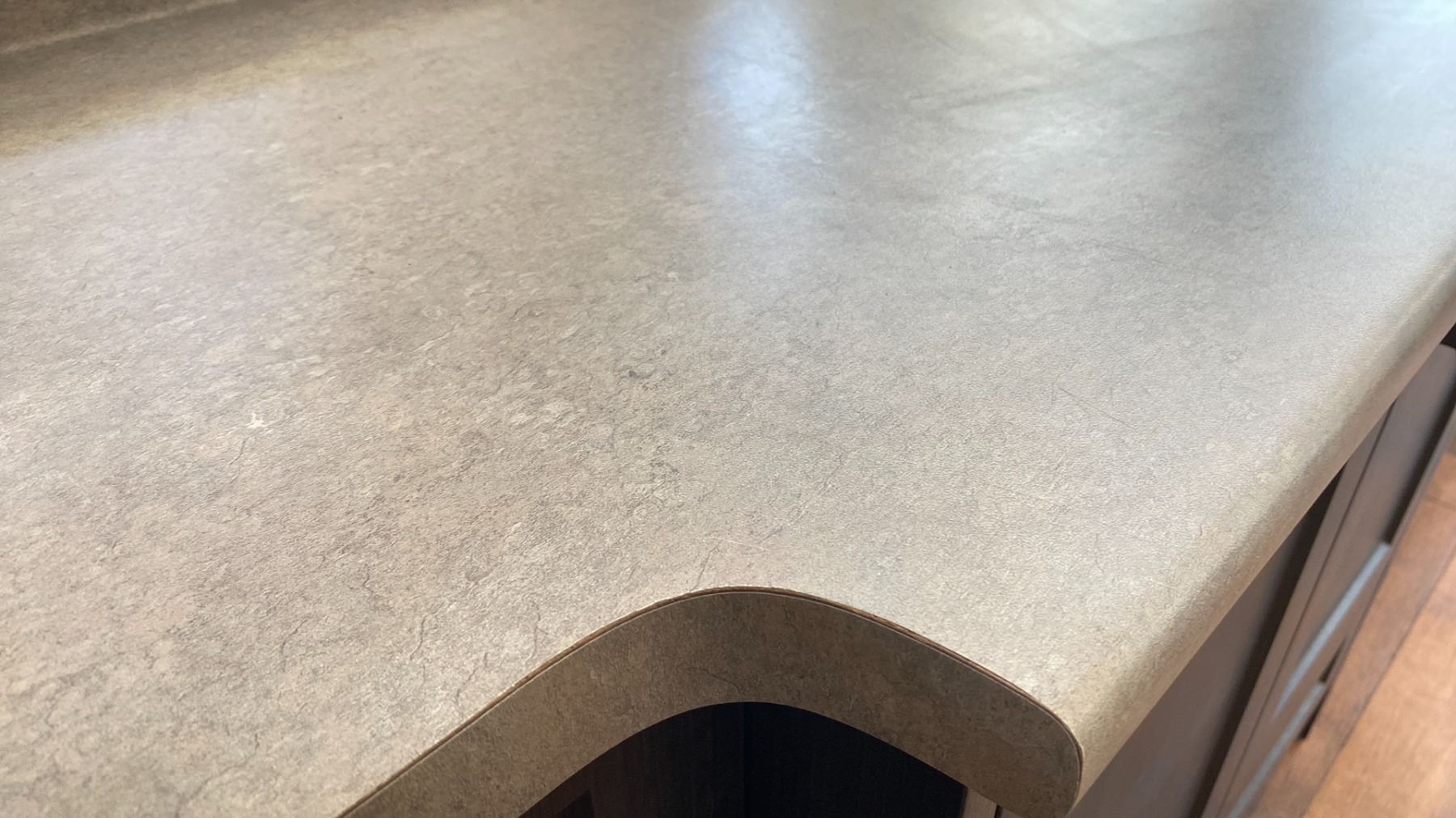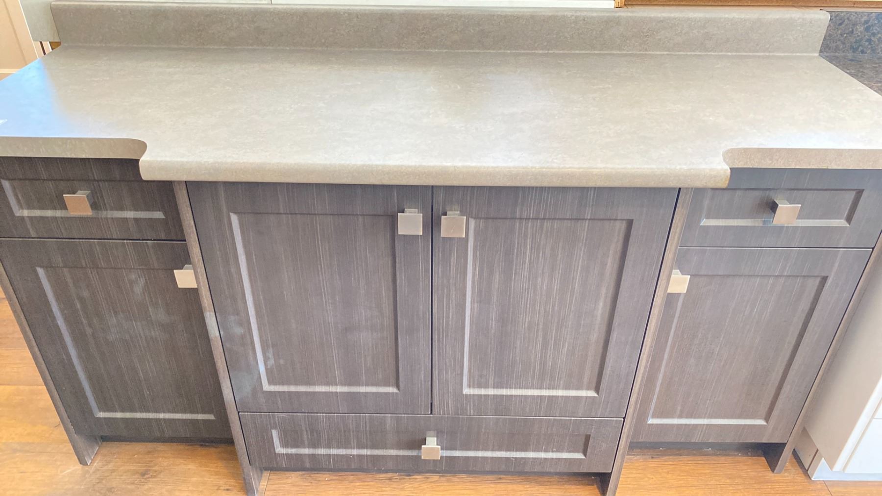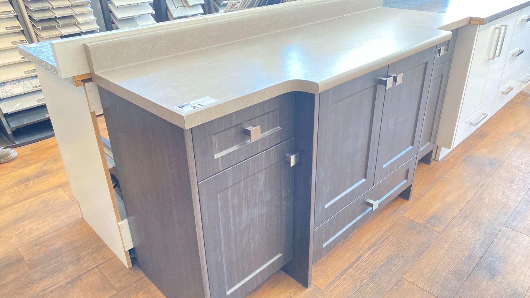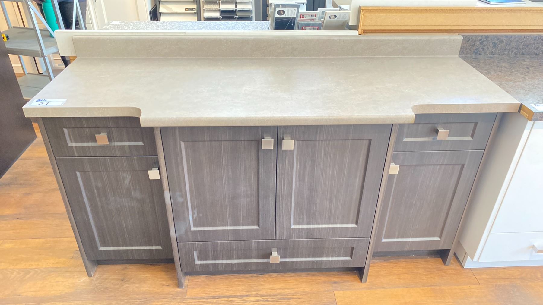 DARK WOOD WITH GREY LAMINATE TOP 4 DOOR 3 DRAWER BATHROOM VANITY CABINET - APPROX. 62.5"W X 23"D X 32"H