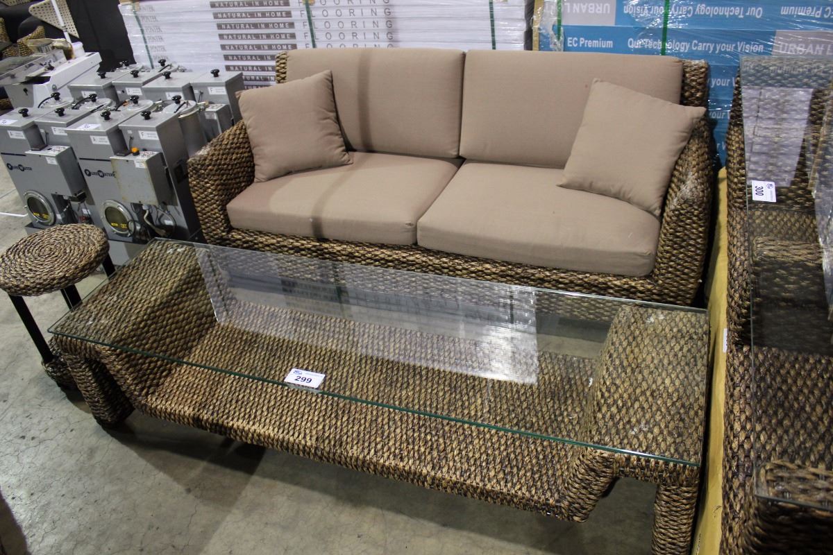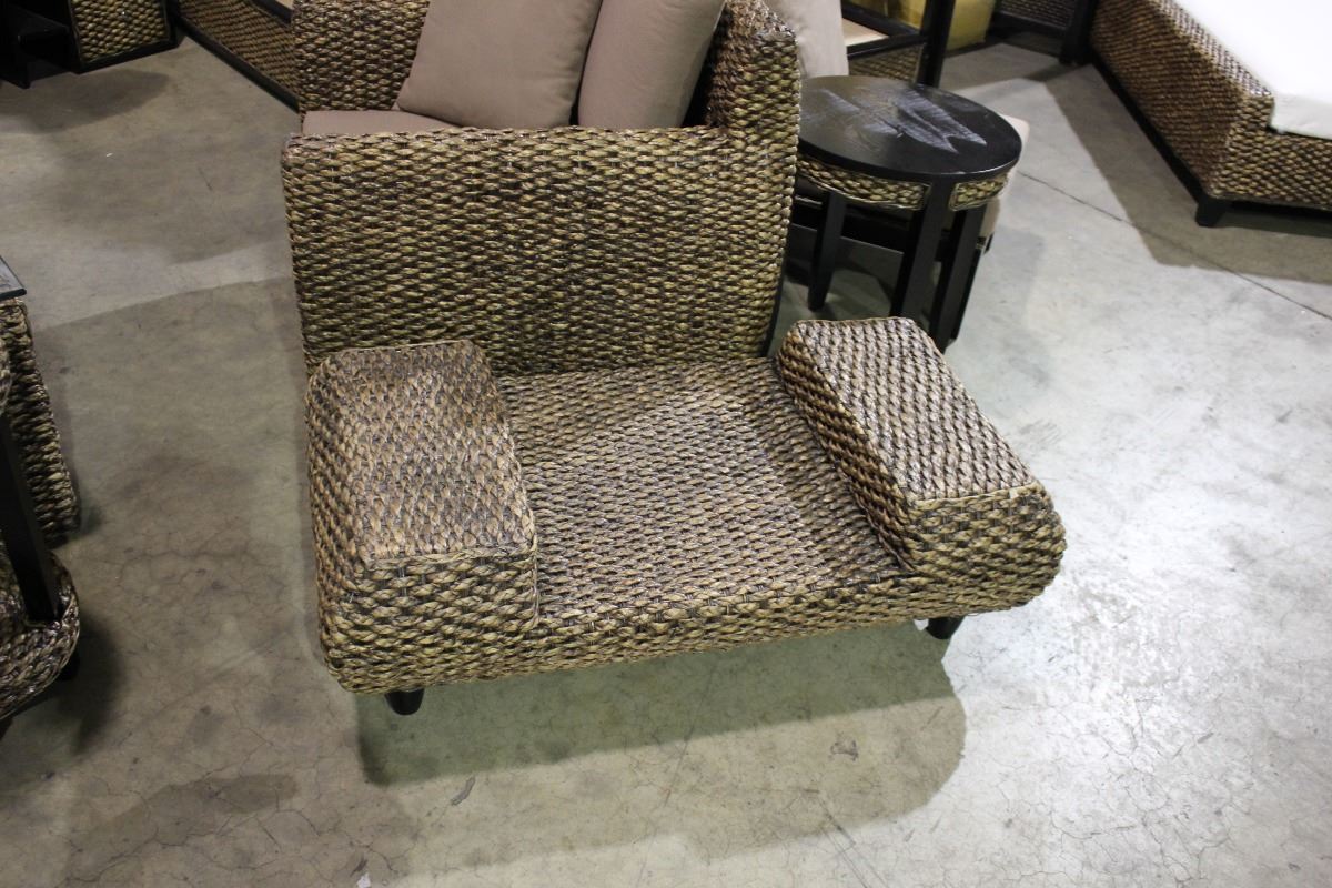 DARK WOOD & WOVEN RATTAN PATIO SOFA SET INCLUDING: COUCH, CHAIR, COFFEE TABLE, OTTOMAN & 3 END TABLES
