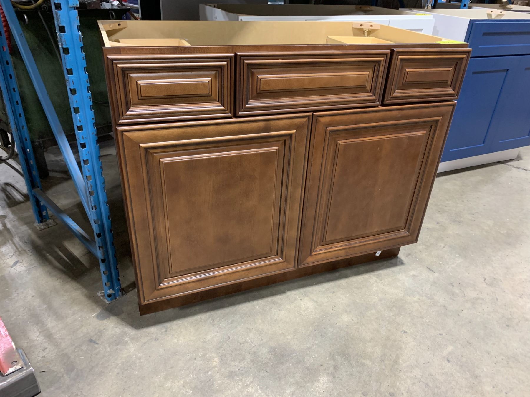 DARK WOOD X2 DOOR X2 DRAWER 42"L X 22"W X 34.5"H BATHROOM VANITY WITH SOFT CLOSE DOORS (DAMAGED - DRAWER NEEDS MINOR REPAIR)