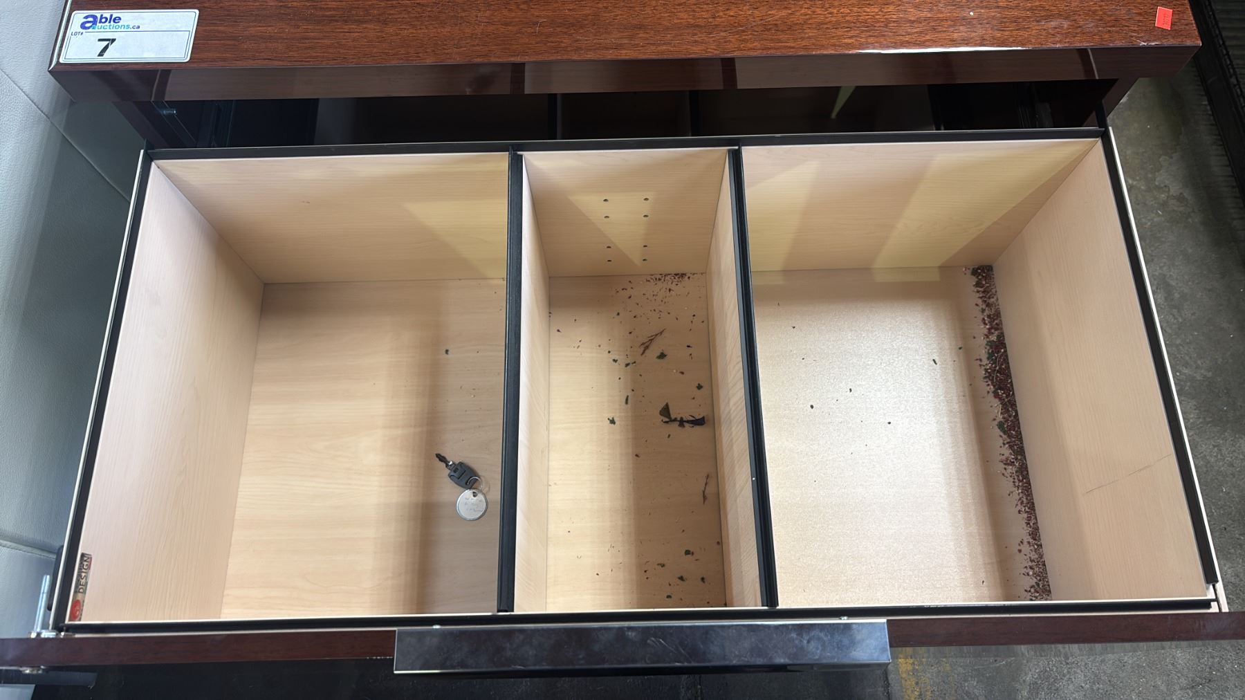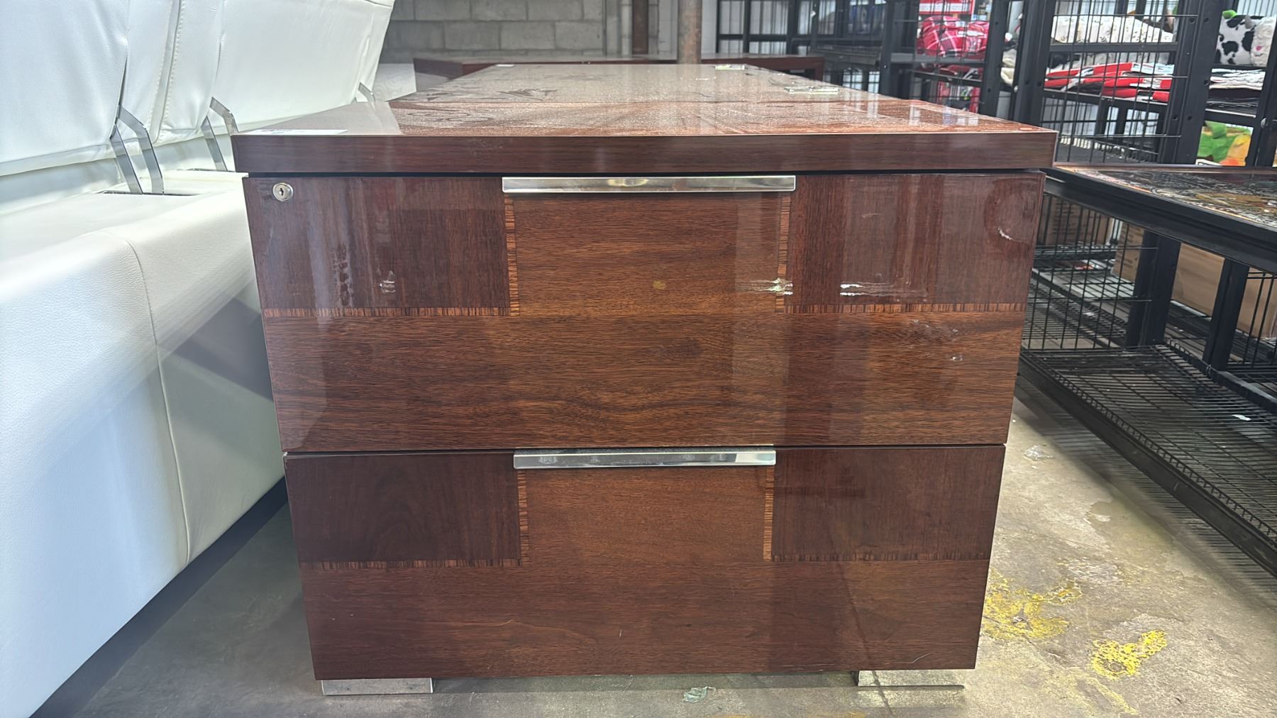 DARK WOODEN FILING CABINET WITH CHROME FINISH HANDLES AND KEY - APPROX. 35 1/2"W X 20"D X 30"H