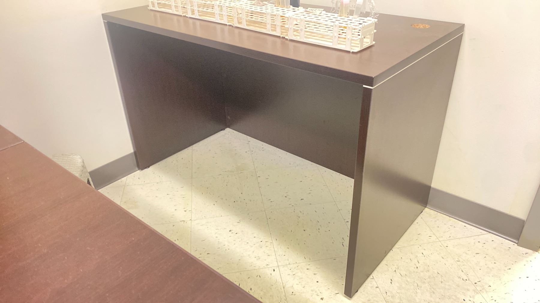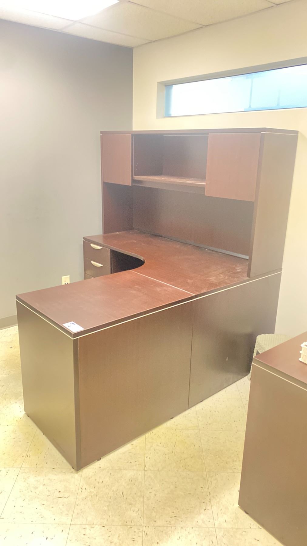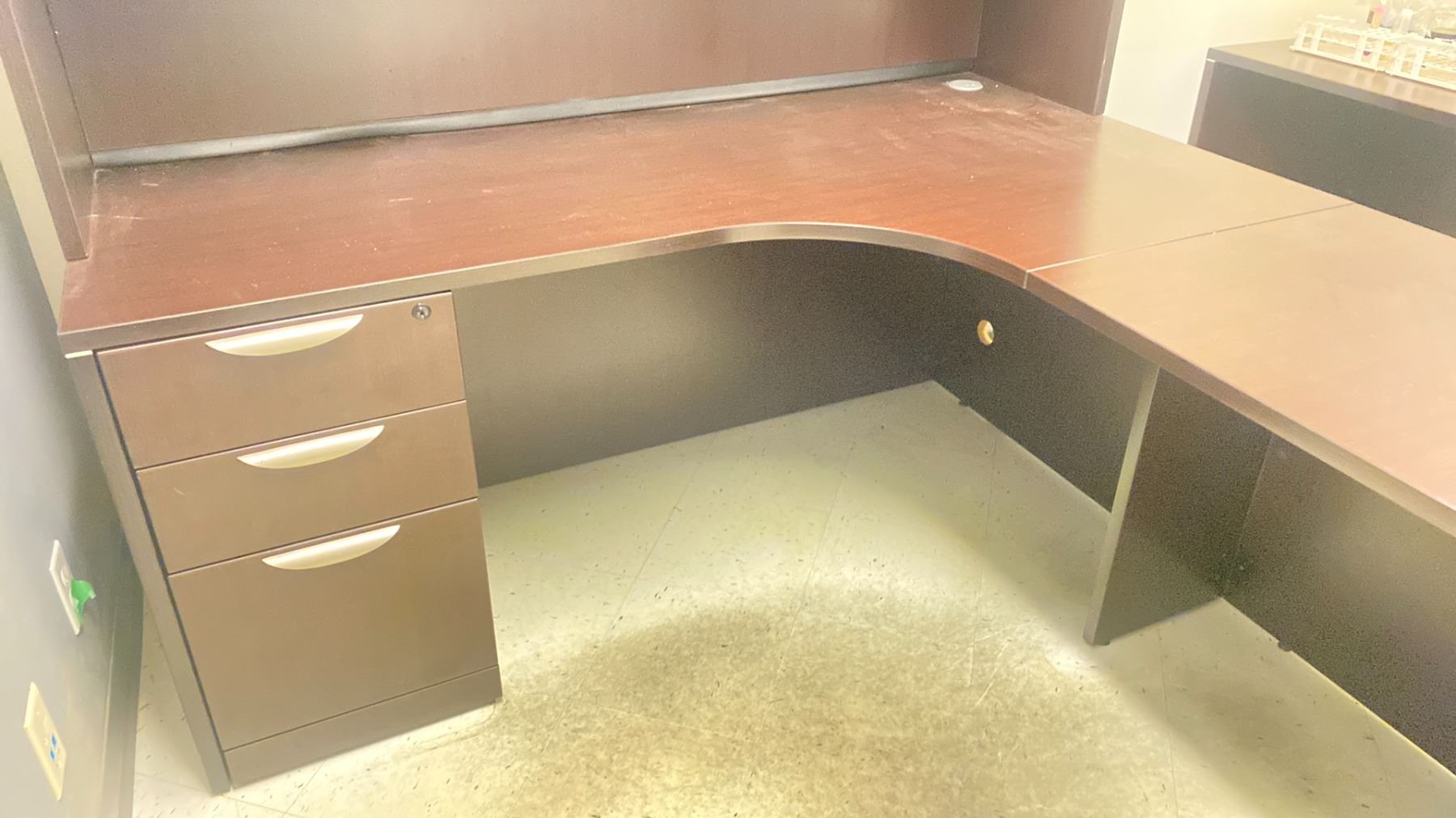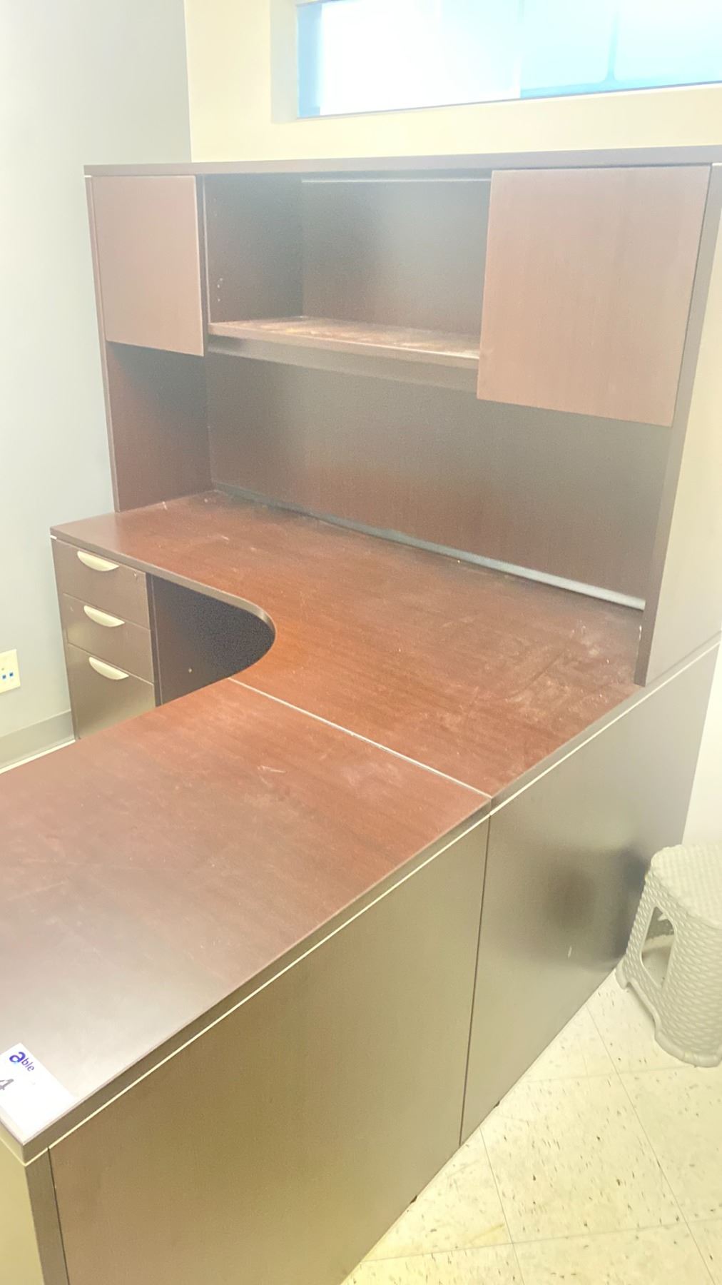DARK WOODEN L SHAPE 3 DRAWER 66"W X 66"L X 66"H DESK WITH HUTCH, A DARK WOODEN 47"W X 24"D X 30"H TASK TABLE & A 4'W WHITE BOARD