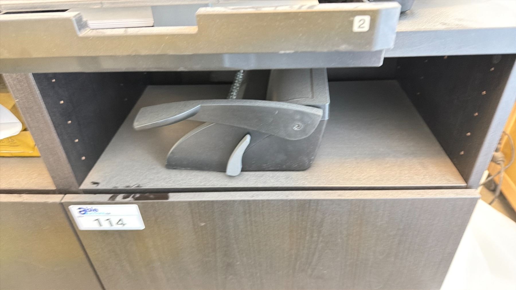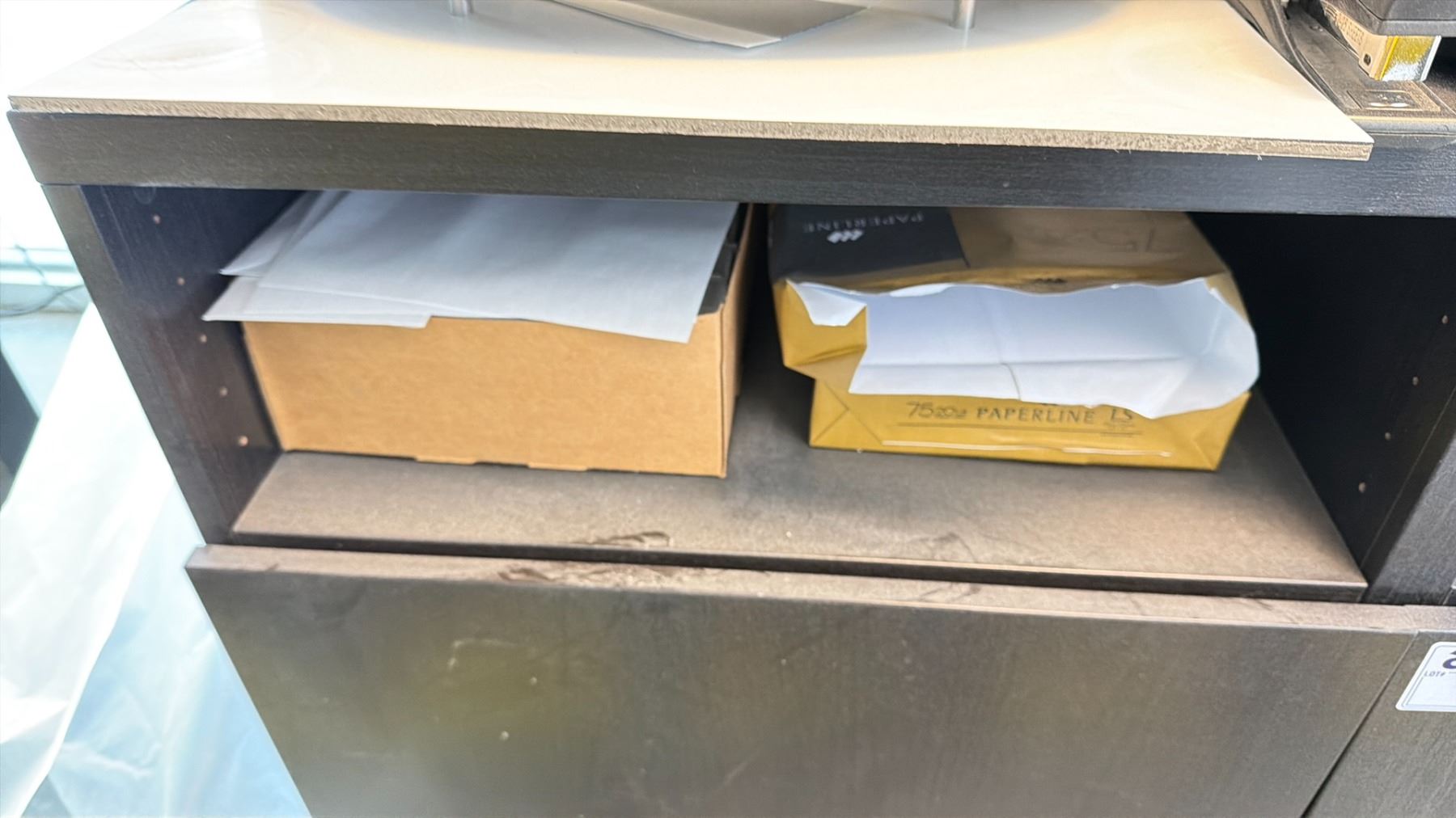 DARKWOOD 2 DRAWER STORAGE CABINET WITH ASSORTED PRINTING CONTENTS