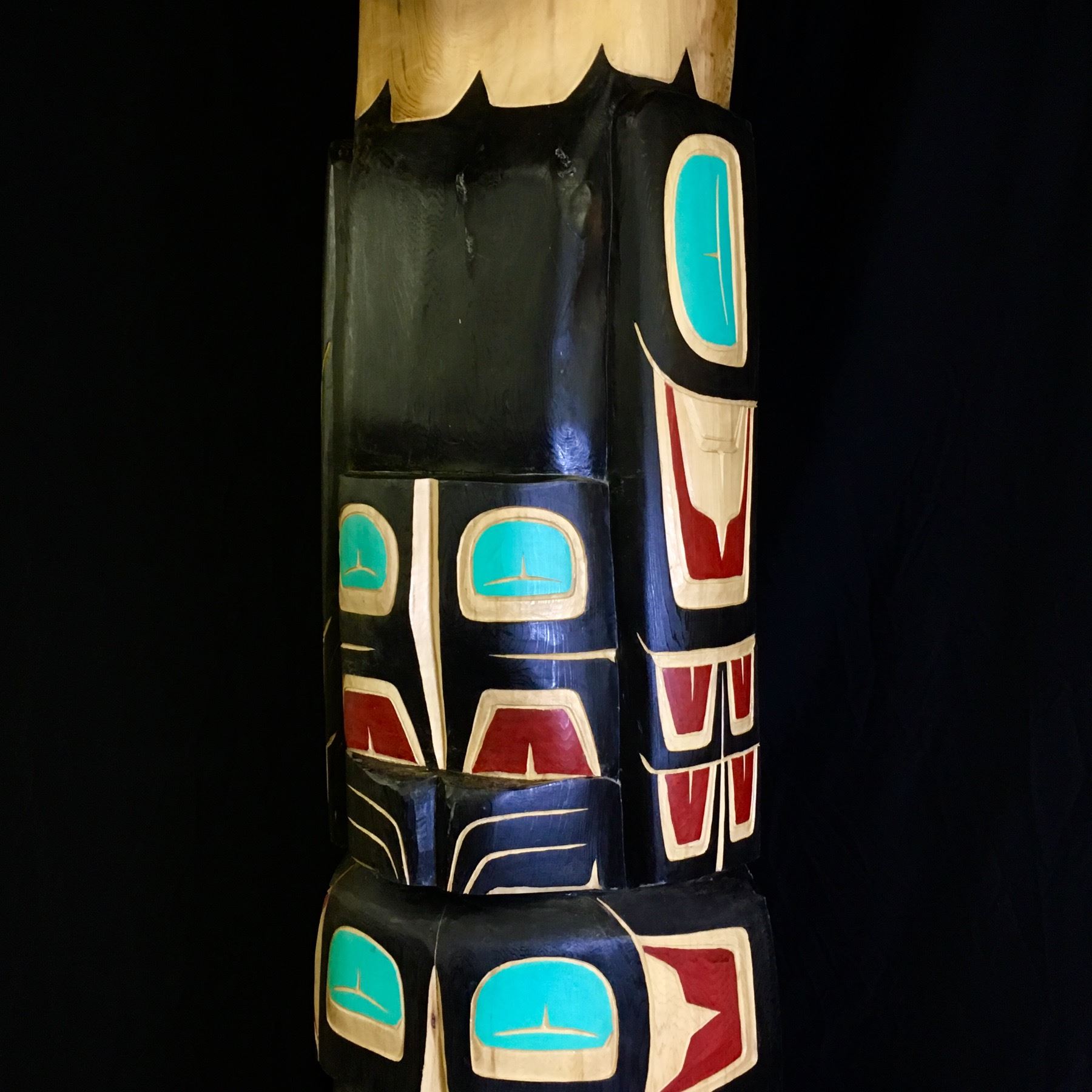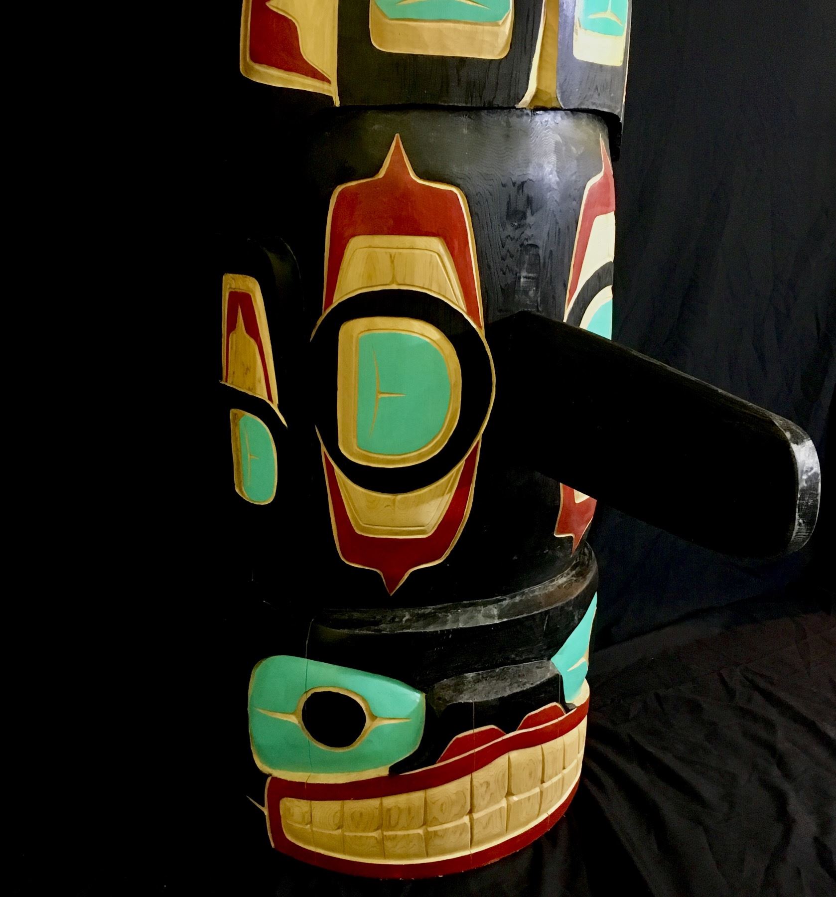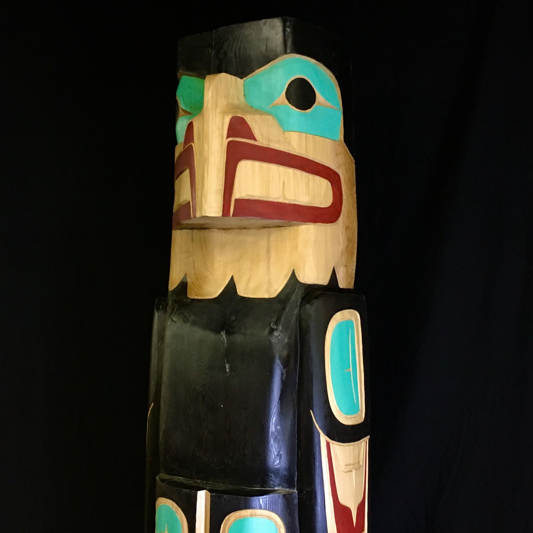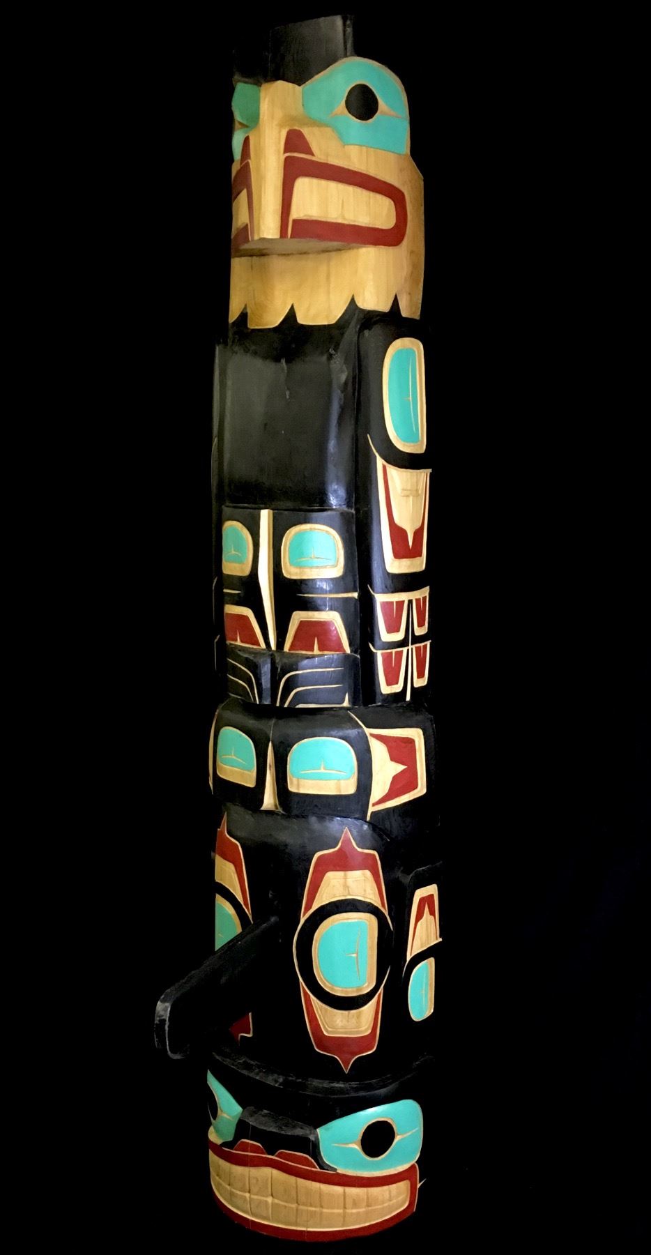 DARREN YELTON, 10' TALL TOTEM POLE OF A BALD EAGLE STANDING ON A KILLER WHALE, MADE FROM 300 YEAR OLD GROWTH RED CEDAR FROM THE ELAHO VALLEY NEAR SQUAMISH, THE BALD EAGLE IS THE SYMBOL OF POWER AND PRESTIGE, THE KILLER WHALE IS THE PROTECTOR AND GUARDIAN OF THE SEA. SIGNED ON BACK BY ARTIST