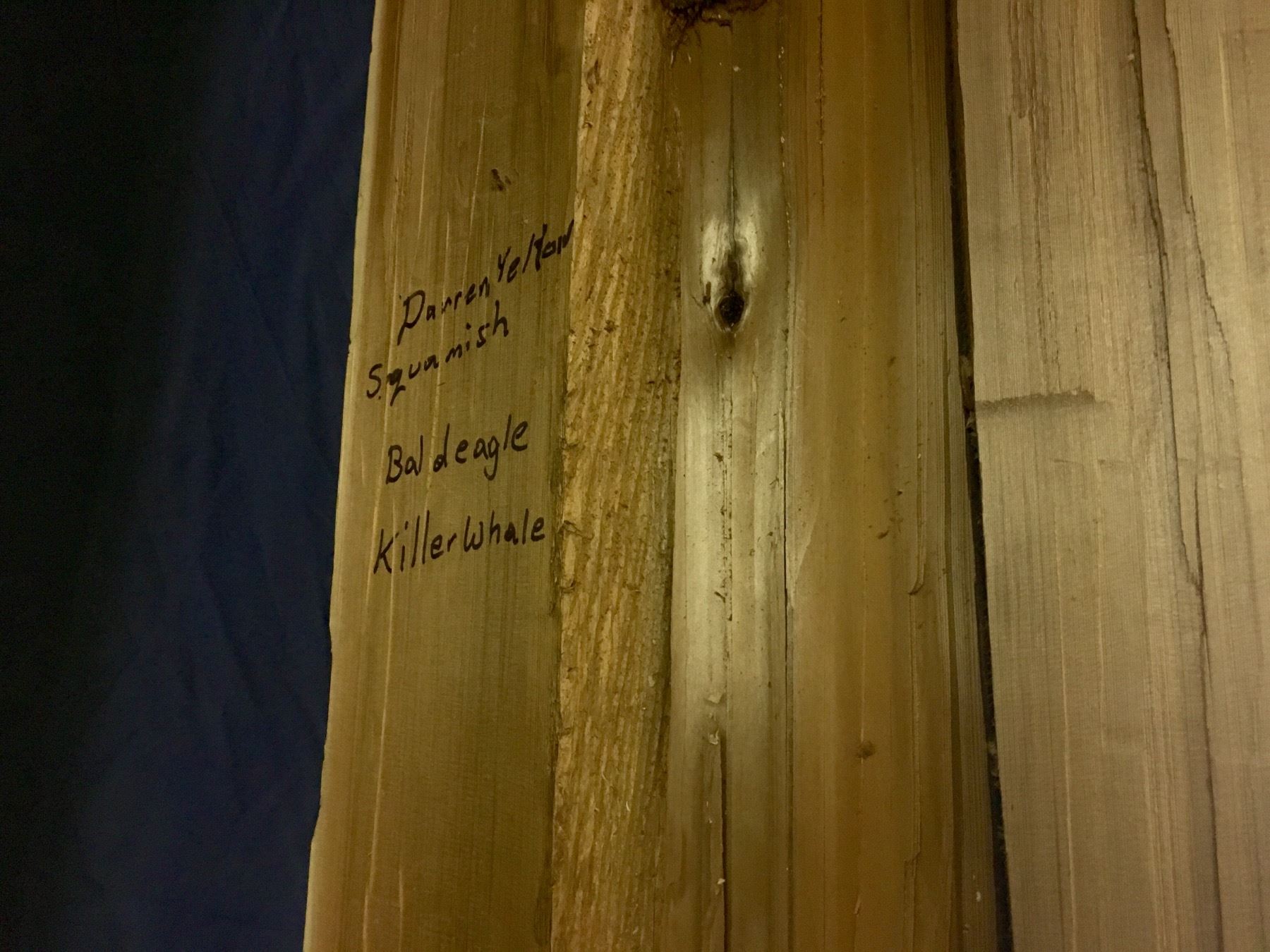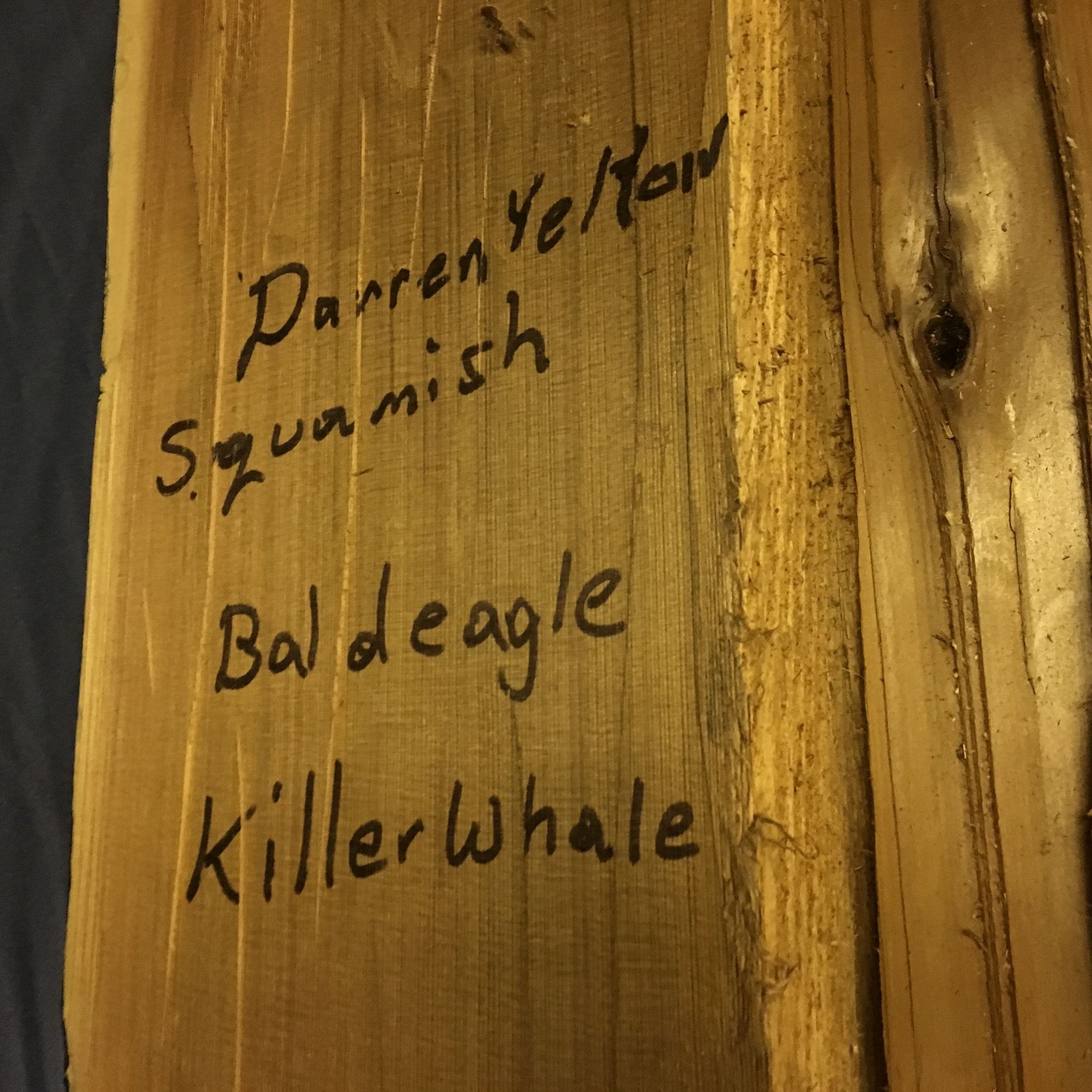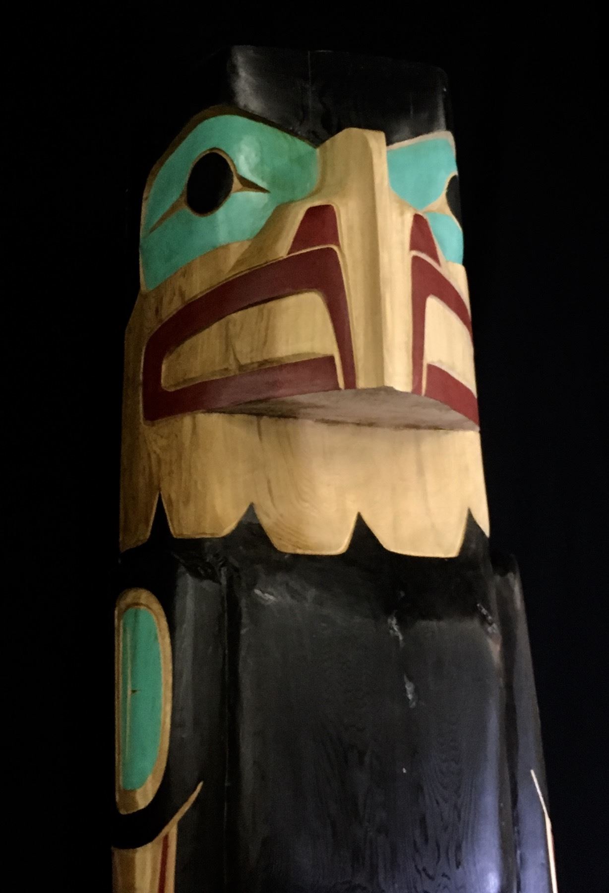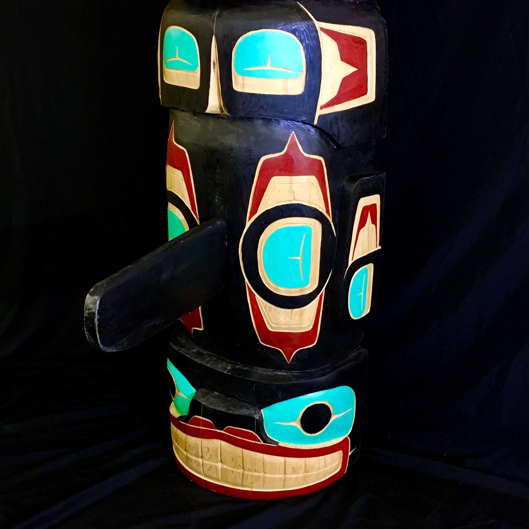 DARREN YELTON, 10' TALL TOTEM POLE OF A BALD EAGLE STANDING ON A KILLER WHALE, MADE FROM 300 YEAR OLD GROWTH RED CEDAR FROM THE ELAHO VALLEY NEAR SQUAMISH, THE BALD EAGLE IS THE SYMBOL OF POWER AND PRESTIGE, THE KILLER WHALE IS THE PROTECTOR AND GUARDIAN OF THE SEA. SIGNED ON BACK BY ARTIST
