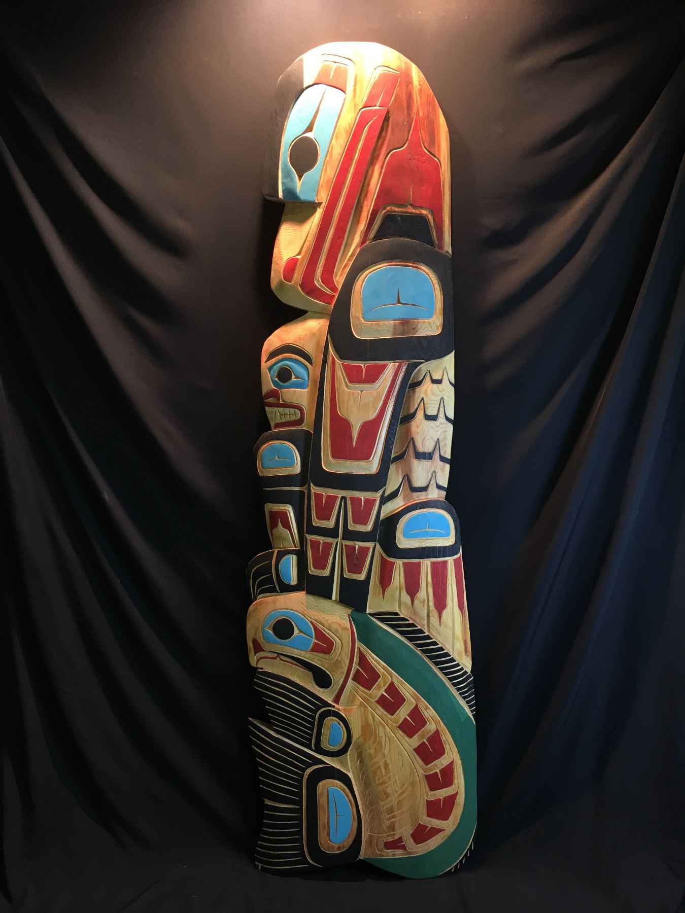 DARREN YELTON OF SQUAMISH NATION, "WILDMAN OF THE WOODS, HE WHO IS A SYMBOL OF POWER AND PRESTIGE" HAND CARVED AND PAINTED TOTEM, 102'' TALL, SIGNED ON BACK BY ARTIST