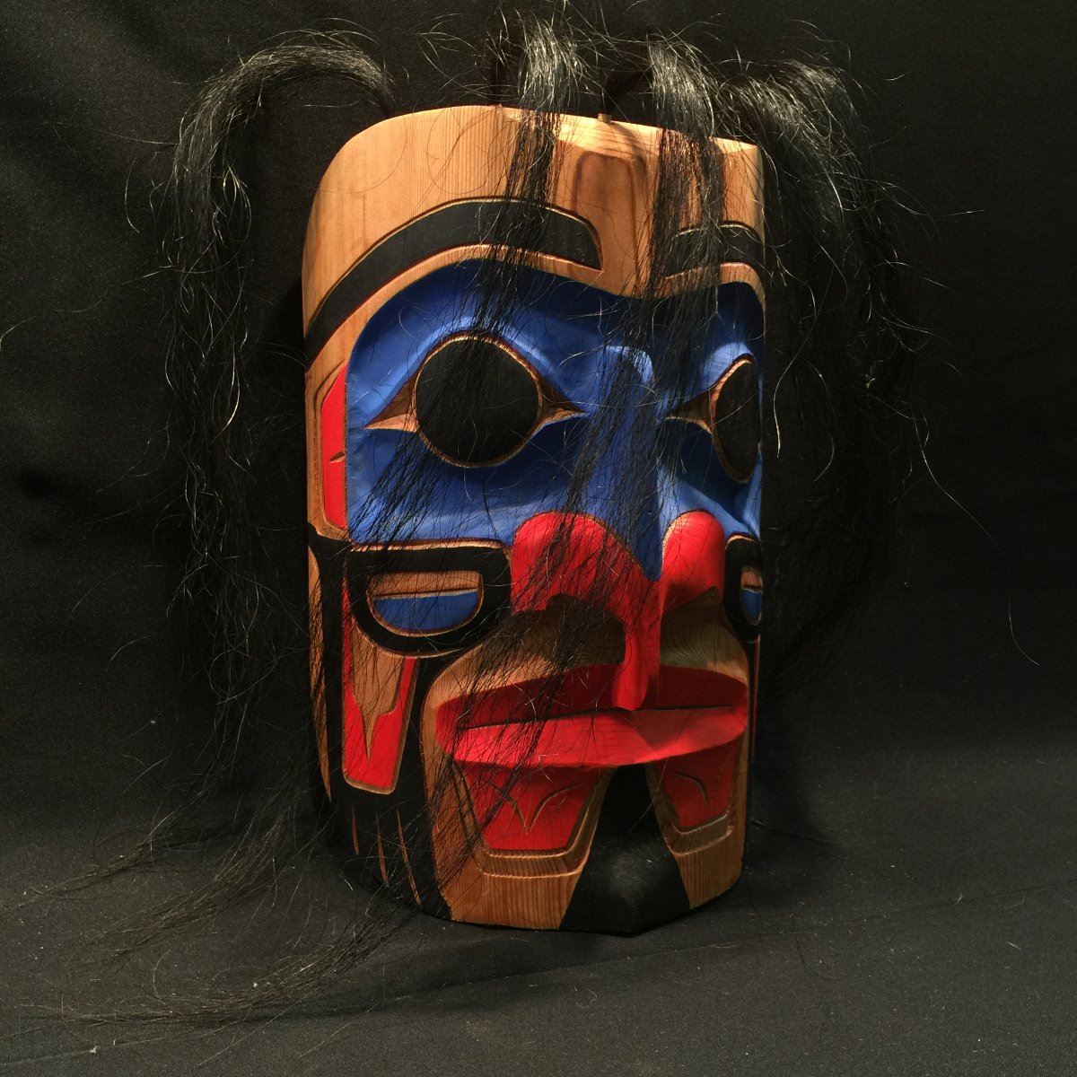 DARREN YELTON, 'WARRIOR' HAND CARVED CEDAR MASK WITH HORSE HAIR ACCENTS SQUAMISH, 20'' L X 14'' H