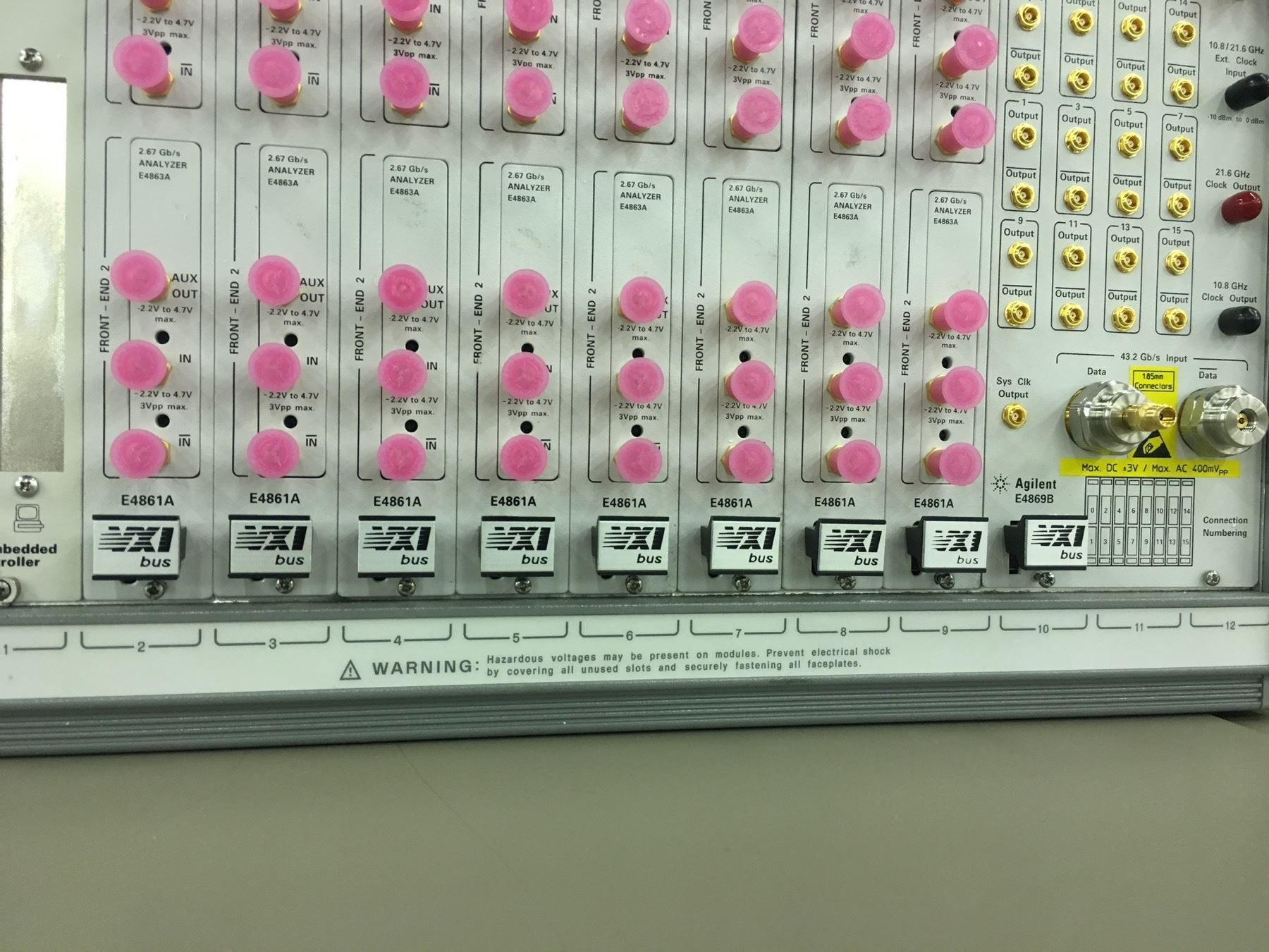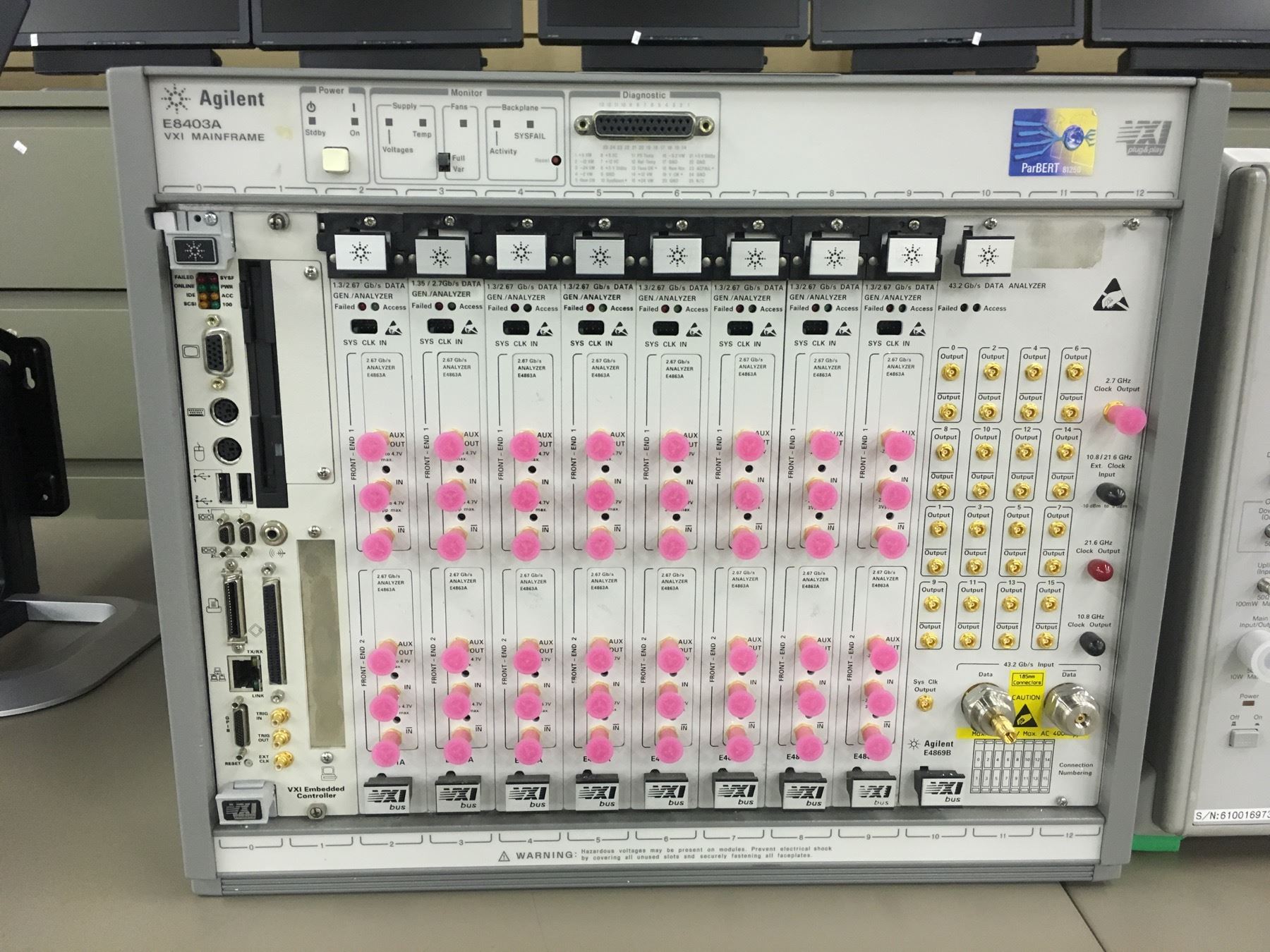 DATA GEN./ANALYZER UNITS: 8X AGILENT E4861A 1.3/2.67 GIGABIT/S DATA GEN./ANALYZERS, 1X E4869B 43.2 GIGABIT/S DATA ANALYZER WITH MULTIPLE CLOCK OUTPUTS, 1X AGILENT VXI EMBEDDED CONTROLLER, ALL UNITS INSTALLED IN AGILENT E8403A VXI MAINFRAME BY HP