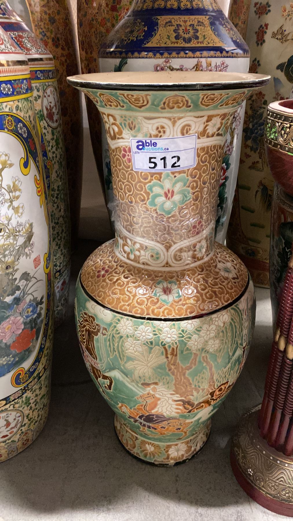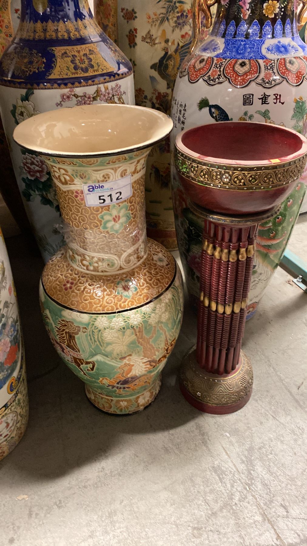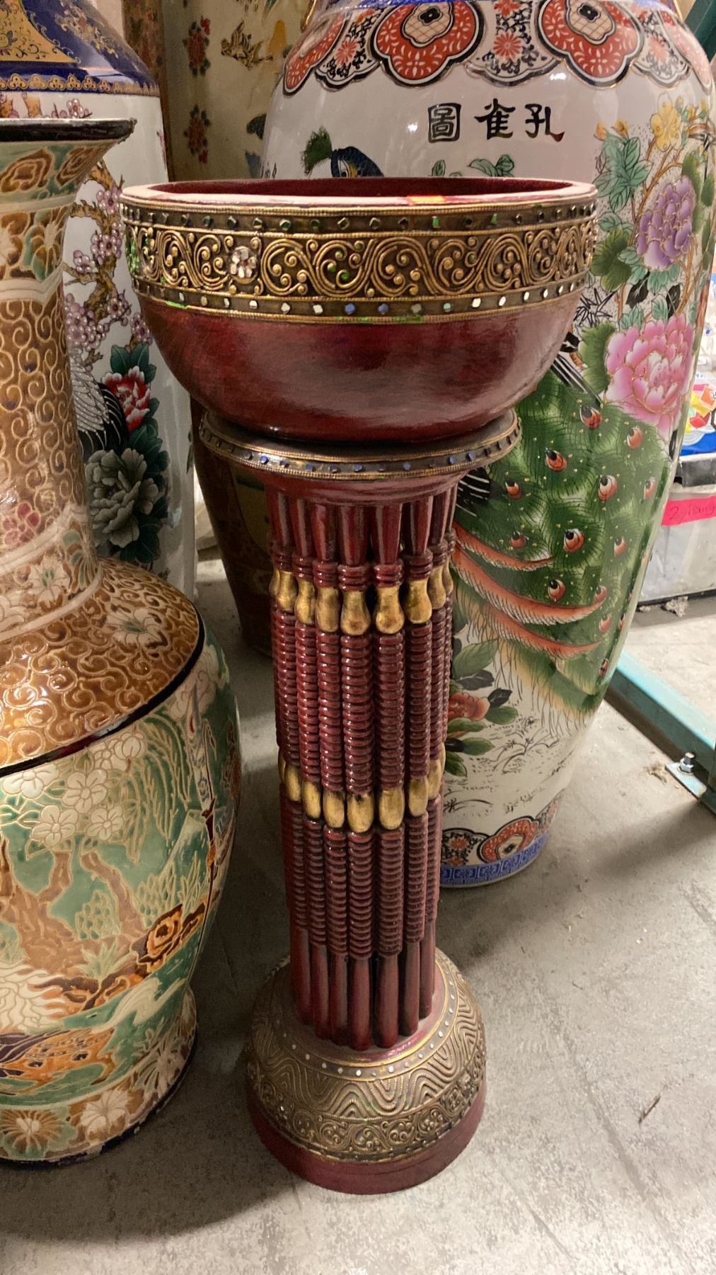 DECORATIVE ASIAN FLOOR VASE & WOODEN DECORATIVE FLOWER POT ON PEDESTAL APPROX 30" & 31" TALL