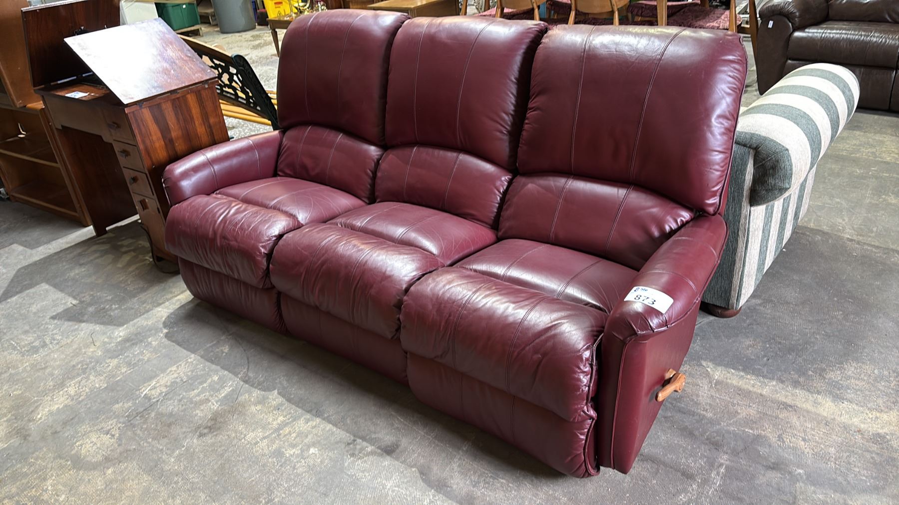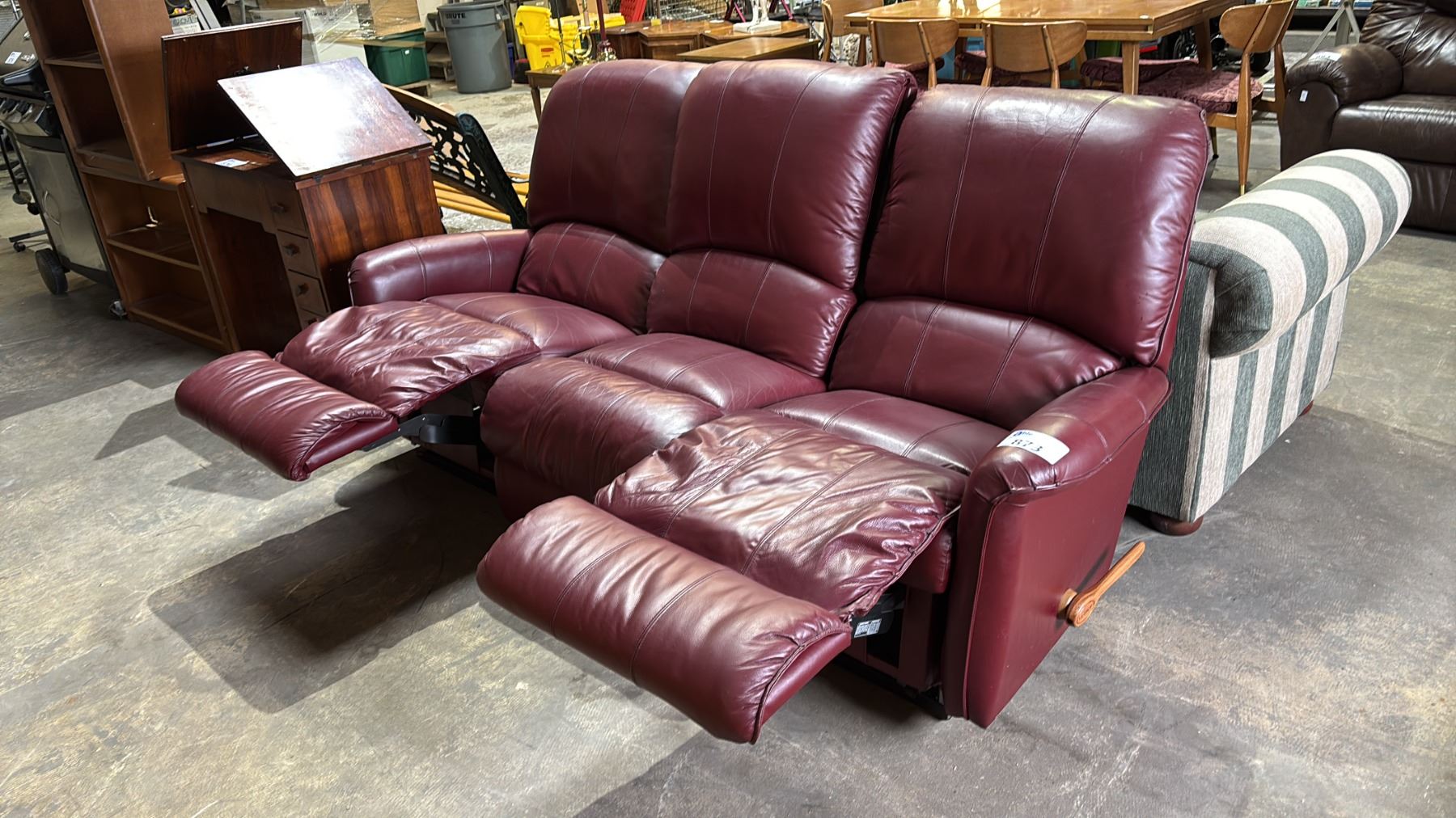 DEEP RED LEATHER LA-Z-BOY SOFA WITH RECLINING SEATS ON EACH END