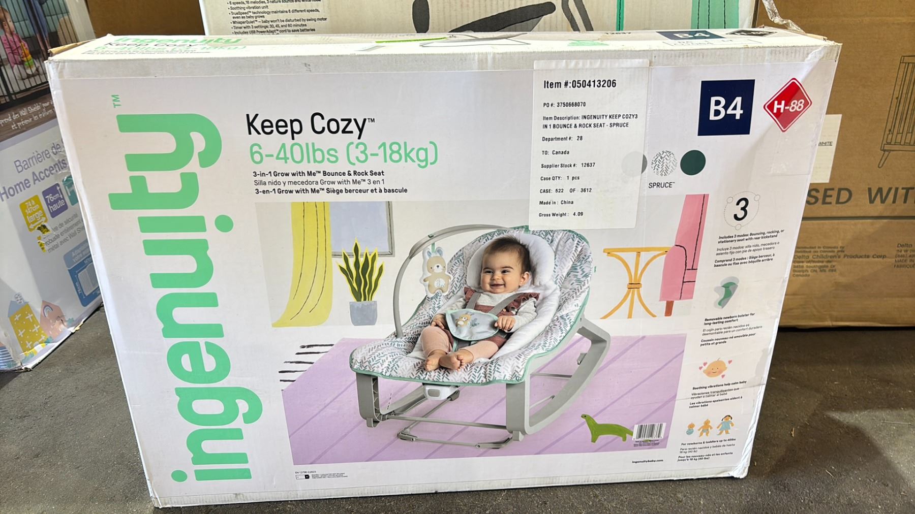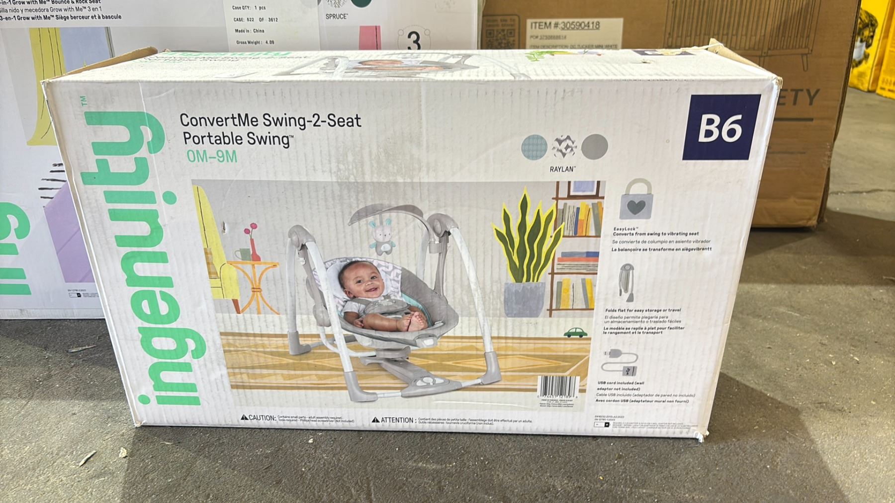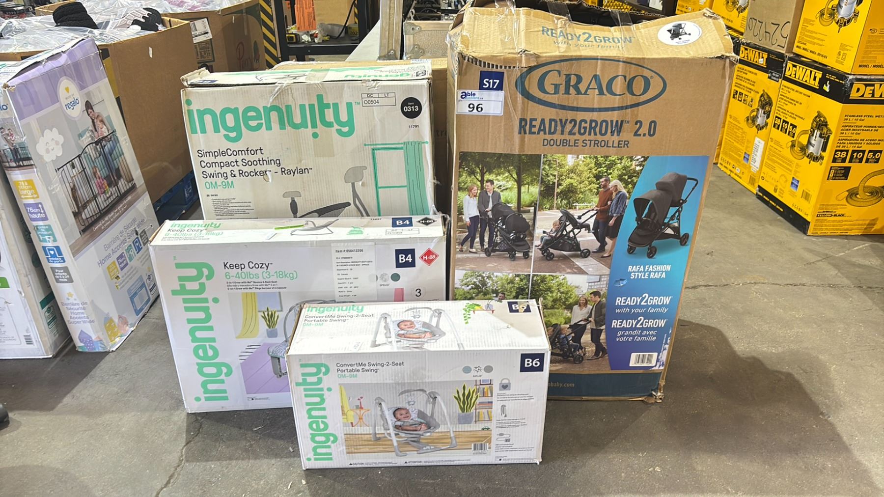 DELTA CHILDREN TUCKER CRIB WITH MATTRESS, GRACO READY 2 GROW 2.0 DOUBLE STROLLER, INGENUITY SIMPLE COMFORT COMPACT SOOTHING SWING & ROCKER ( 0M - 9M), INGENUITY KEEP COZY 3-IN-1 GROW WITH ME BOUNCE & ROCK SET ( 6 - 40LBS ) & A INGENUITY CONVERTME SWING-2-SEAT PORTABLE SWING ( 0M - 9M ) *WORKING CONDITION UNKNOWN/MAY BE MISSING PARTS AND/OR PIECES*
