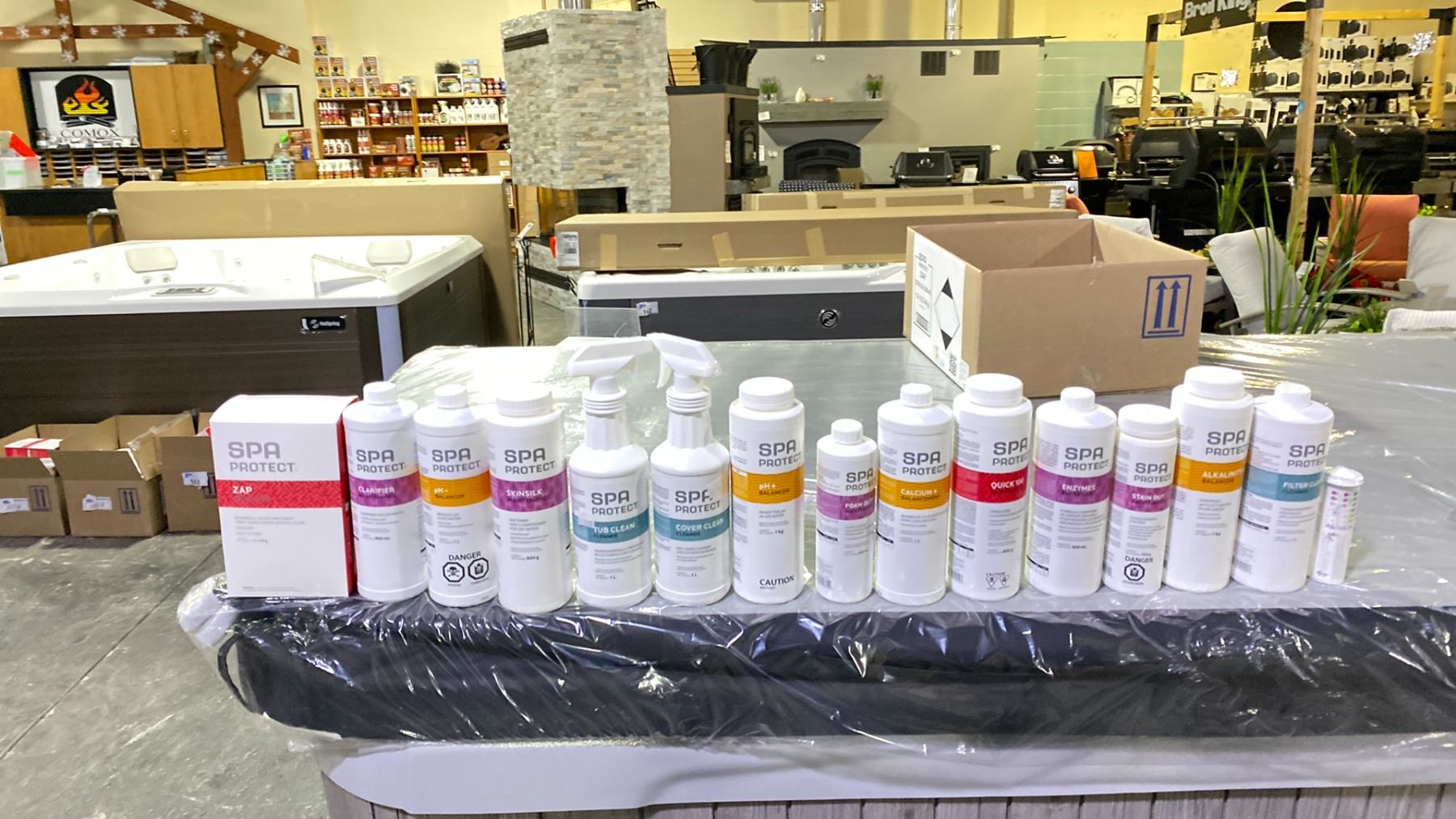DELUXE SPA/HOT TUB CHEMICAL PACKAGE. FILTER CLEAN, ALK+, STAIN OUT, ENZYMES, QUICK 100, CALCIUM +, FOAM OUT, PH+, COVER CLEAN, TUB CLEAN, SKIN SILK, PH-, CLARIFIER, ZAP