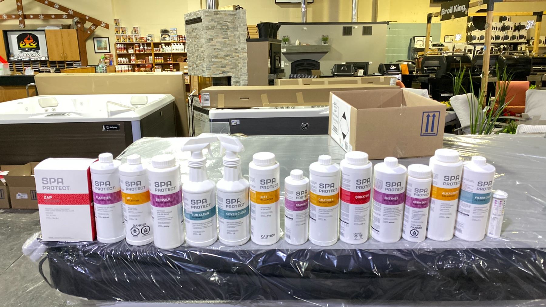 DELUXE SPA/HOT TUB CHEMICAL PACKAGE. FILTER CLEAN, ALK+, STAIN OUT, ENZYMES, QUICK 100, CALCIUM +, FOAM OUT, PH+, COVER CLEAN, TUB CLEAN, SKIN SILK, PH-, CLARIFIER, ZAP