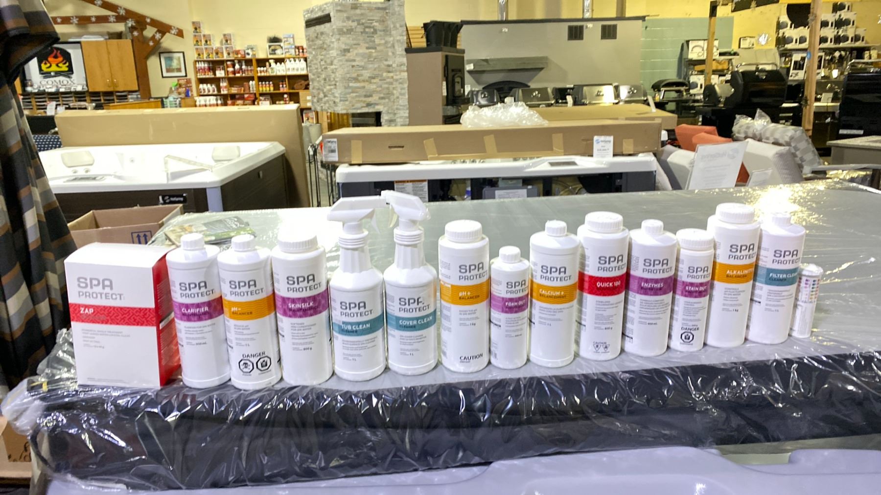 DELUXE SPA/HOT TUB CHEMICAL PACKAGE. FILTER CLEAN, ALK+, STAIN OUT, ENZYMES, QUICK 100, CALCIUM +, FOAM OUT, PH+, COVER CLEAN, TUB CLEAN, SKIN SILK, PH-, CLARIFIER, ZAP