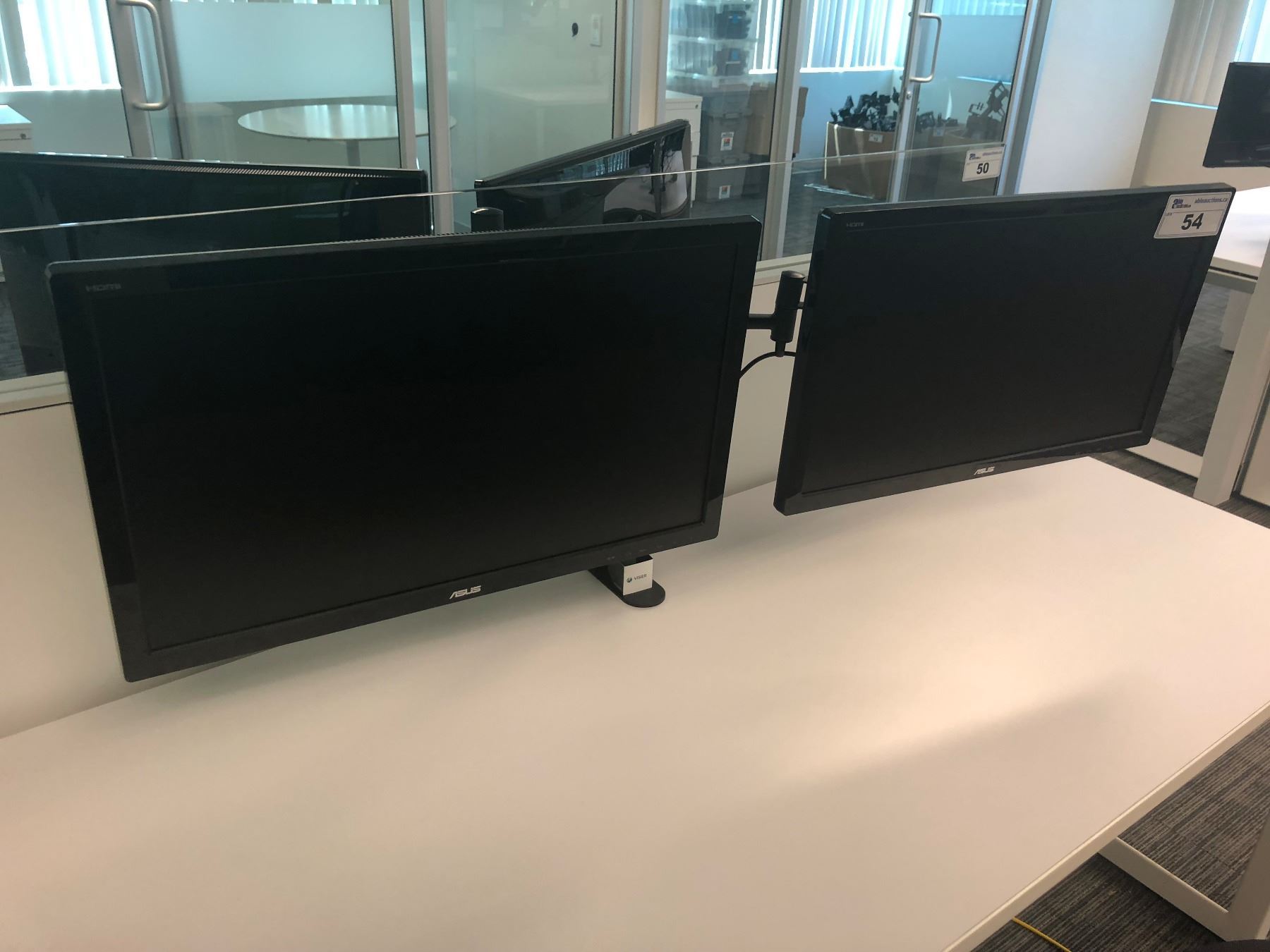 DESK MOUNT FULLY ADJUSTABLE DOUBLE MONITOR STAND WITH 2 ASUS 24  ROTATING MONITORS