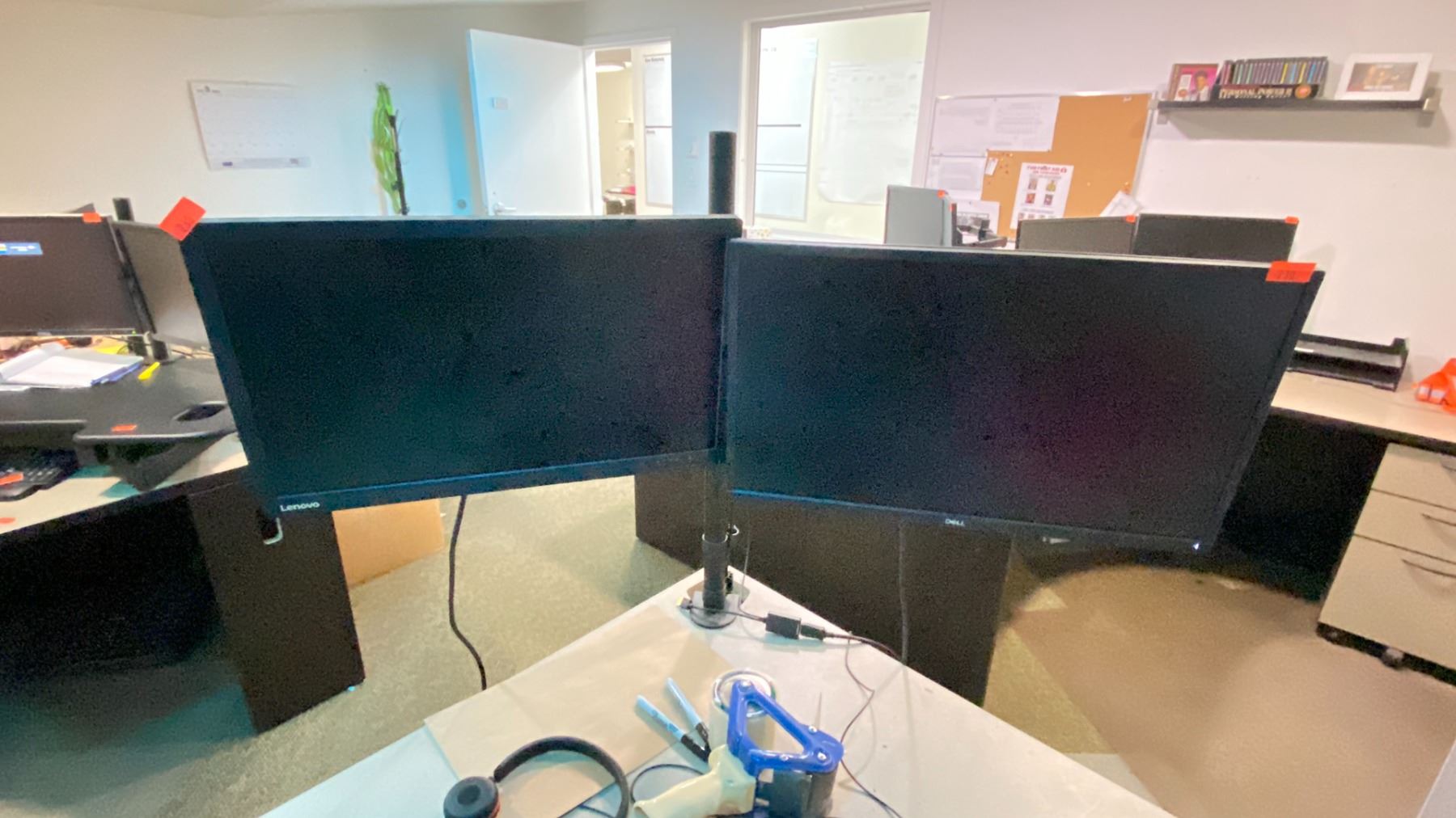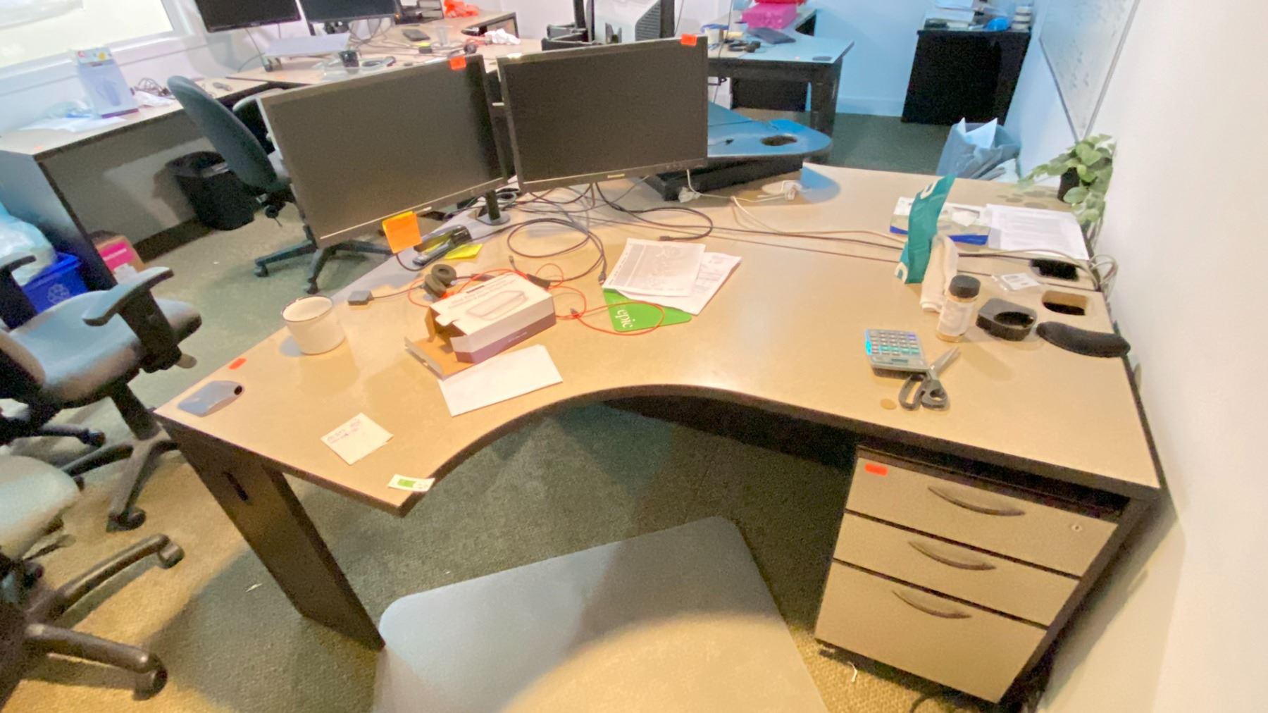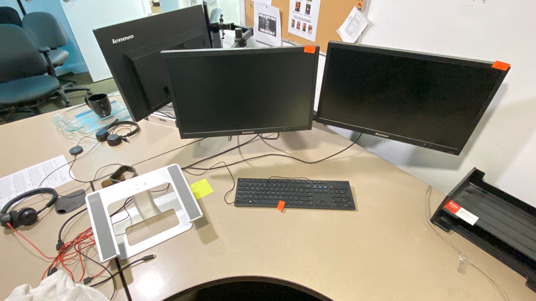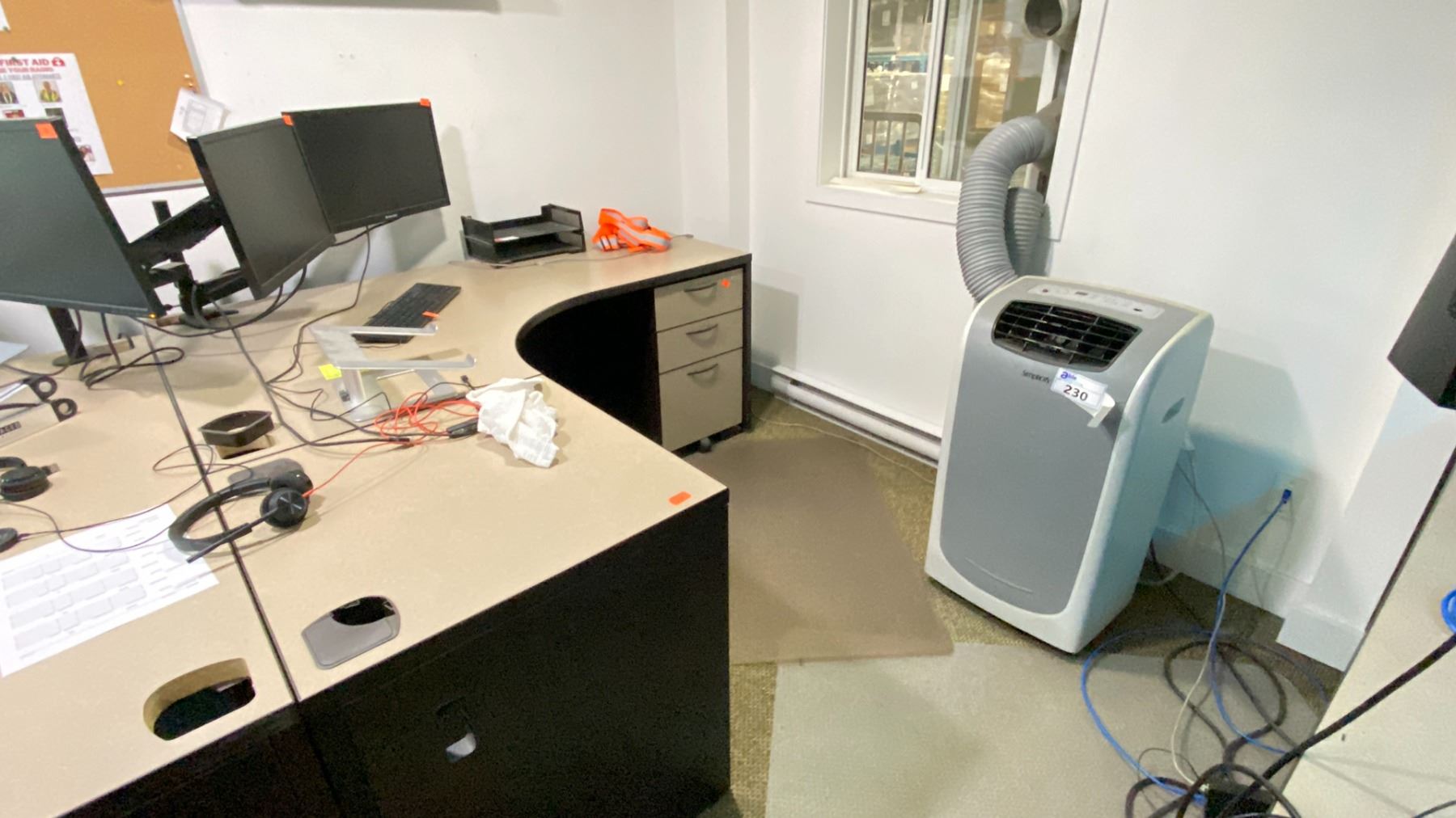 DESKS AND MONITORS IN OFFICE A 205. 60" DESK, 48" DESK, 4X 66" CORNER DESKS, MOBILE OFFICE CARTS, 24" RUN OFF, 10 MONITORS, COMPUTER RISERS, KEYBOARDS, MONITORS, 21", 21", 22", 24", 21",20" 24", 21", 21",20" ASST BRANDS, 5 OFFICE CHAIRS, HEADSETS NO OTHER CONTENTS