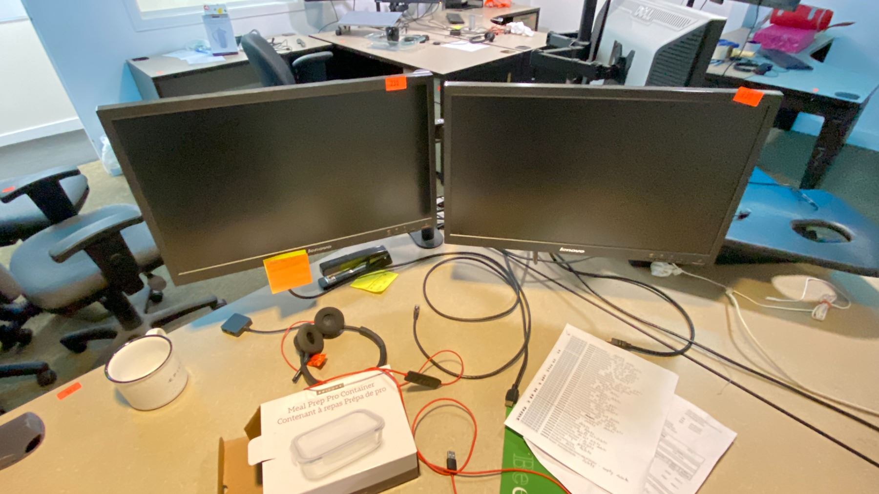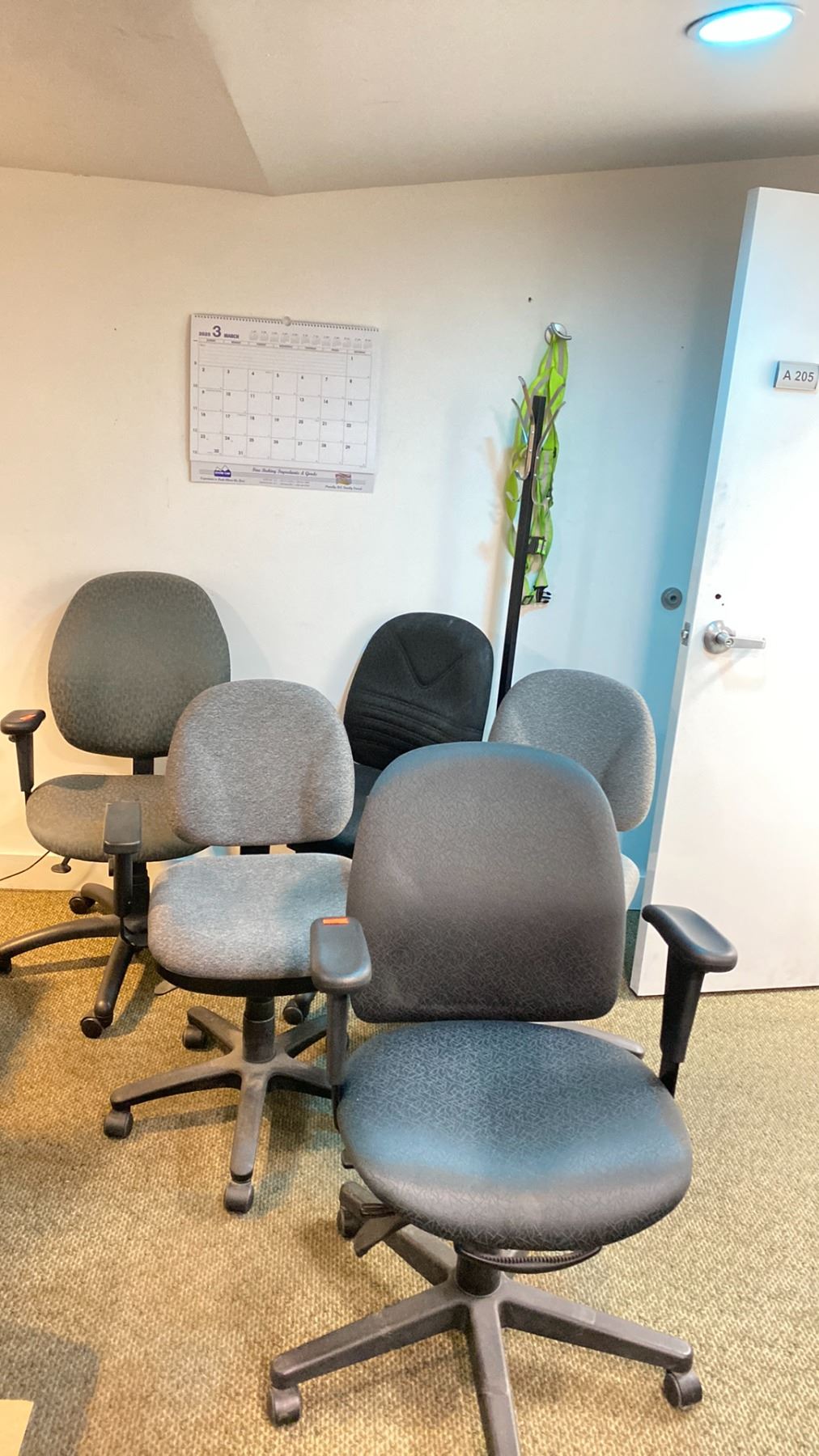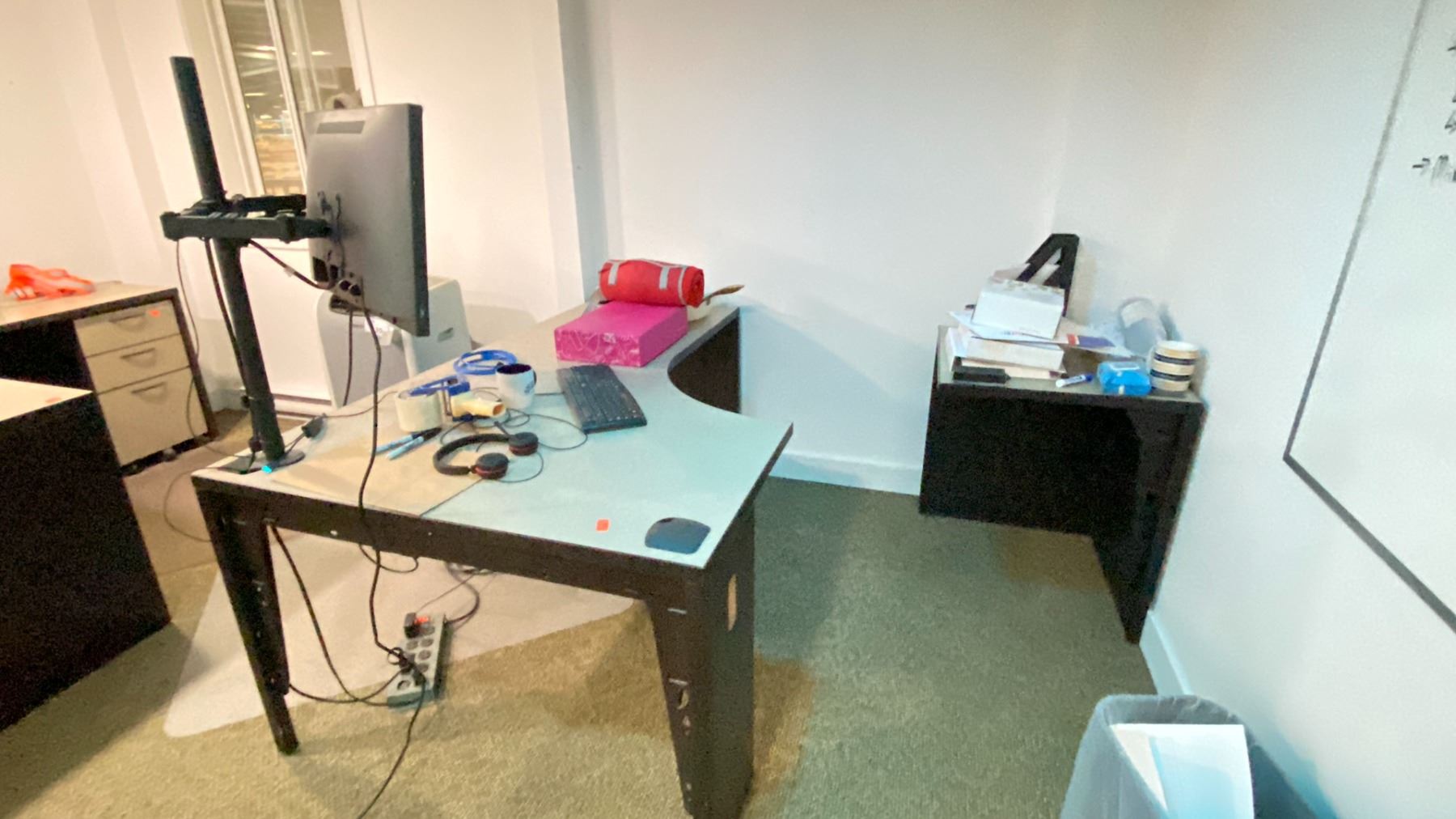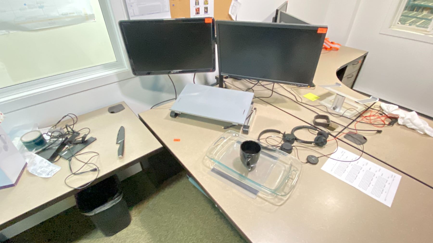 DESKS AND MONITORS IN OFFICE A 205. 60" DESK, 48" DESK, 4X 66" CORNER DESKS, MOBILE OFFICE CARTS, 24" RUN OFF, 10 MONITORS, COMPUTER RISERS, KEYBOARDS, MONITORS, 21", 21", 22", 24", 21",20" 24", 21", 21",20" ASST BRANDS, 5 OFFICE CHAIRS, HEADSETS NO OTHER CONTENTS