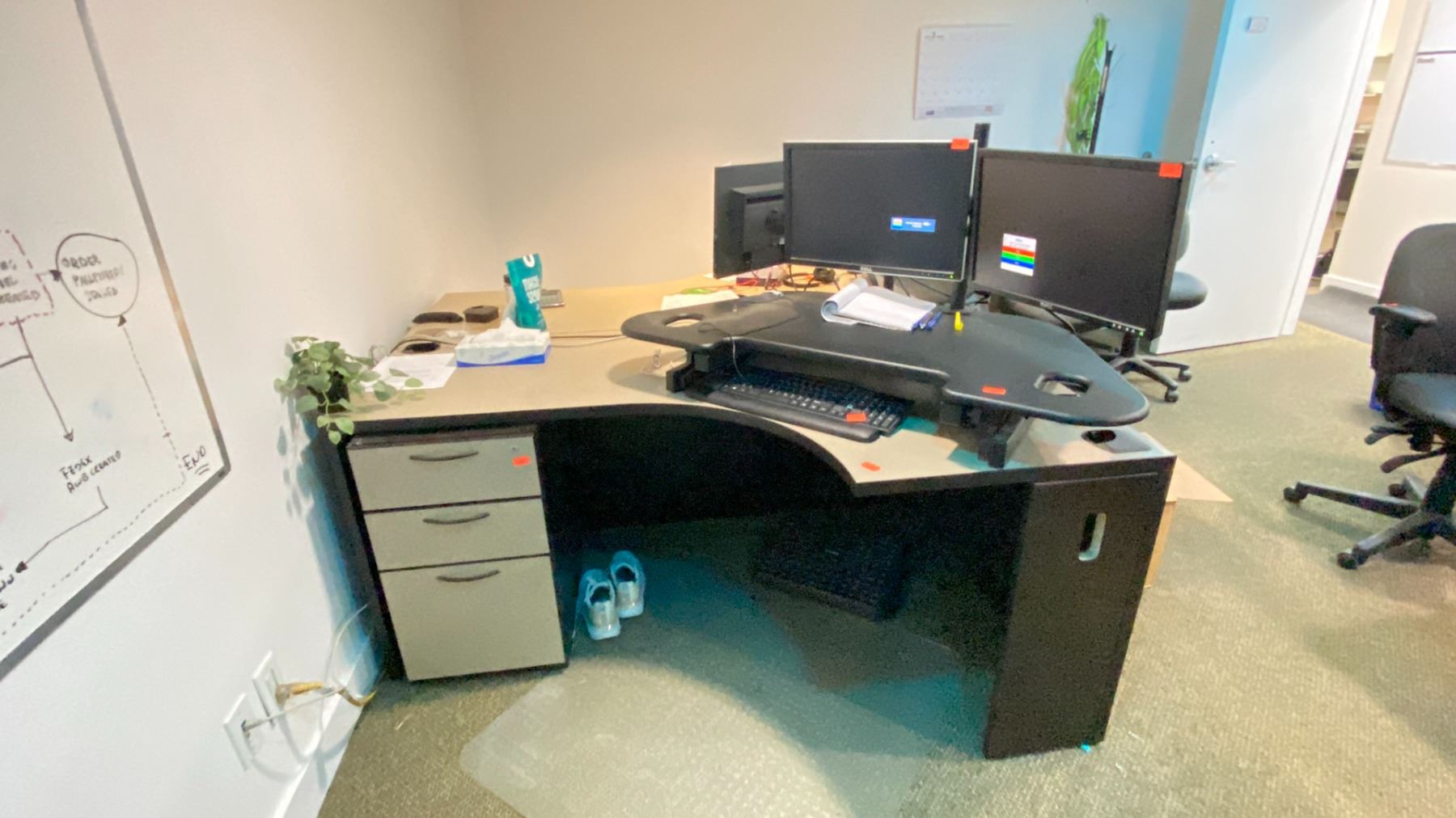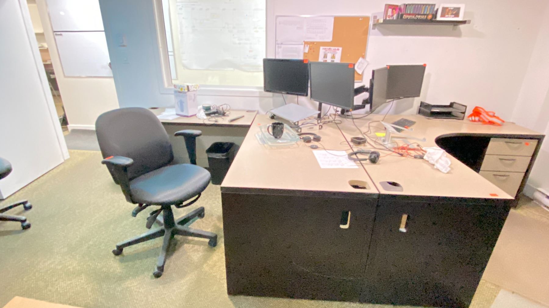 DESKS AND MONITORS IN OFFICE A 205. 60" DESK, 48" DESK, 4X 66" CORNER DESKS, MOBILE OFFICE CARTS,