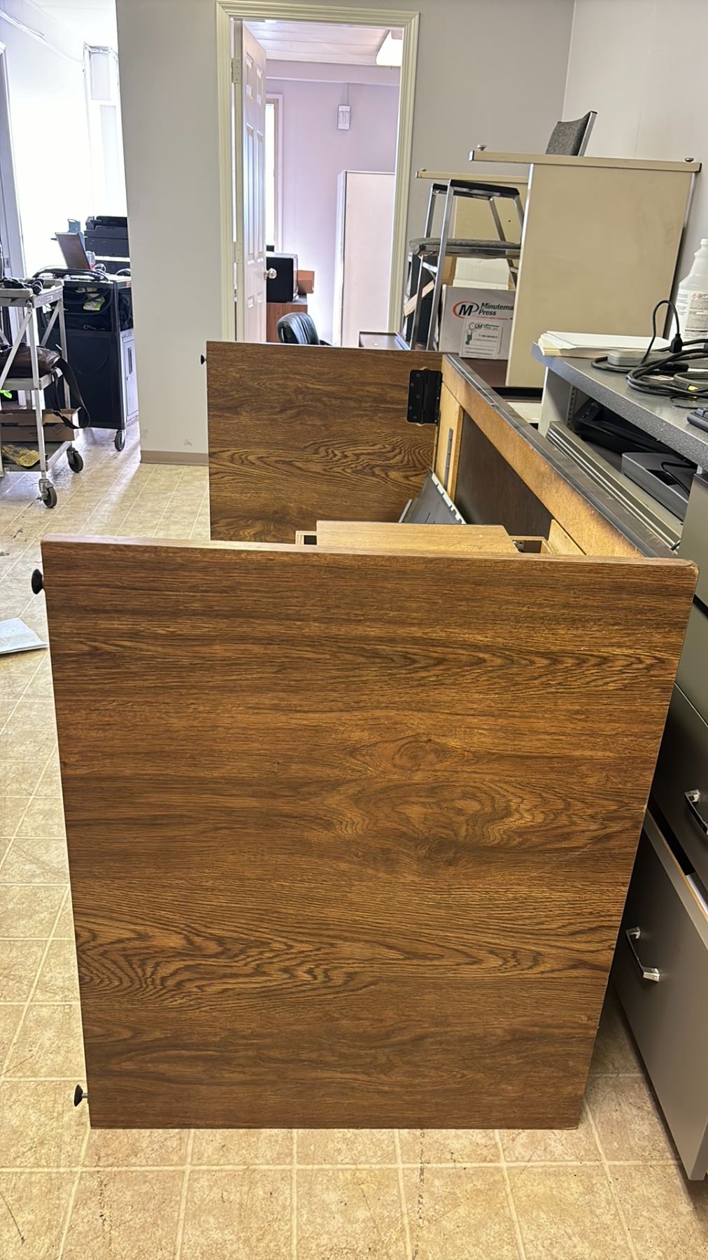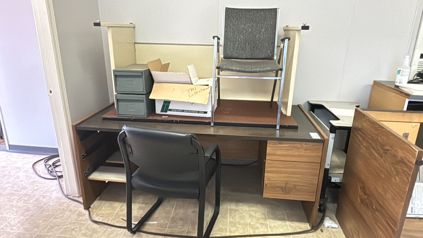 DESKS, CHAIRS, ROLLING PRINTER STAND, CORK BOARD, MEMO BOARDS & COAT RACK ** IN HALLWAY **