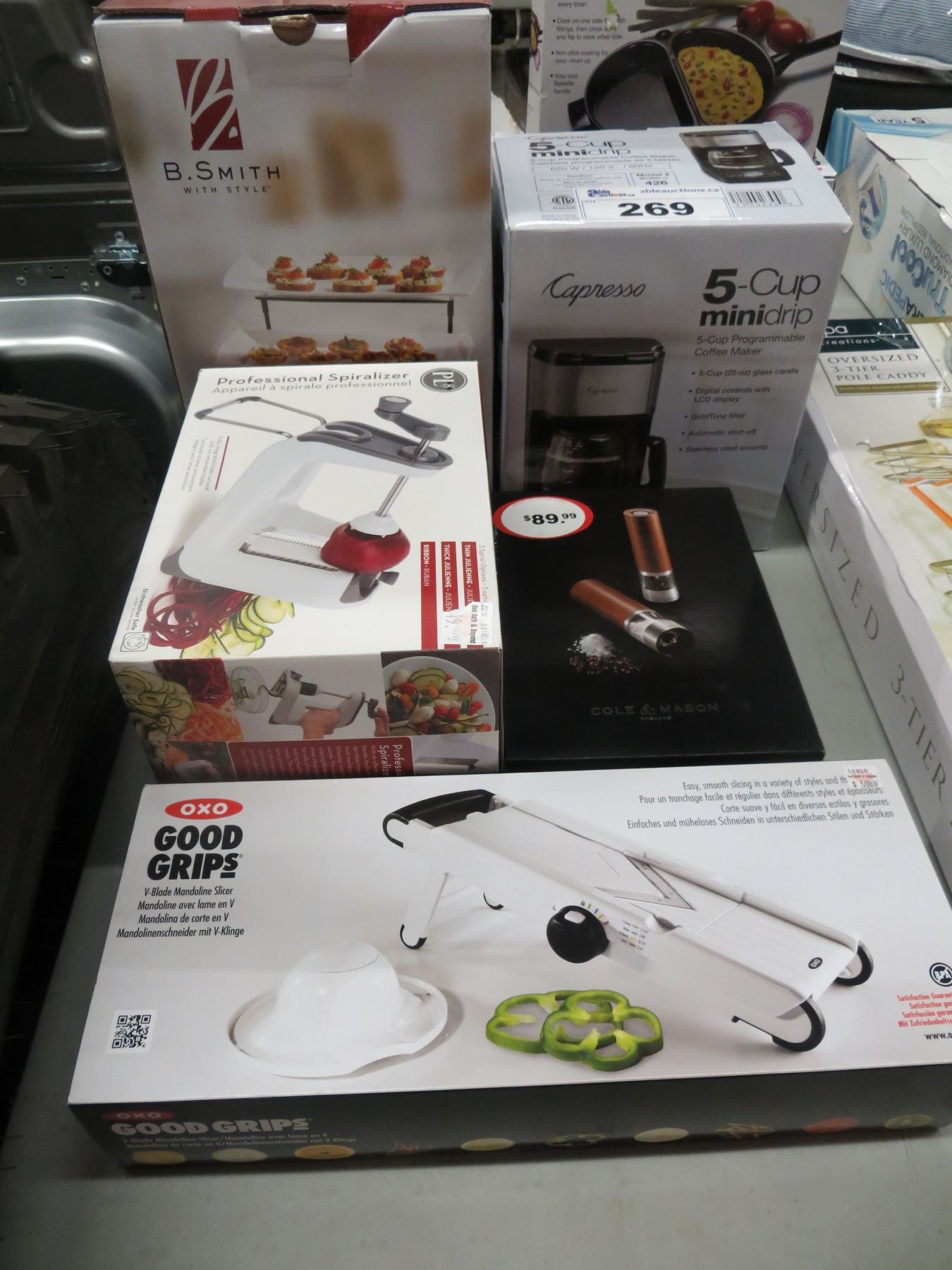 DESSERT RACK/5-CUP COFFEE MAKER/PEELER/COLE & MASON S&P GRINDERS/VEGGIE SLICER