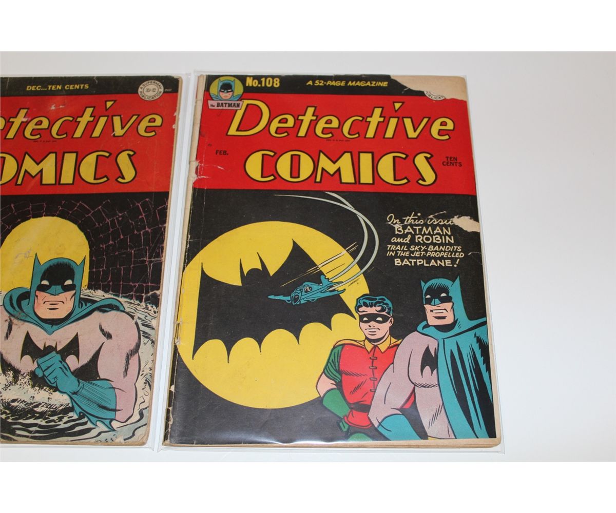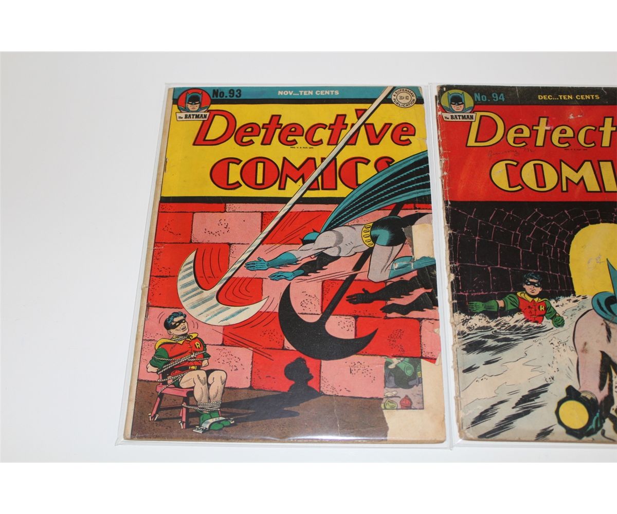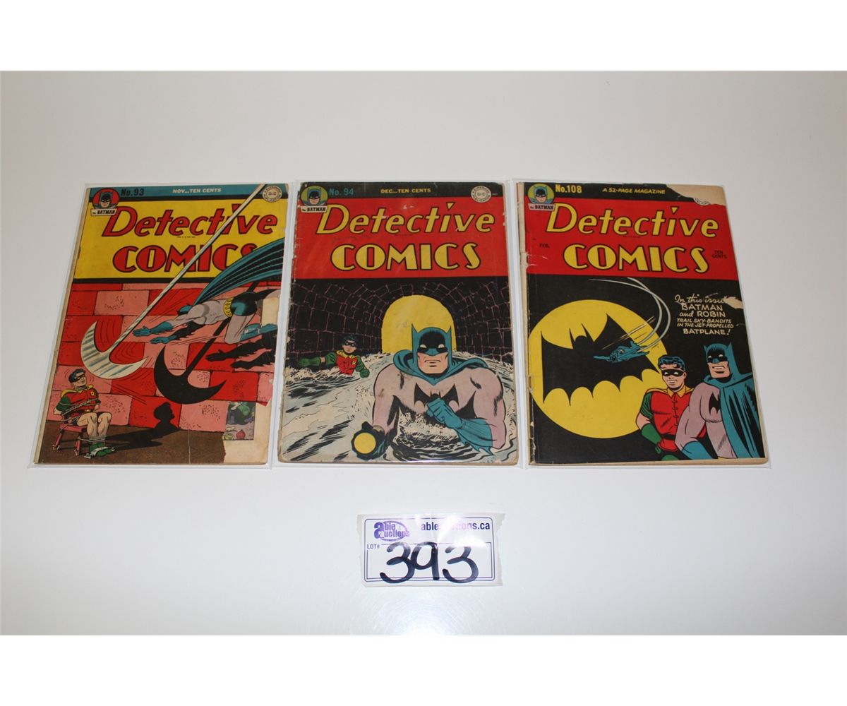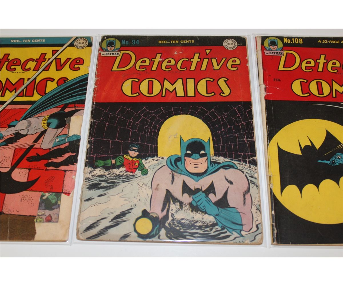 DETECTIVE COMICS GOLDEN AGE RUN #93, 94 &108 (1944-46) 1940'S CLASSICS. LOW GRADE BUT COMPLETE WITH COVERS & CF'S ATTACHED. SOME PIECES OUT OF COVERS & INTERIOR TEARS. SUPPLE & SOLID COPIES, NICE LOT.
