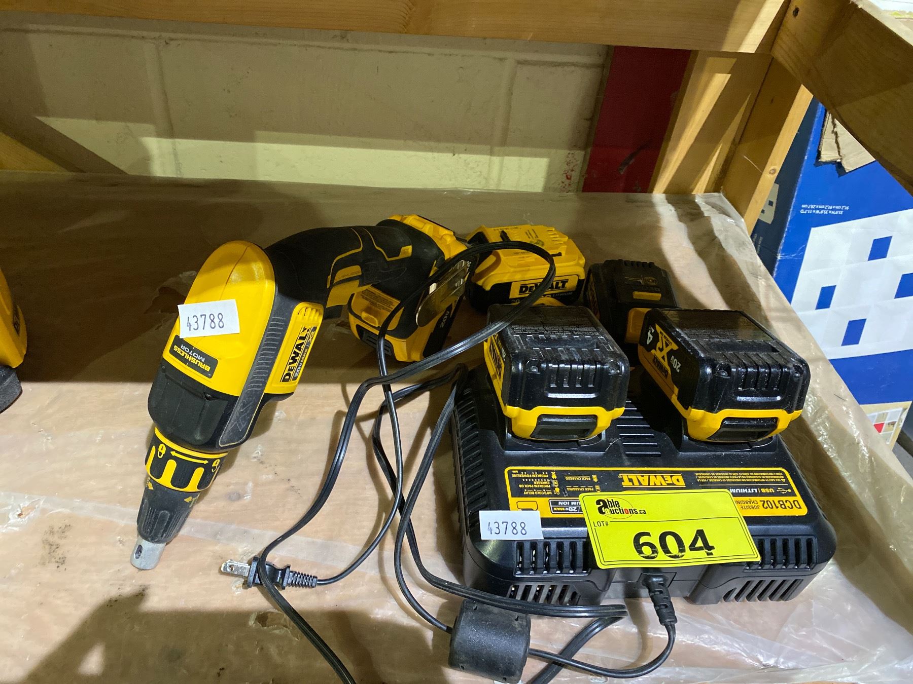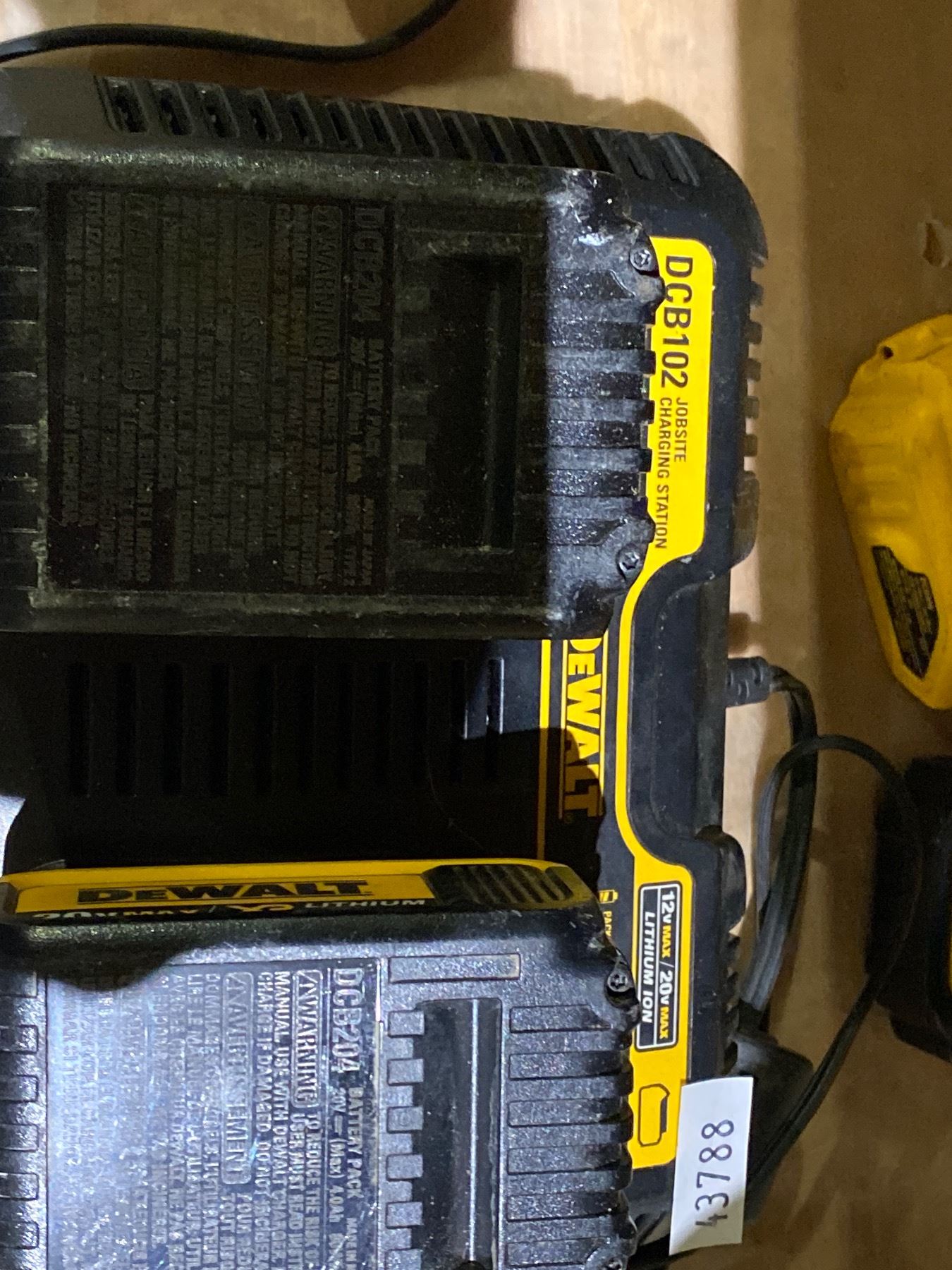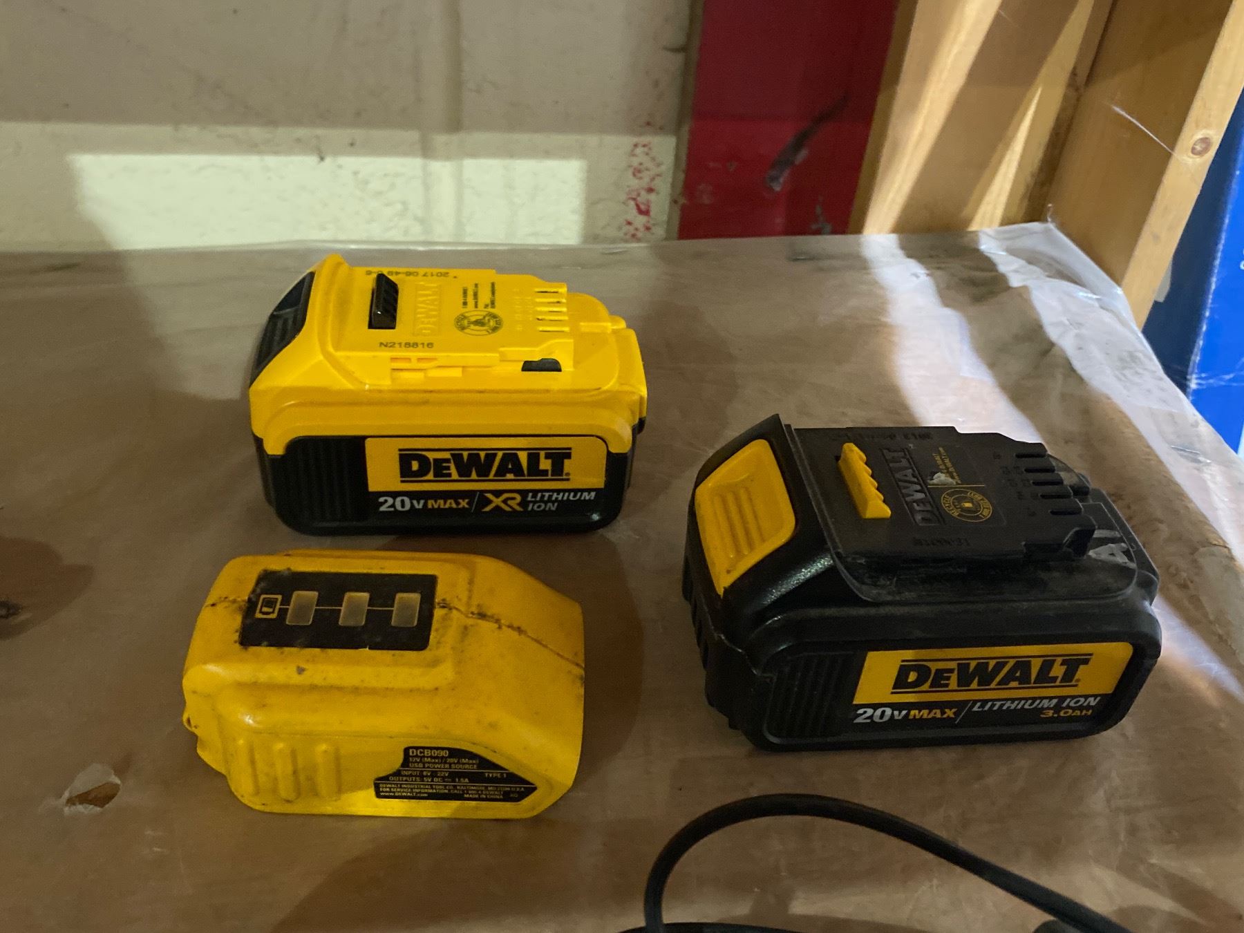DEWALT 20 VOLT CORDLESS DRILL AND 2 BAY BATTERY CHARGER WITH 5 ASSORTED BATTERIES