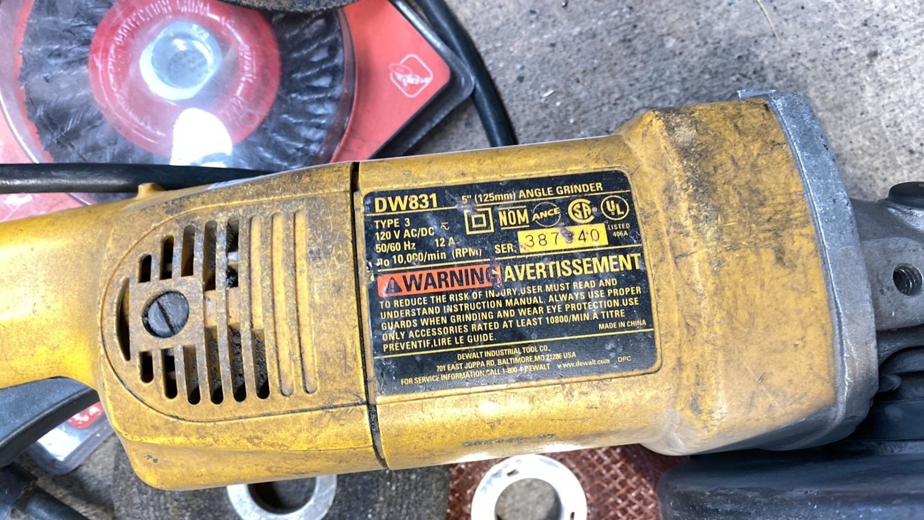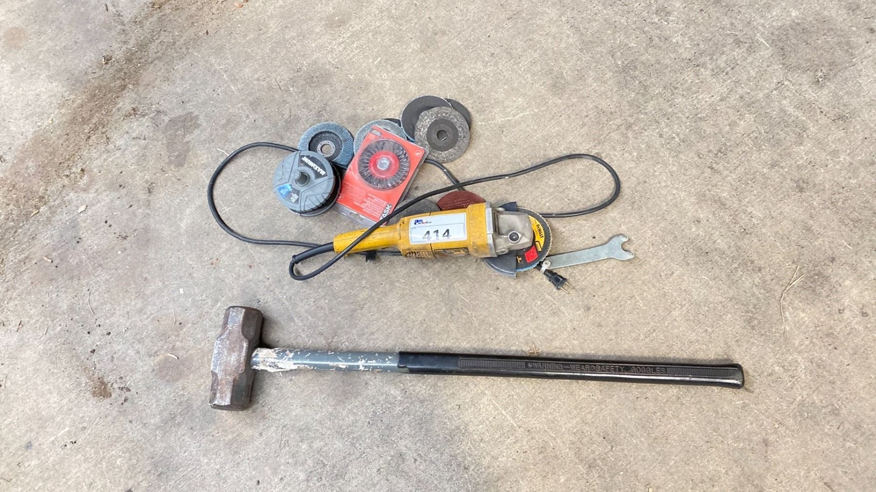 DEWALT 5" ANGLE GRINDER DW831 WITH AN ASST OF BLADES AND LARGE SLEDGE HAMMER