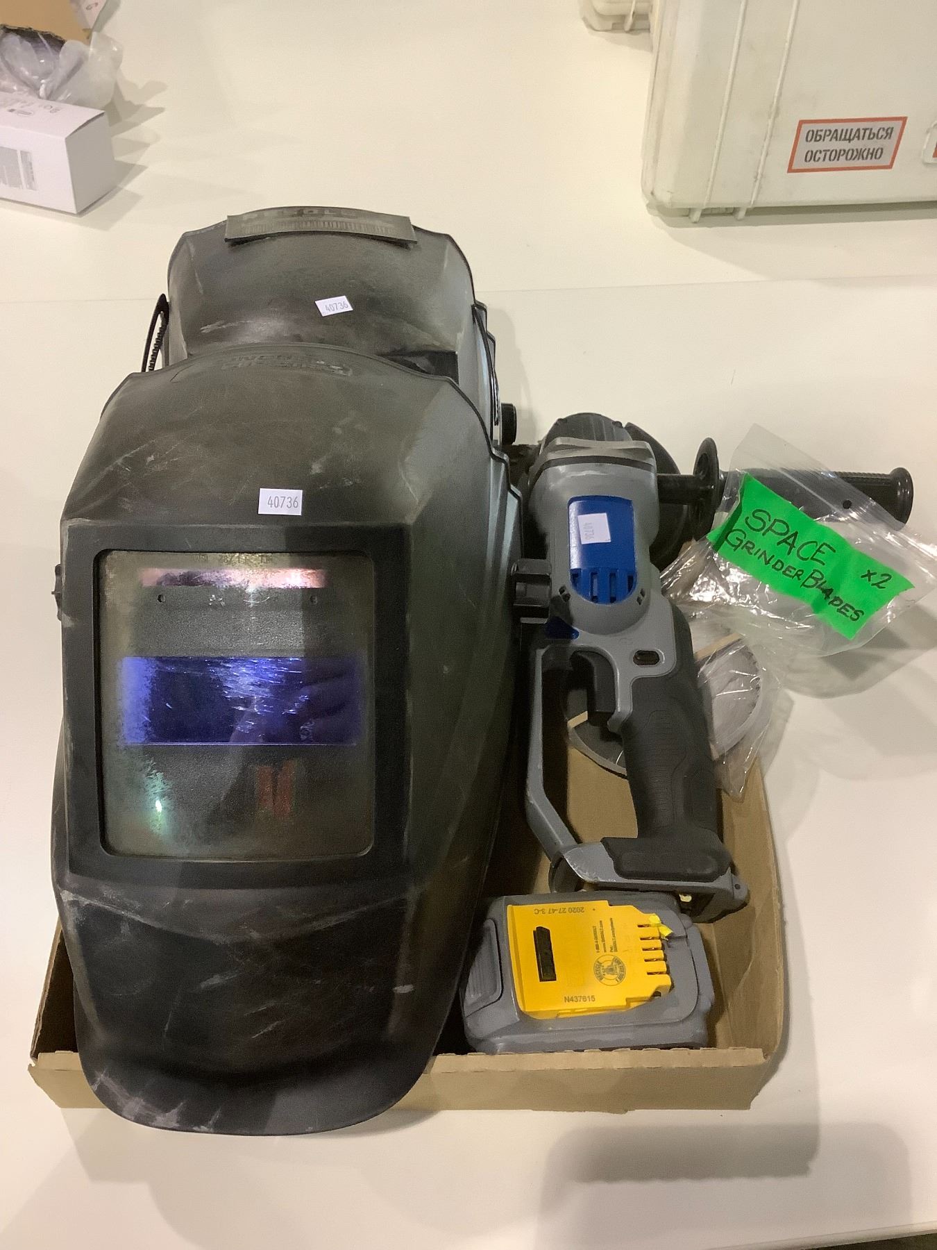 DEWALT GRINDER WITH BATTERY, GRINDER BLADES, & 2 WELDING HELMETS