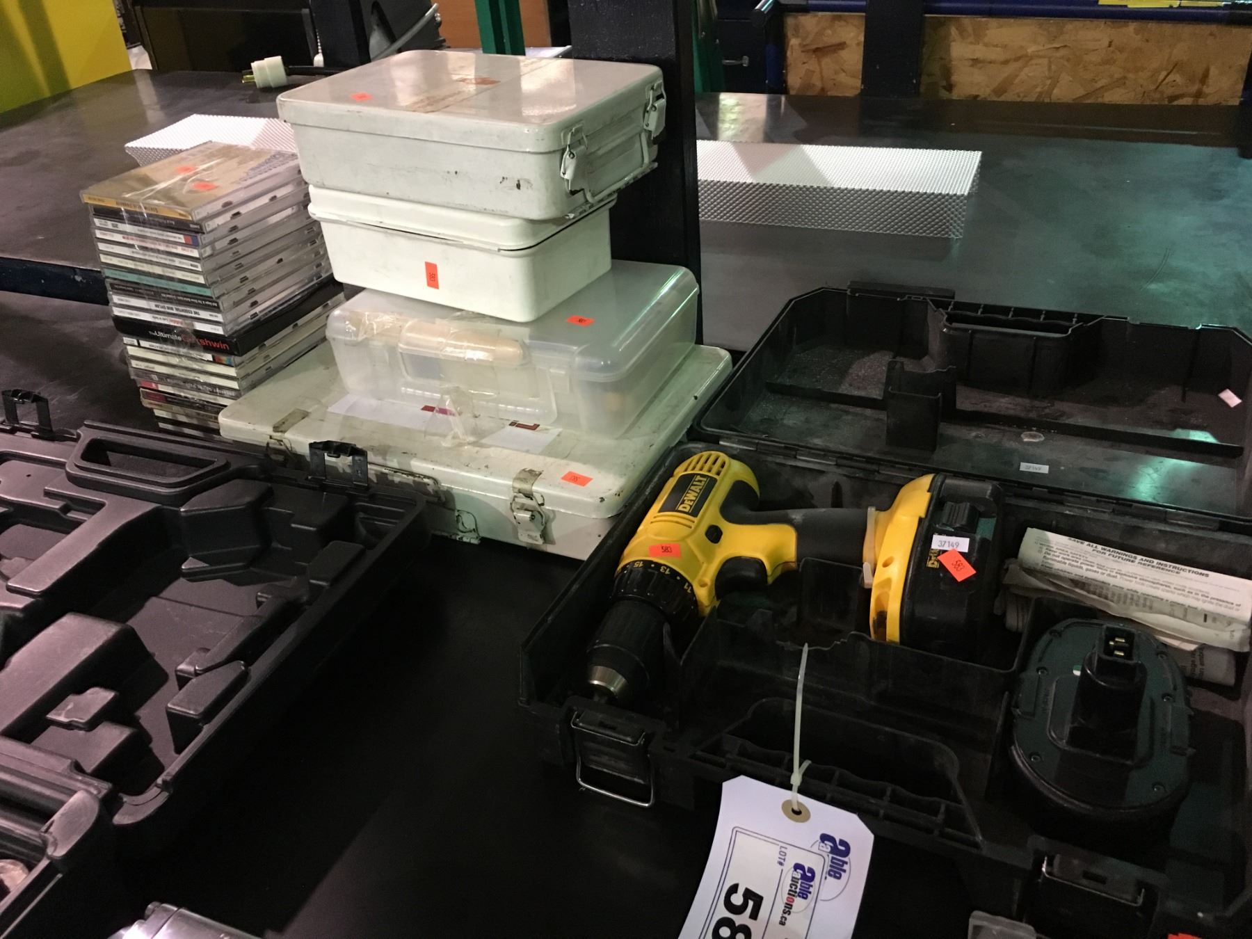 DEWALT MODEL DC759 1/2" VSR CORDLESS DRILL/DRIVER WITH BATTERY, FIRST AID KITS & ASSORTED MUSIC CDS