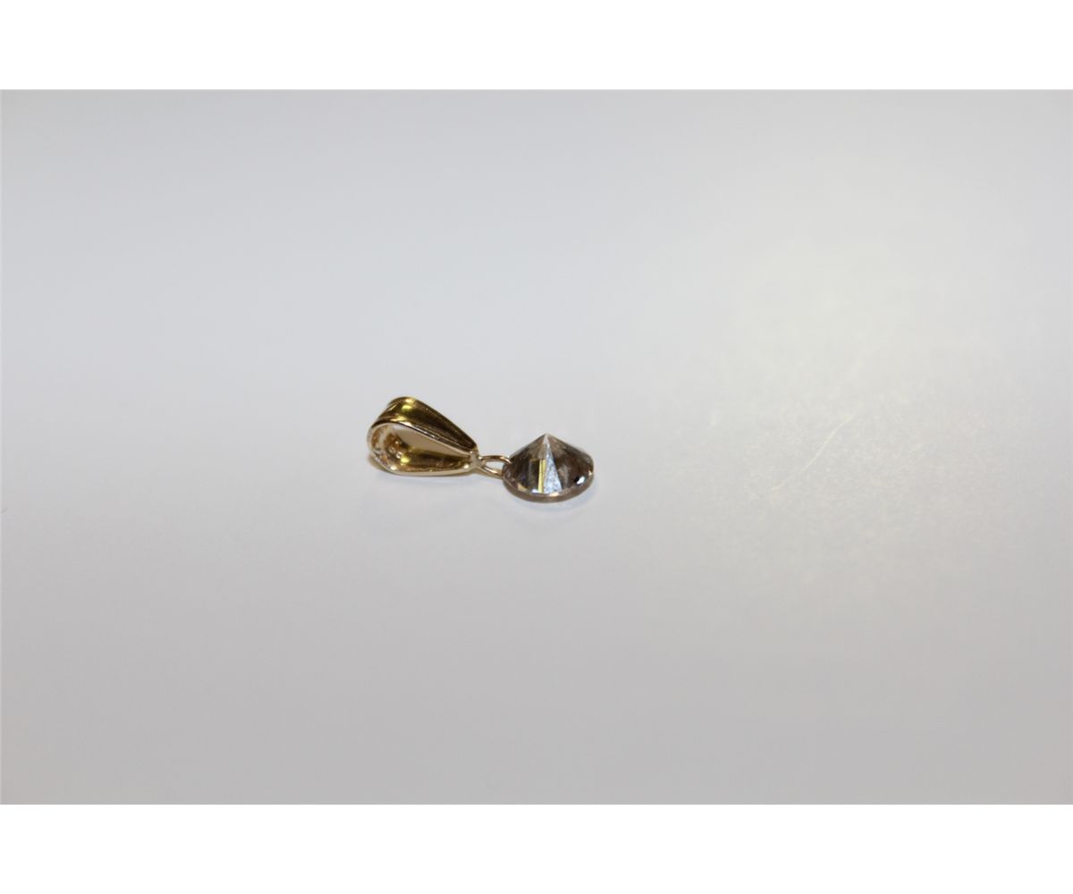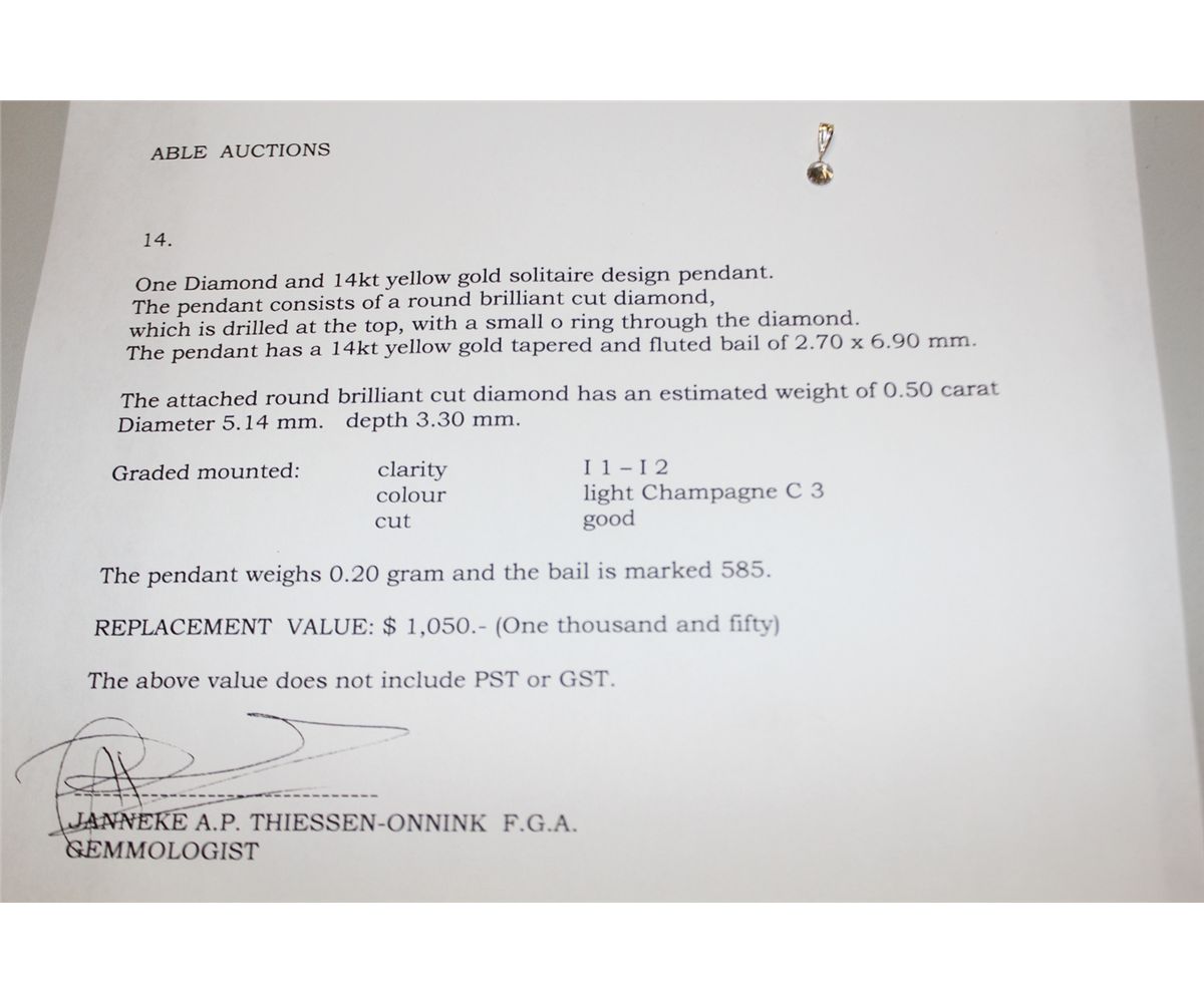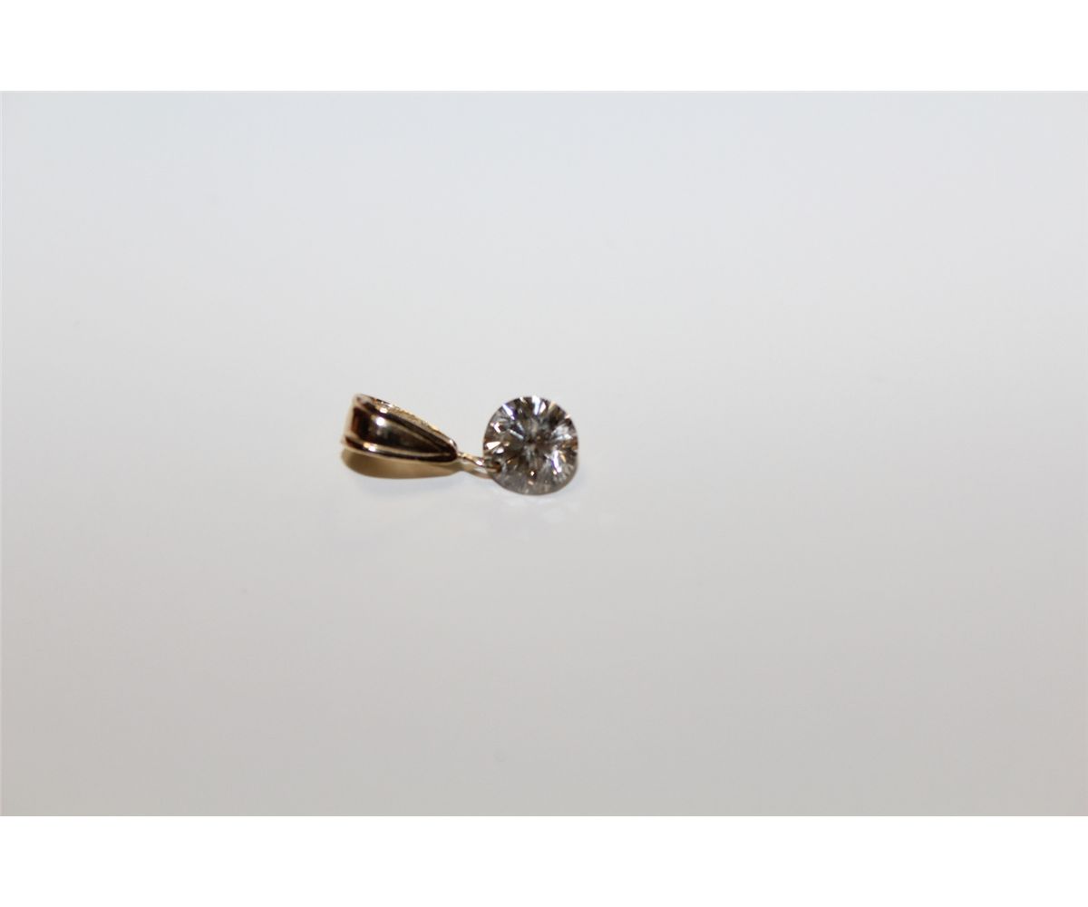 DIAMOND & 14KT. YELLOW GOLD SOLITAIRE DESIGN PENDANT. THE ATTACHED ROUND BRILLIANT CUT DIAMOND HAS AN EST. WEIGHT OF 0.50 CARATS. REPLACEMENT VALUE: $1050.00