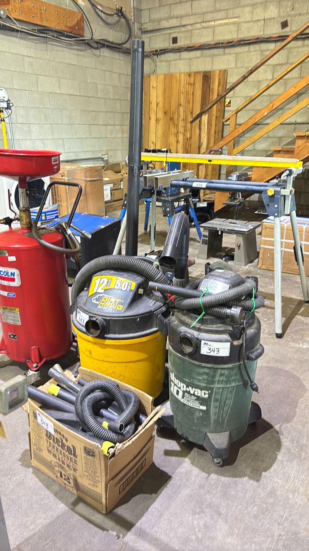 DIRT HAWG 12 GALLON WET/DRY SHOP VACUUM WITH HOSE, A SHOP VAC 10 GALLON WET/DRY VACUUM WITH HOSE & A BOX OF EXTRA HOSE + ATTACHMENTS