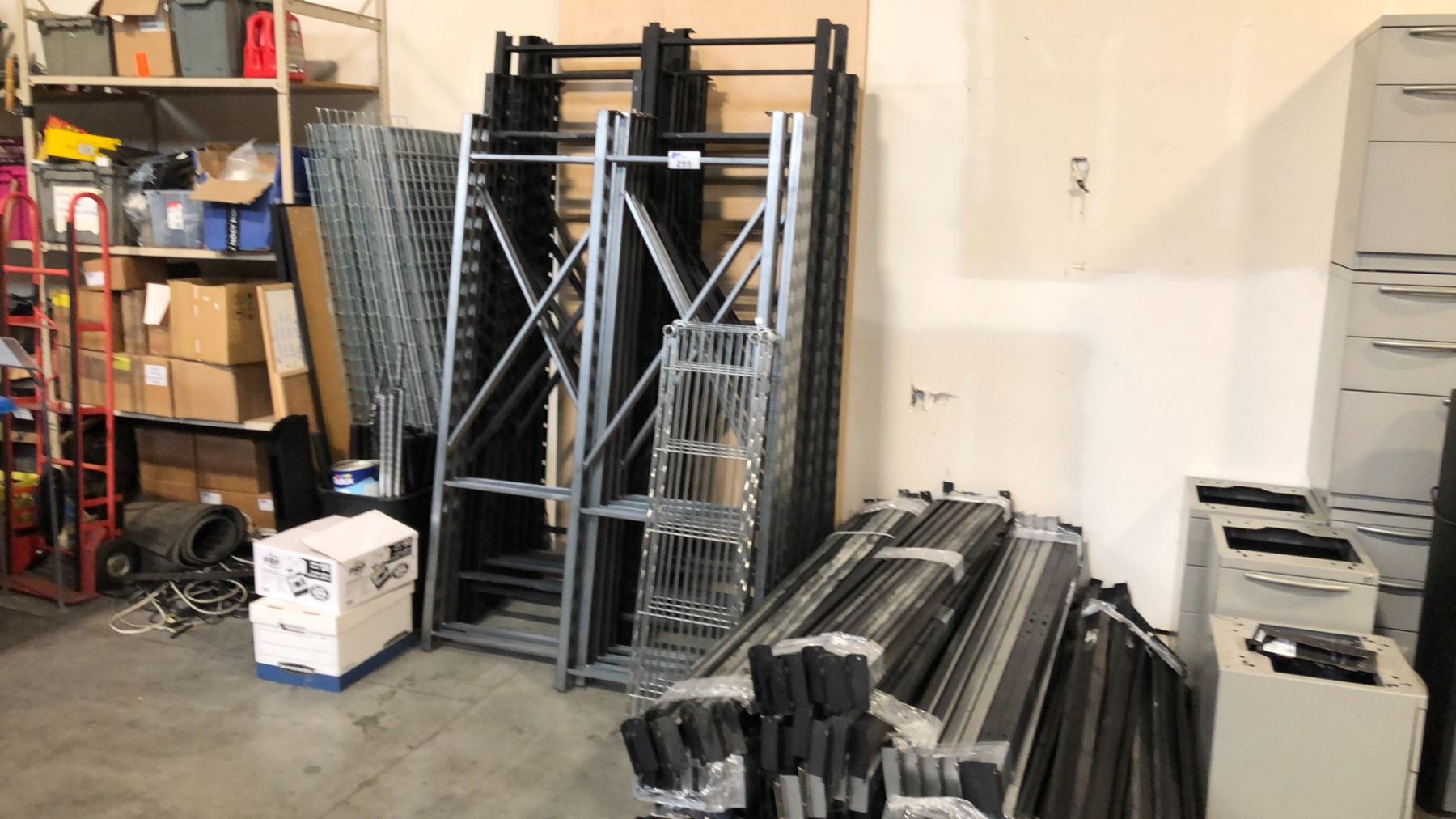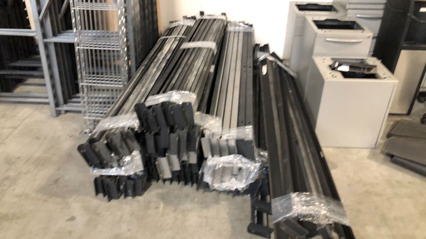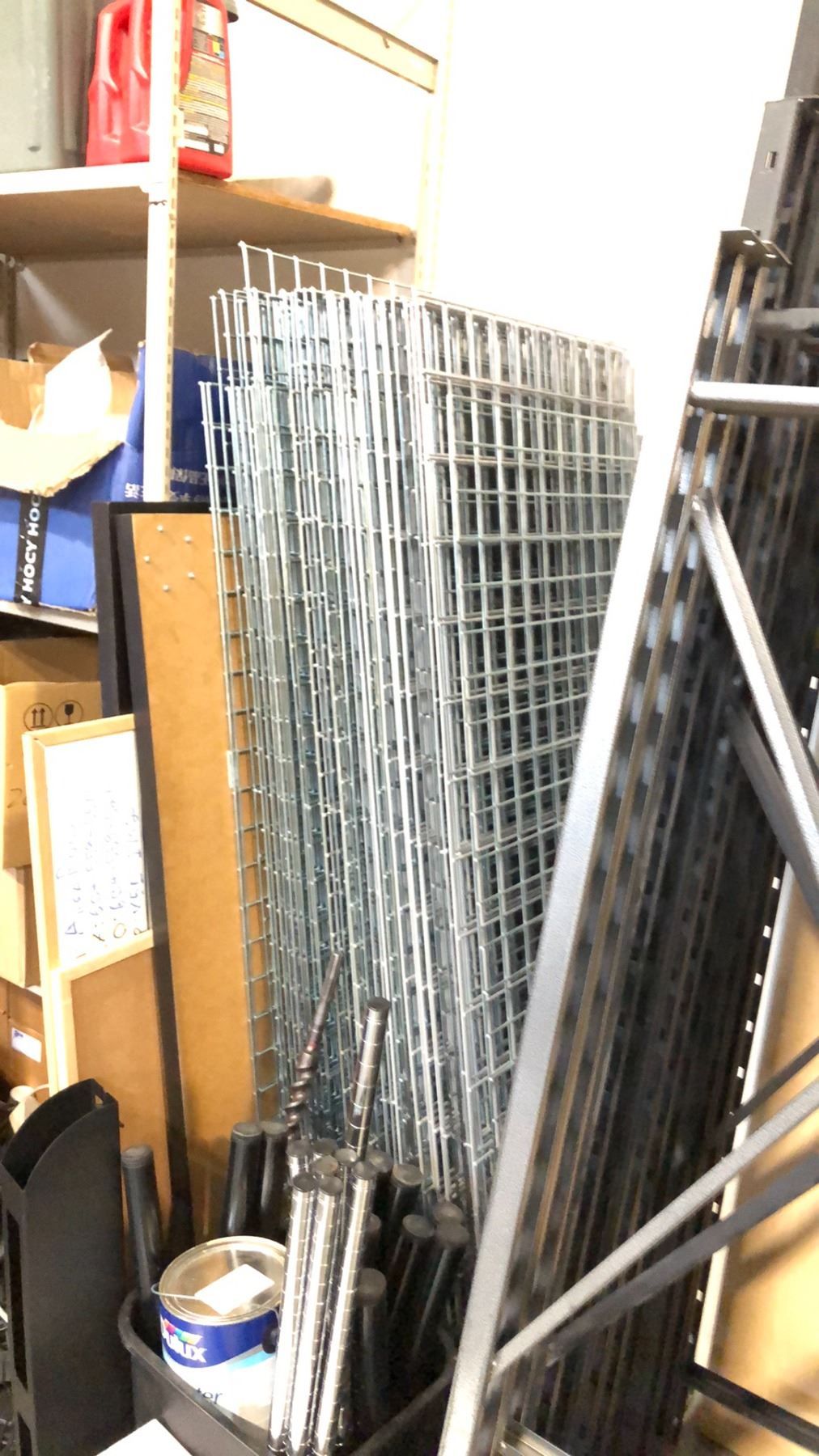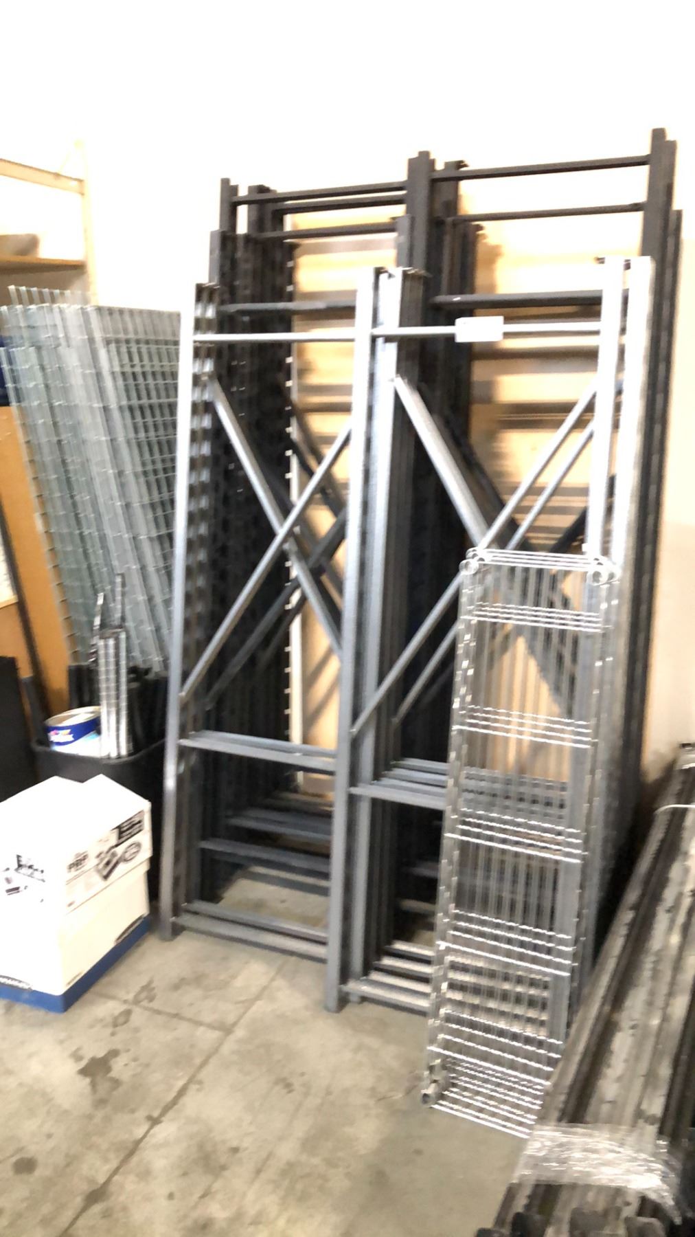 DISASSEMBLED COMMERCIAL RACKING UNITS W/ WIRE SHELVES, METRO STYLE SHELVES AND 2 TABLES