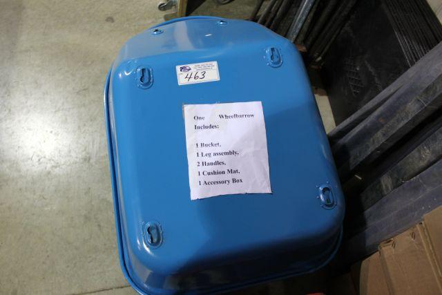 DISASSEMBLED NEW WHEELBARROW INCLUDES: 1 BUCKET - 1 LEG ASSEMBLY - 2 HANDLES - 1 CUSHION MAT - 1 ACCESSORY BOX