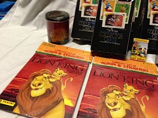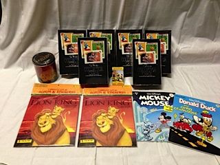 DISNEY COLLECTOR LOT INC. DONALD DUCK AND MICKEY MOUSE COMICS -  5 FACTORY SEALED BOXES OF TRADING CARDS -  PACK OF DISNEY DESFILE TRADING CARDS -  2 FACTORY SEALED LION KING STICKER ALBUM SETS AND A TIN OF LION KING TRADING CARDS.