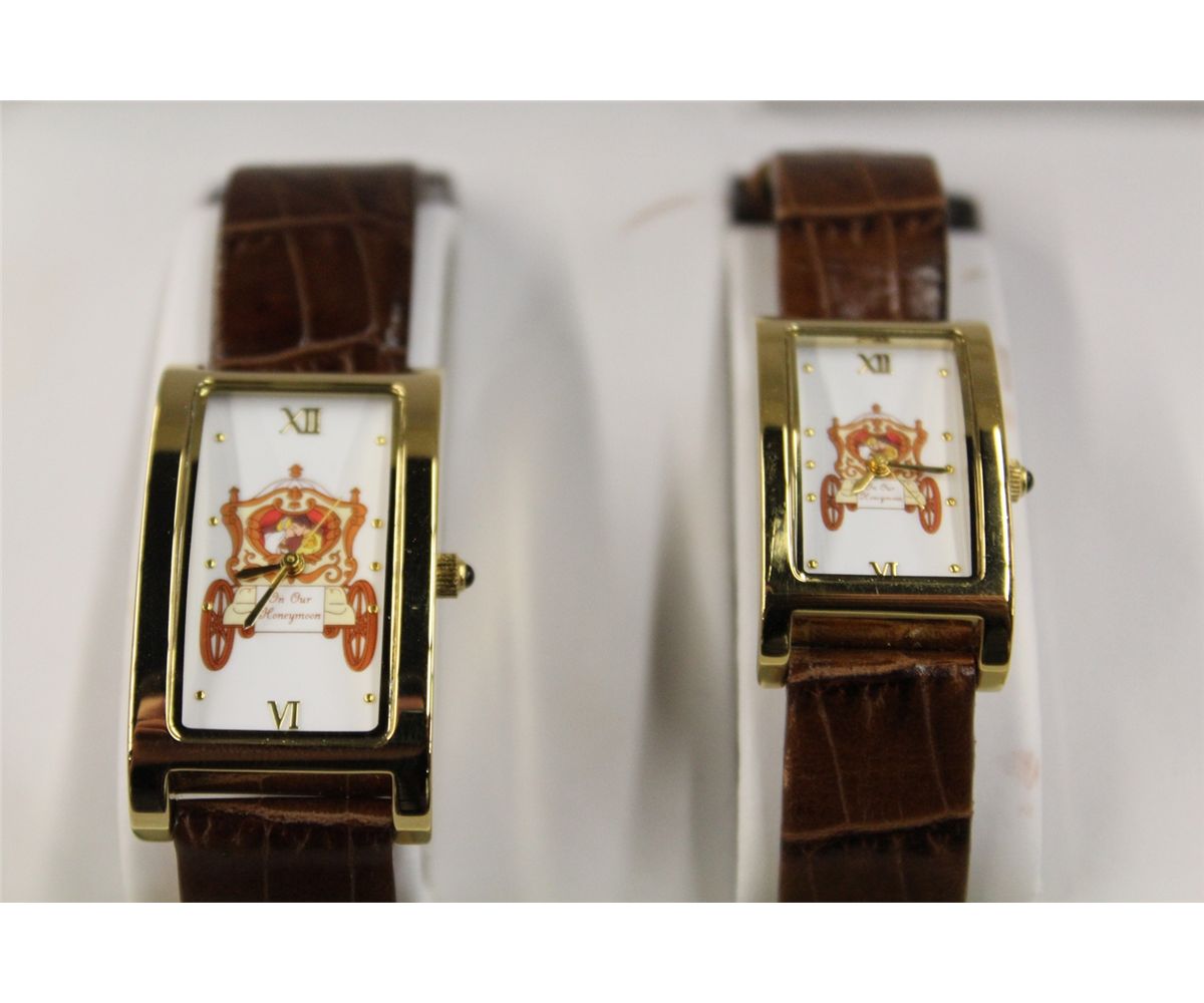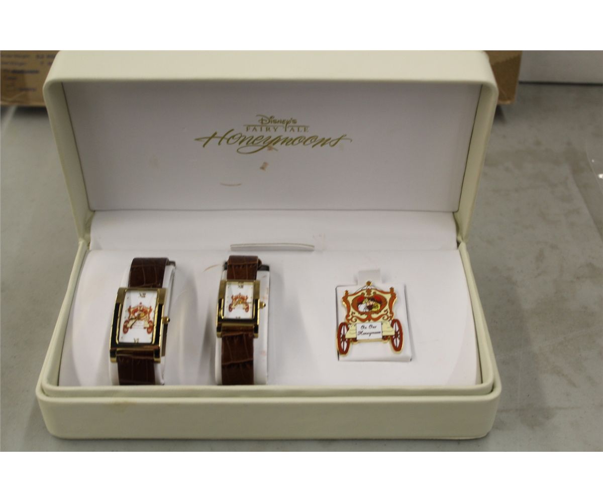 DISNEY HONEYMOON BOXED WATCH SET WITH HONEYMOON PIN. THIS WAS A GIFT GIVEN TO HONEYMOONERS AT DISNEYLAND AND NOT OFFERED FOR SALE