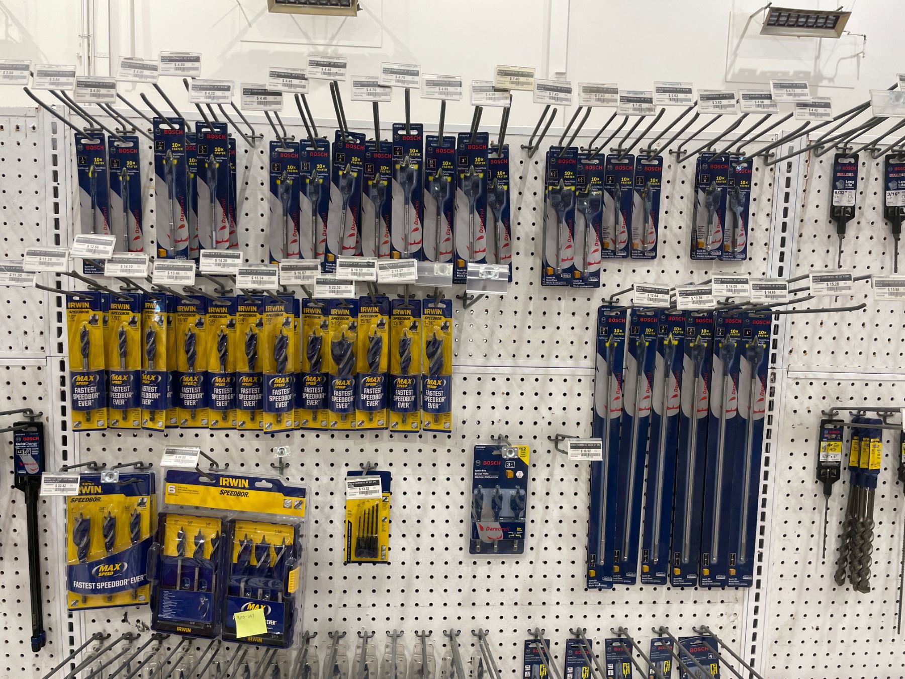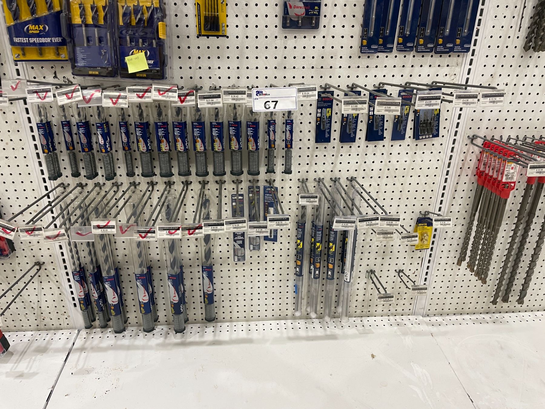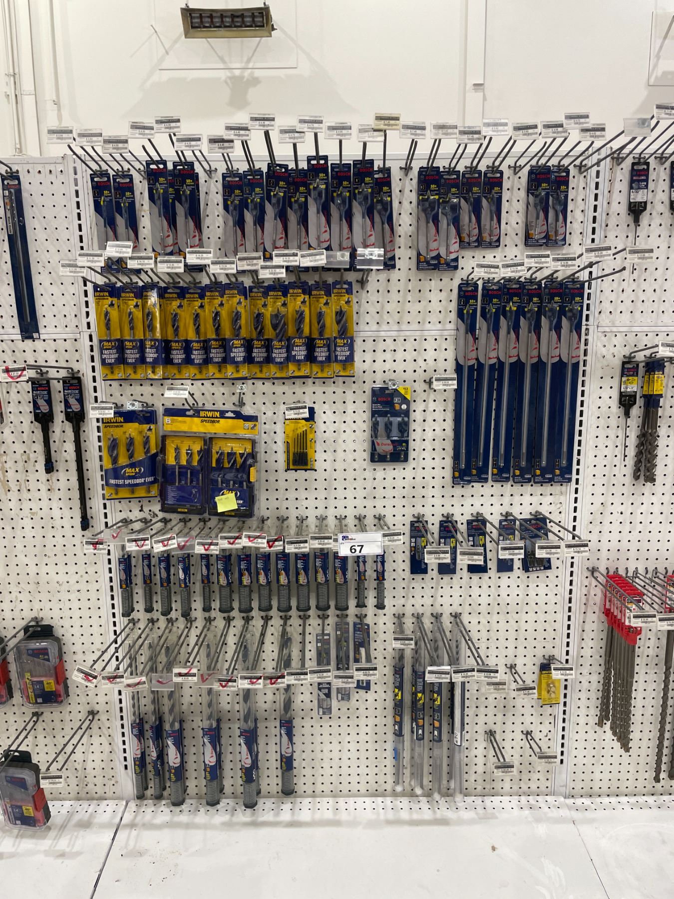 DISPLAY OF ASSORTED IRWIN BORING BITS, BOSCH WOOD BITS, & EXTENSION DRILL BITS