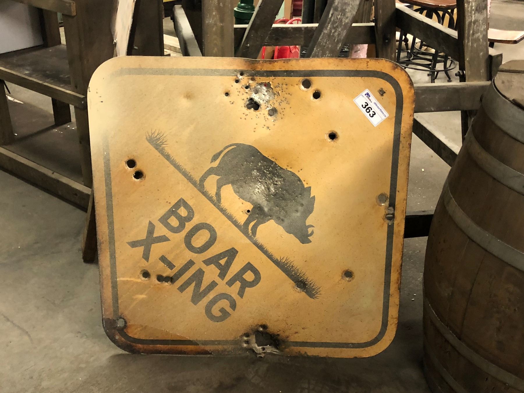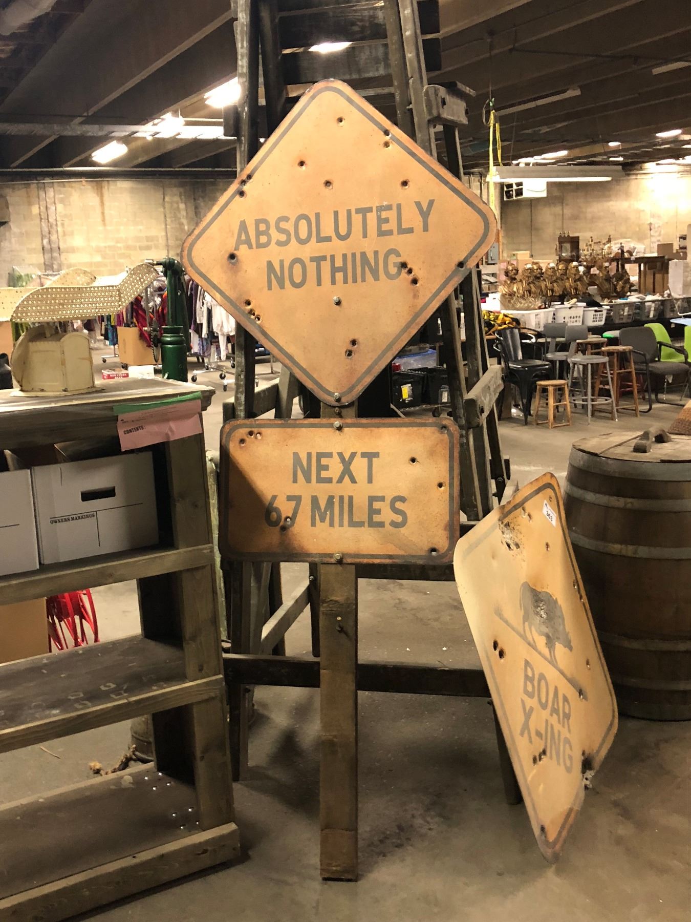 DISTRESSED METAL BOAR CROSSING SIGN & NOTHING FOR 67 MILES SIGN