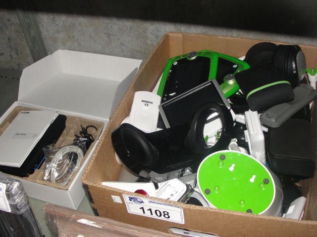 DLINK ROUTER AND A BOX OF ASSORTED ELECTRONICS; LEAP PAD, GARMIN NUVI GPS, ETC