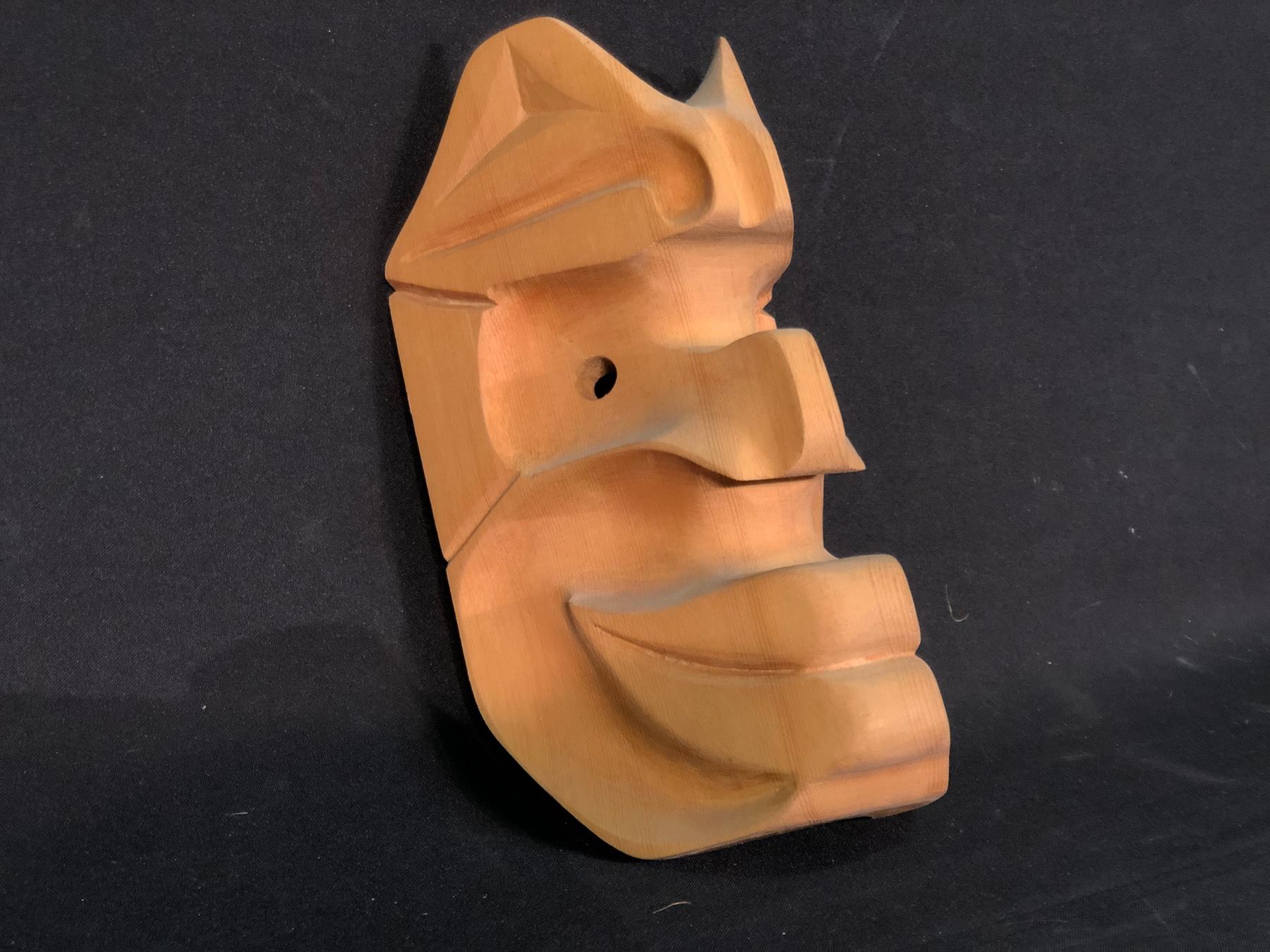 DORMAN, OF KWAGIUTL FIRST NATION, R. BELL VILLAGE ISLAND, BC, "BOOKWUS" HAND CARVED MASK, 10'' T X 5'' W, SIGNED ON BACK BY ARTIST